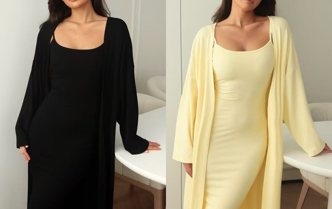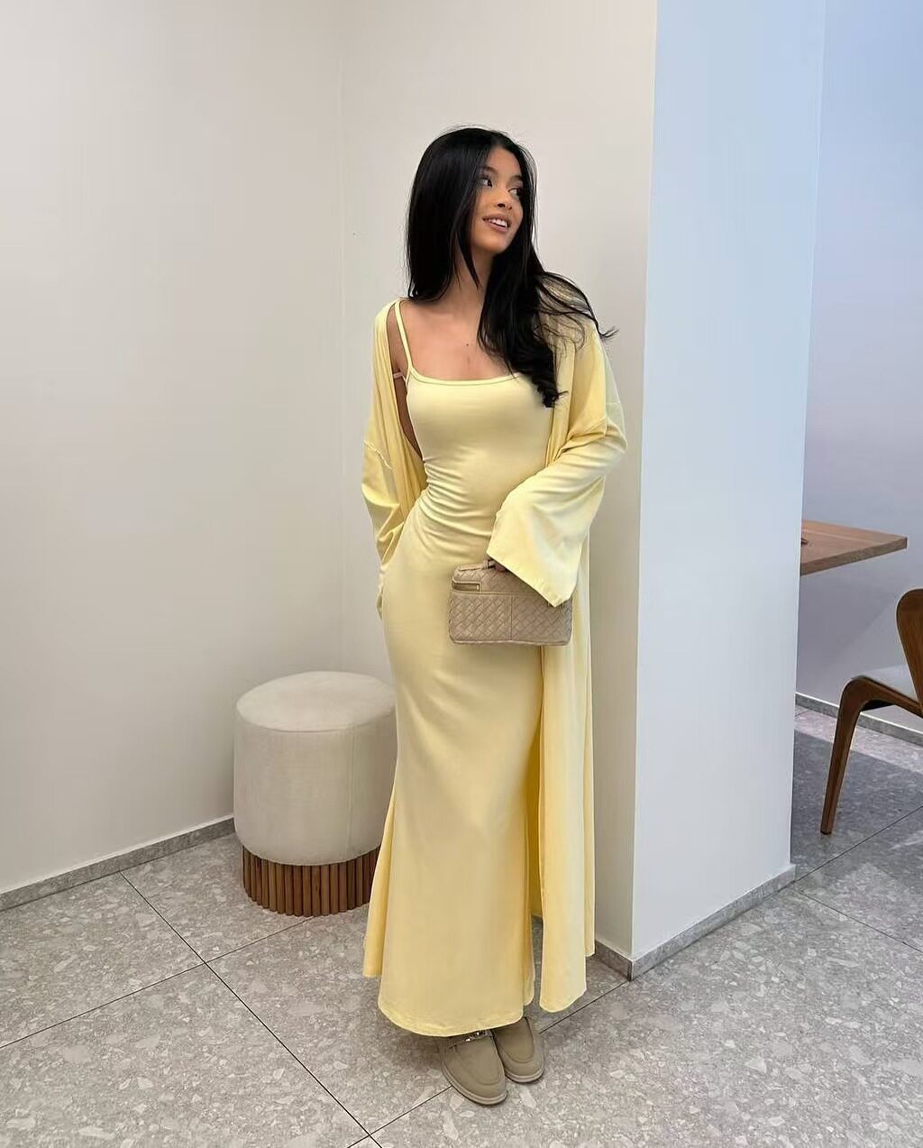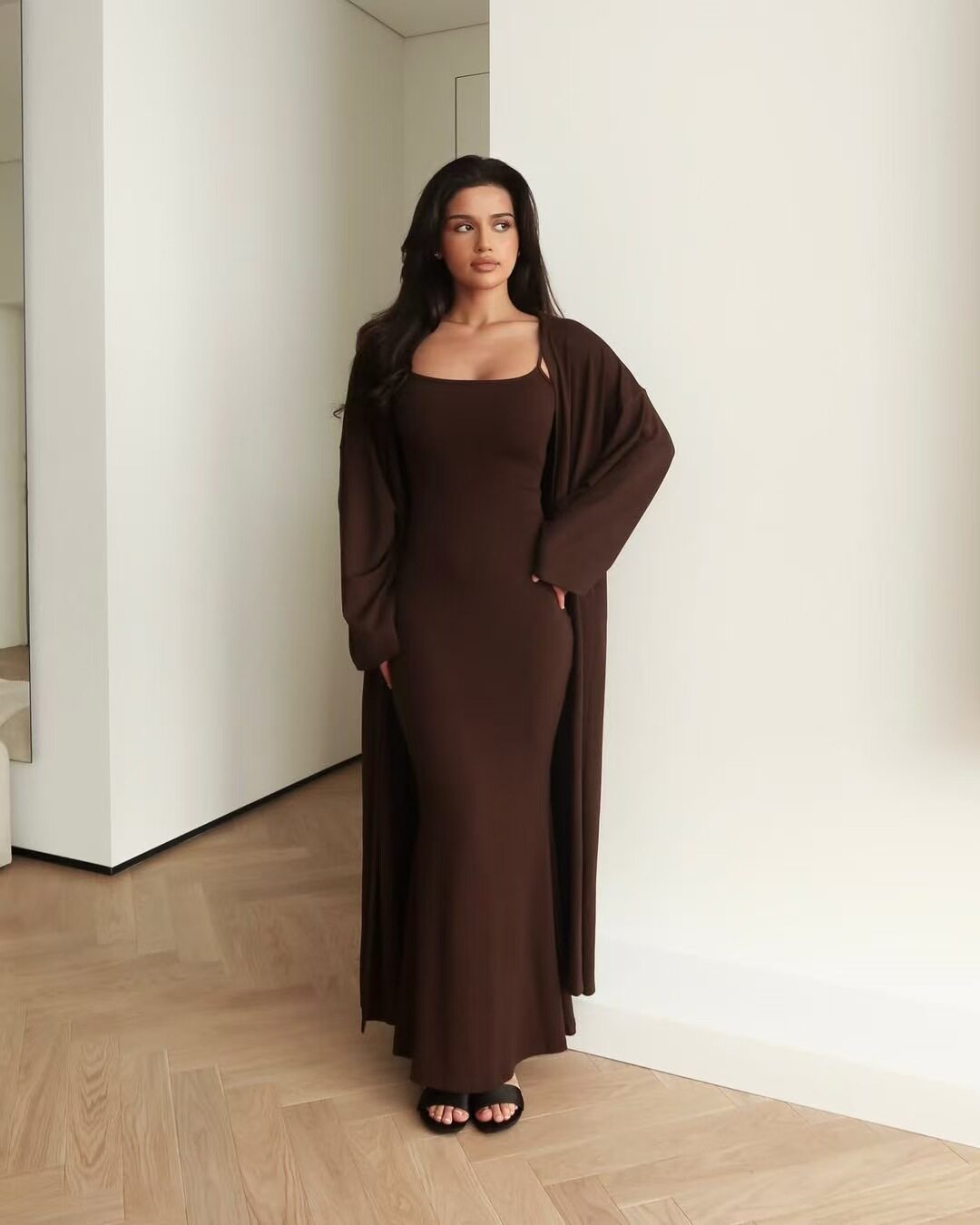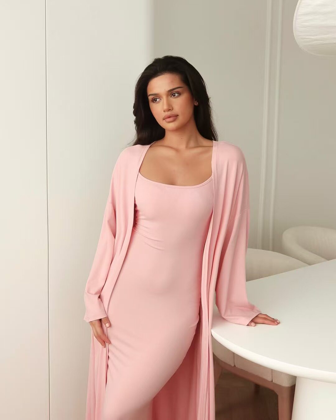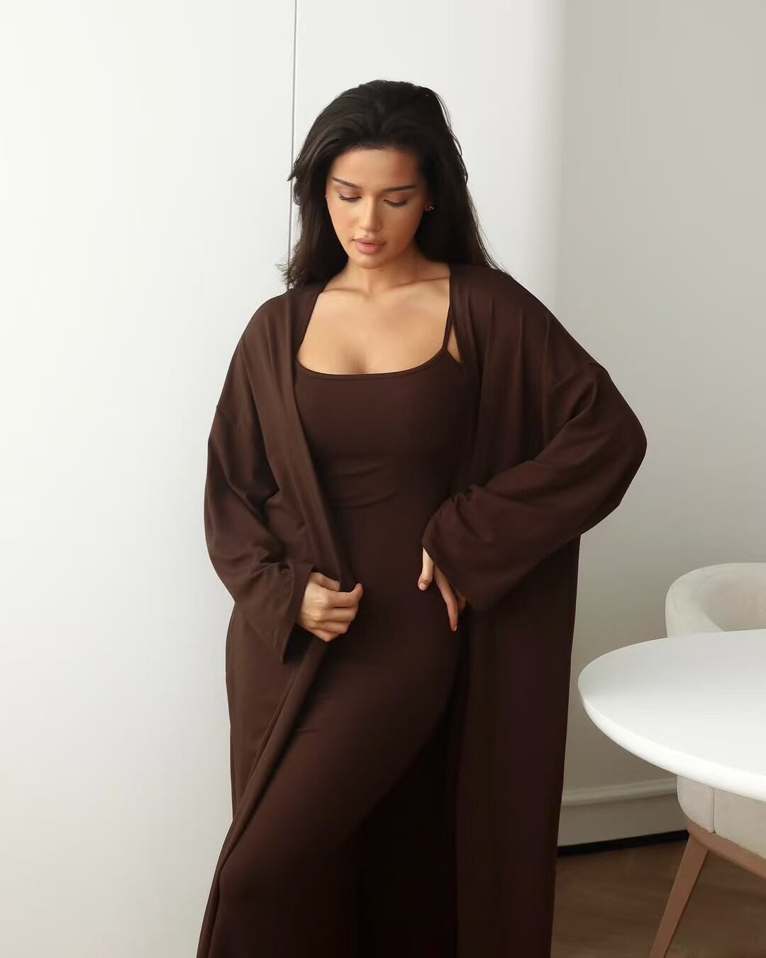 European and American Style New Solid Color Long-Sleeved Cardigan Jacket and Suspender Dress Two-Piece Set Robe and Dress Set