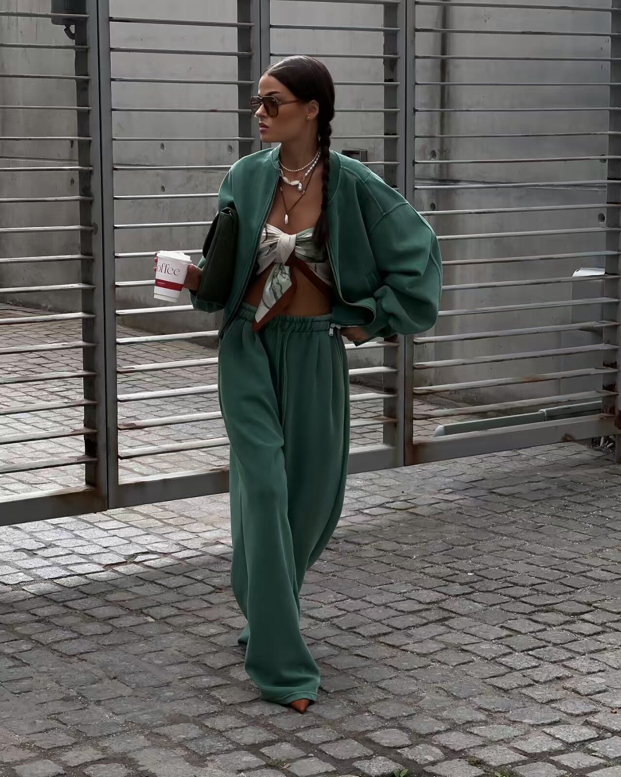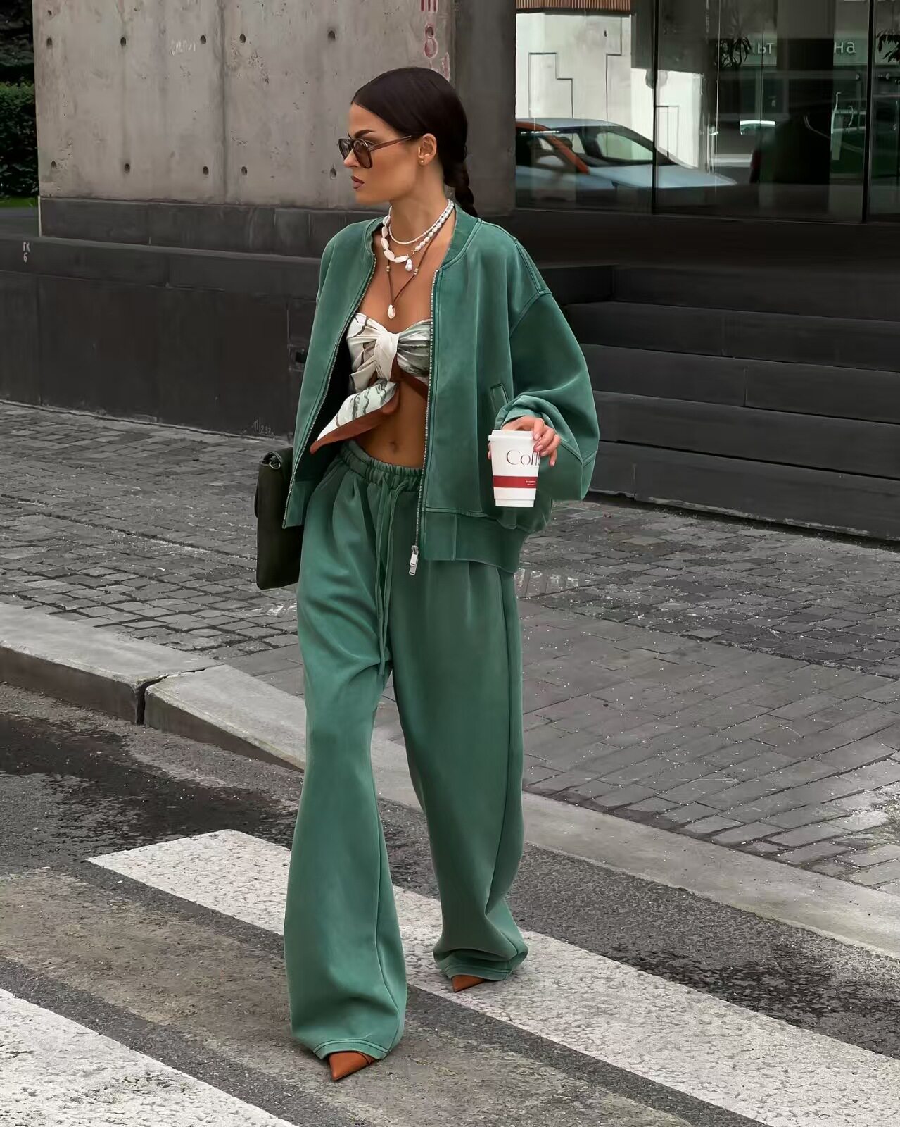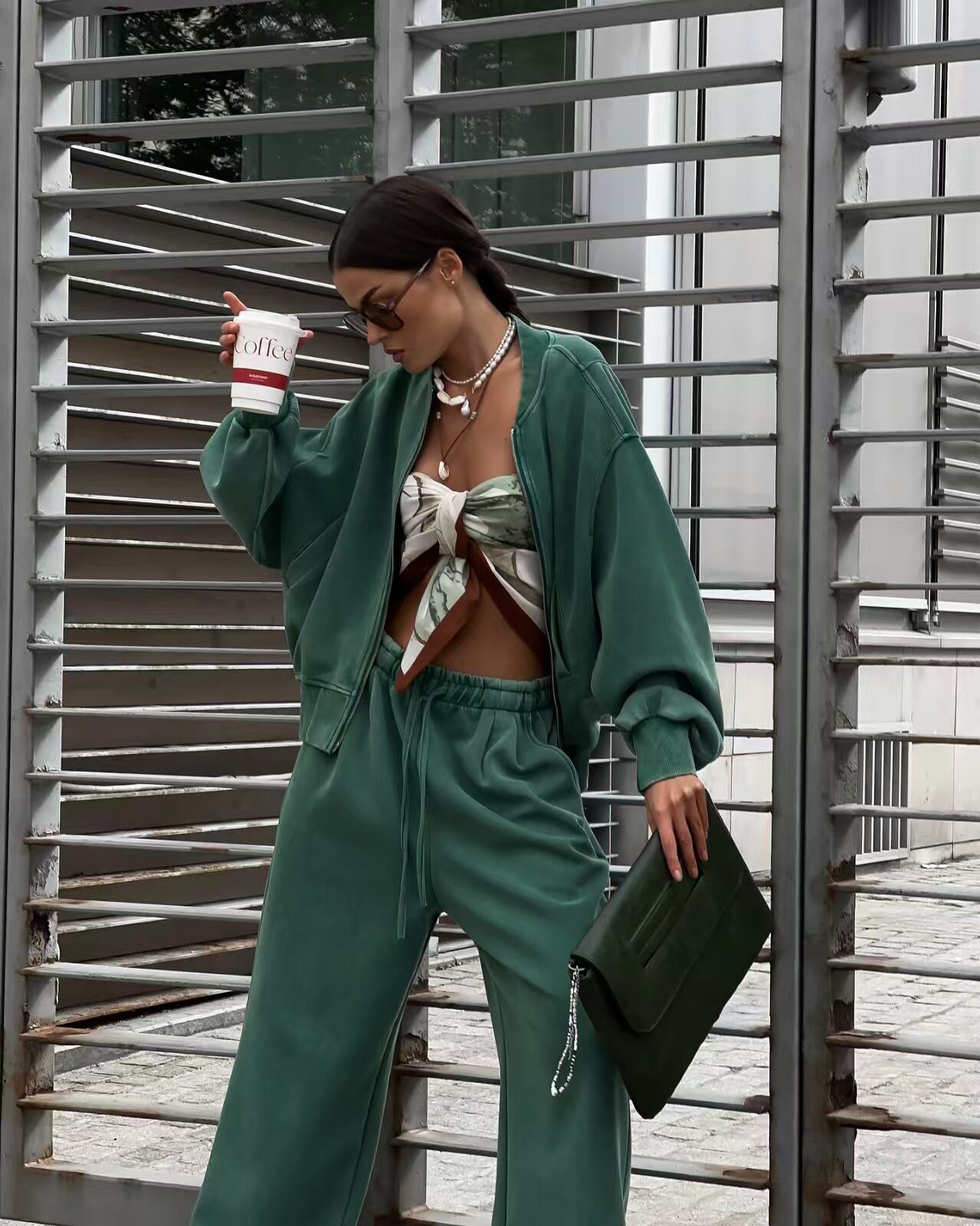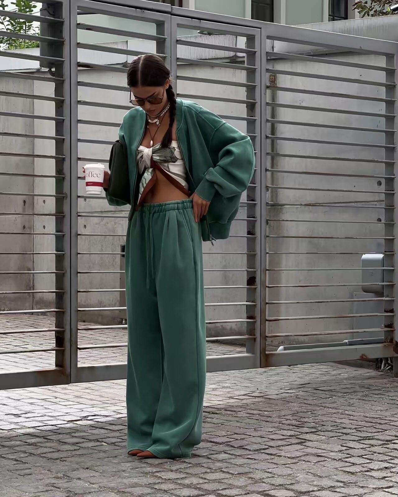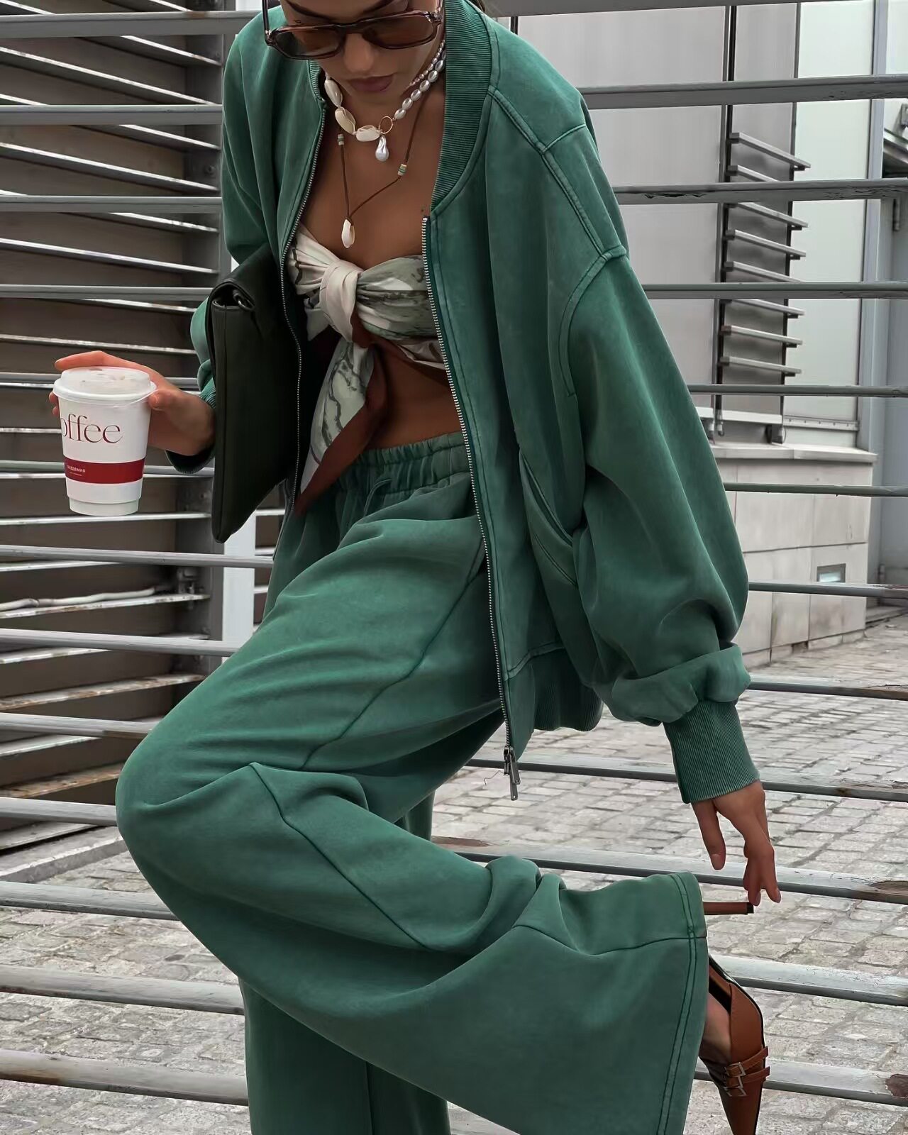 European and American style zipper long-sleeved loose sweatshirt high-waisted straight pants set Loose top and pants set