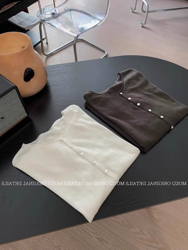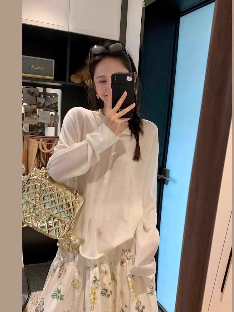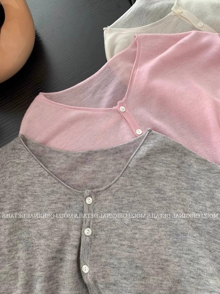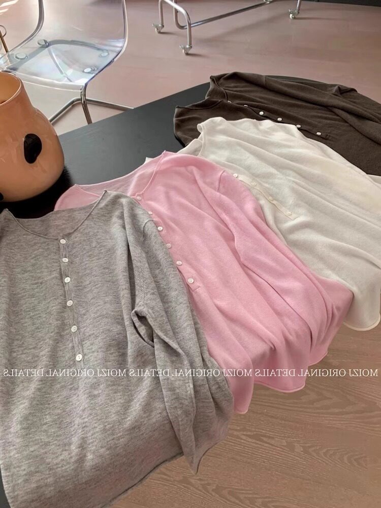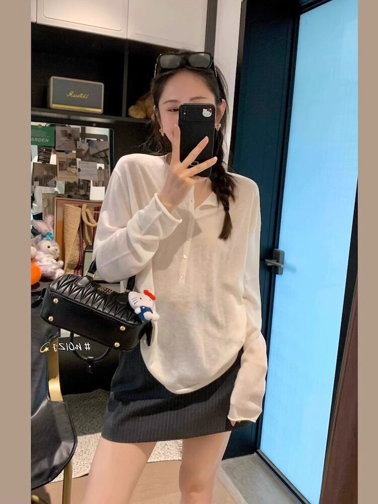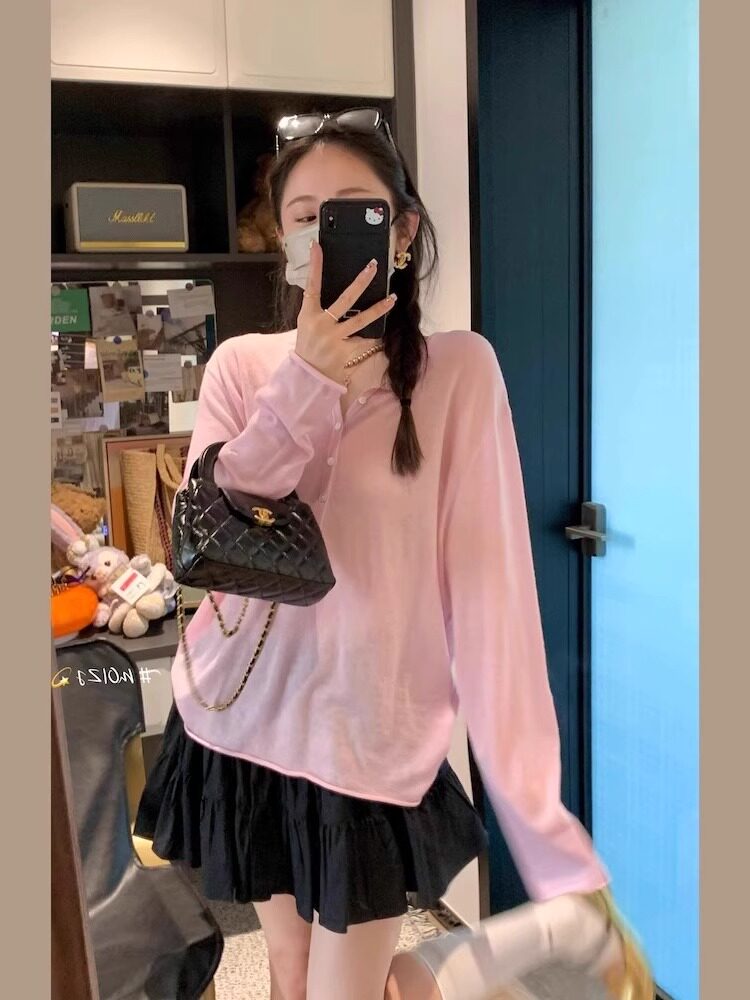 Brown Ice Silk Mask Long Sleeve T-Shirt Women's Summer Thin Tencel Henley Collar Lazy Sunscreen Cover-up Top
