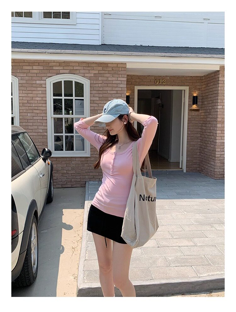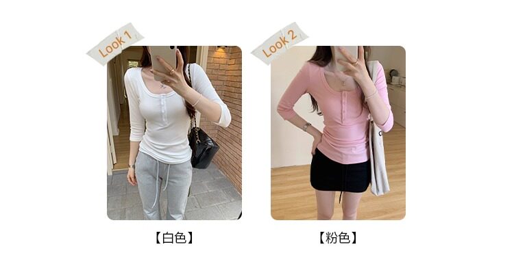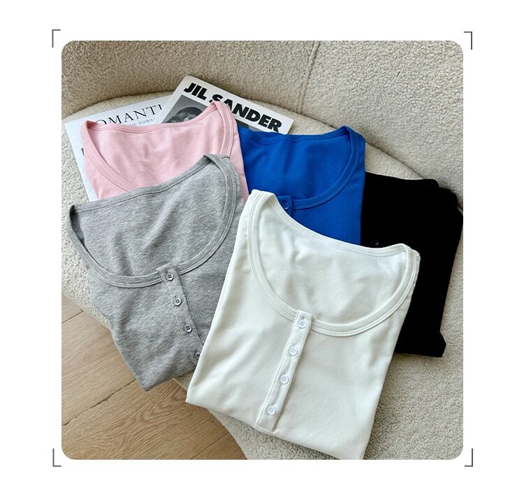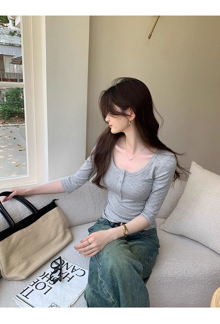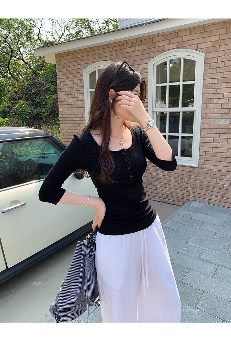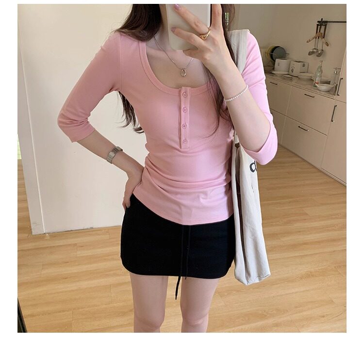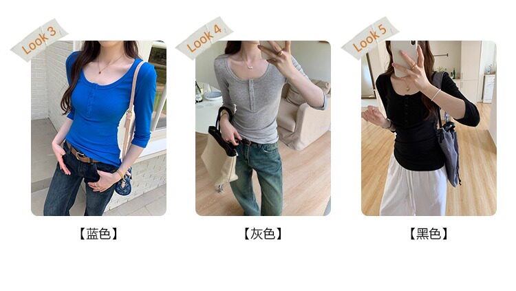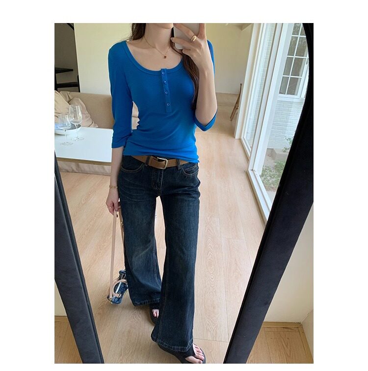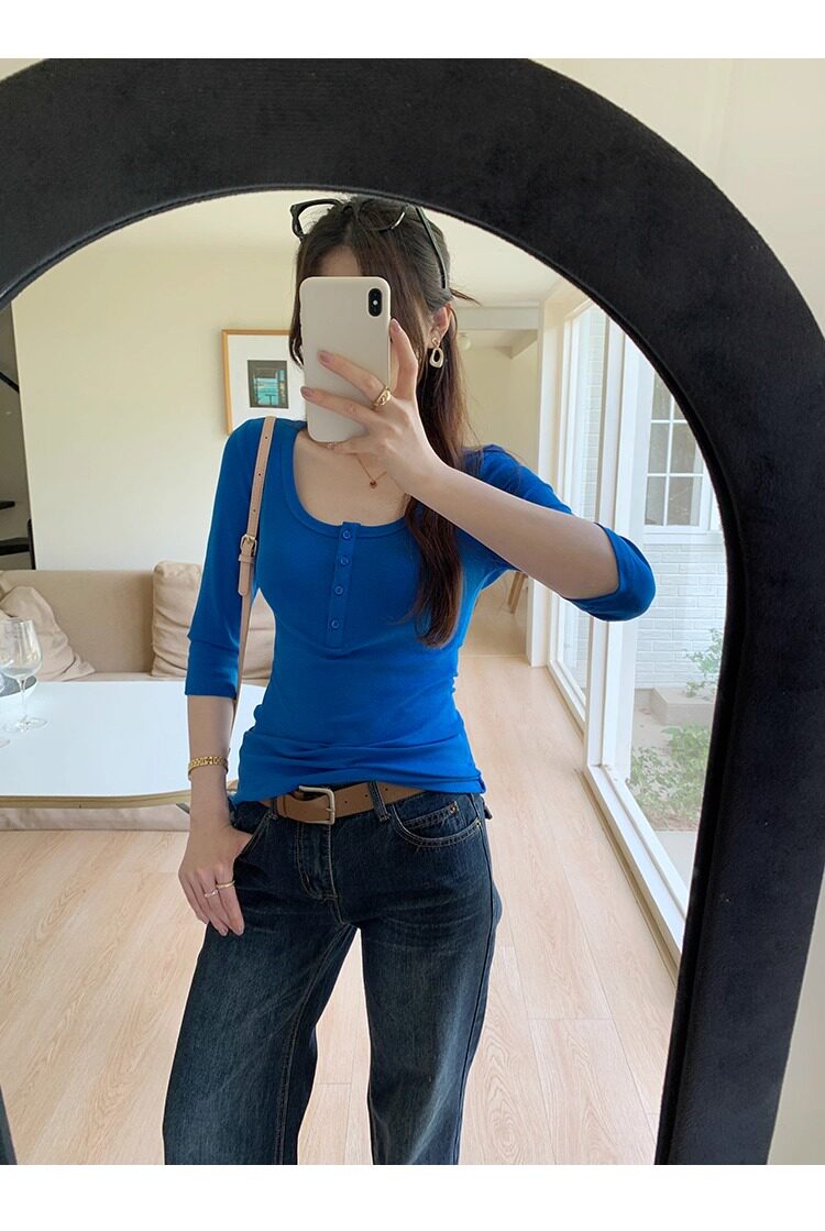 Klein Blue U-Neck Mid-Sleeve T-Shirt for Women, Spring and Autumn 2025 New Design, Regular Shoulder Button-Up, Slim Fit Top