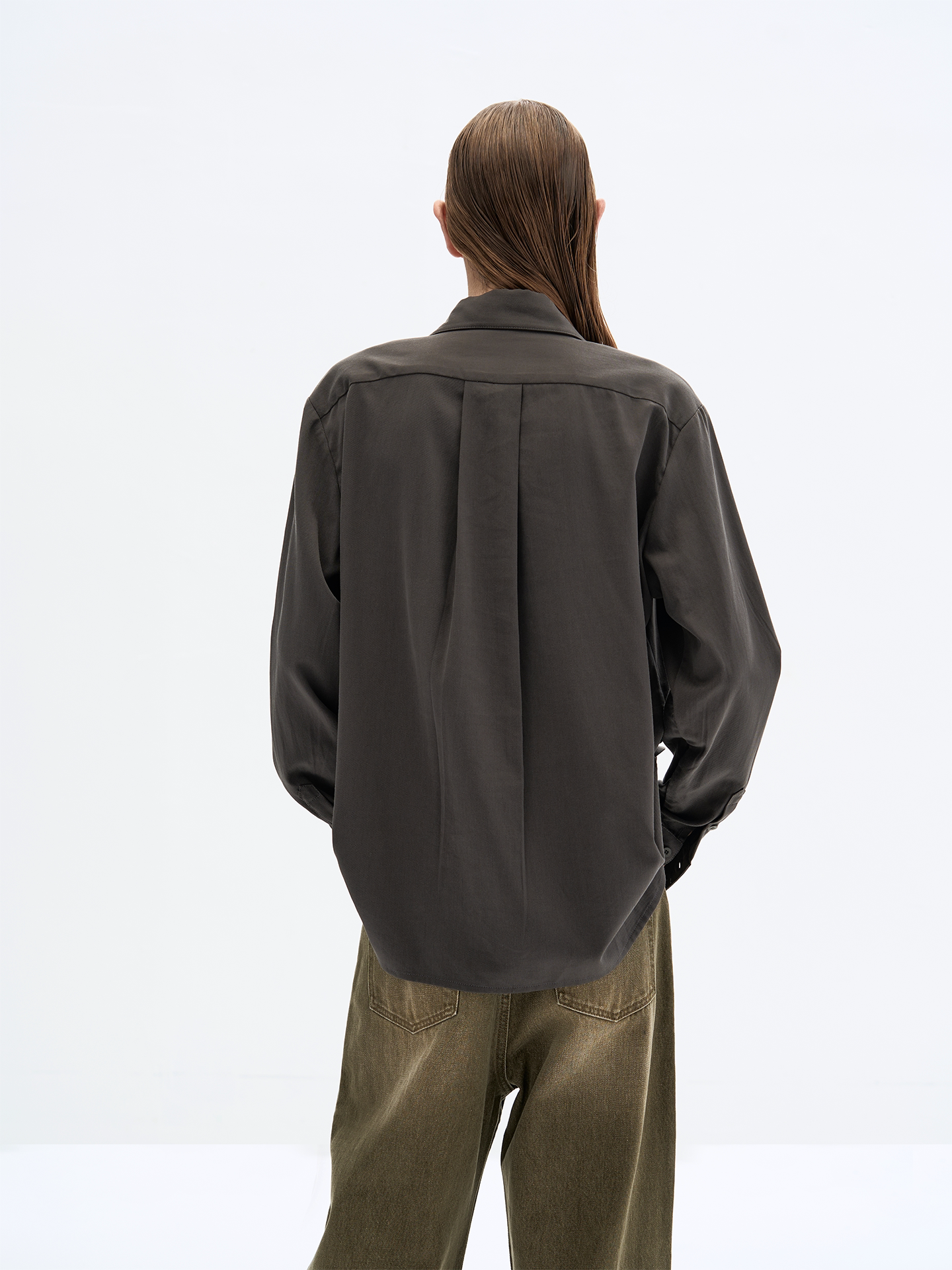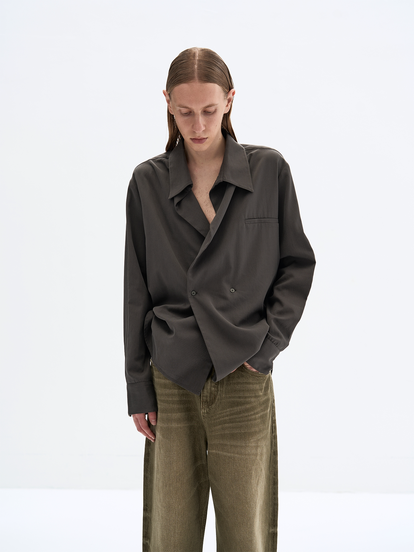 Slight Vogue丨Morning mist color gent Tencel cross-breasted cut loose commuting long-sleeved shirt