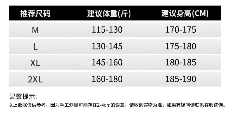 China (cm) 165 / 88-90 170 / 96-98 175 / 108-110 180 / 118-122 185 / 126-130