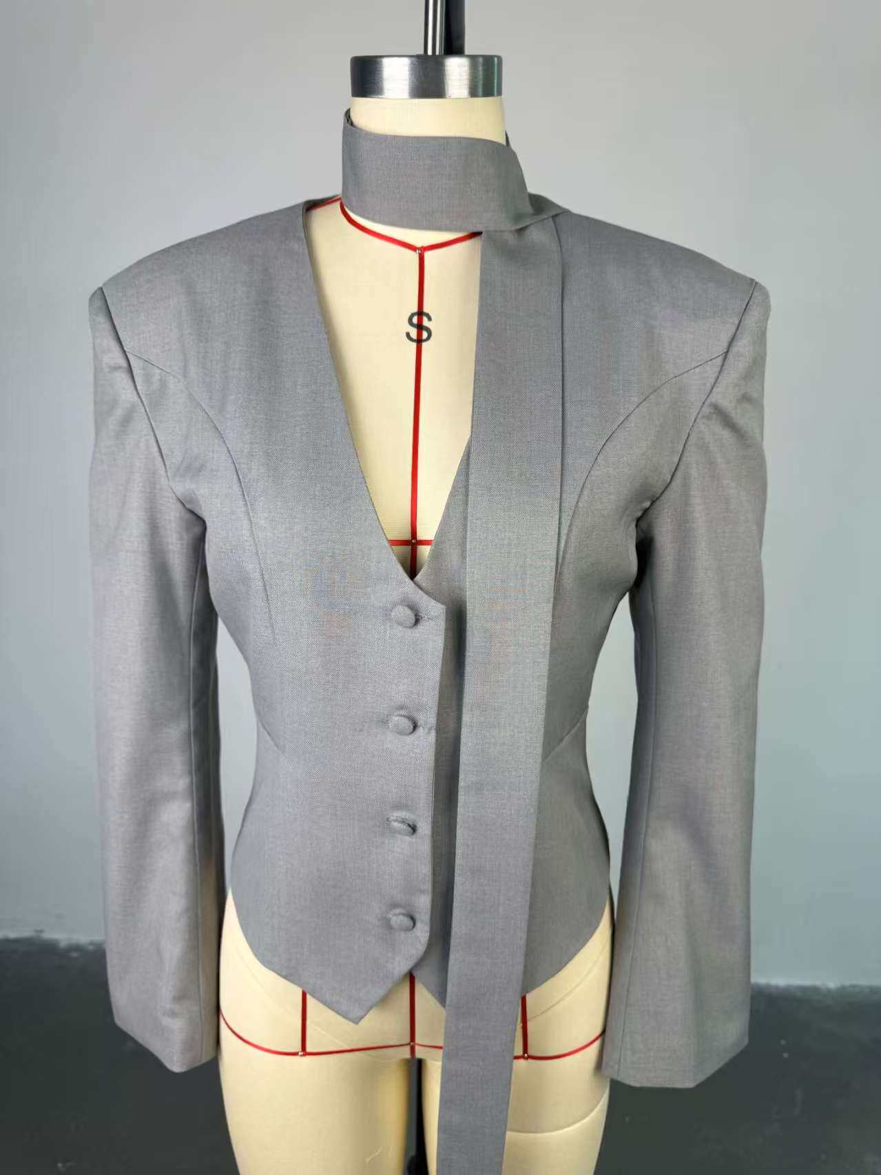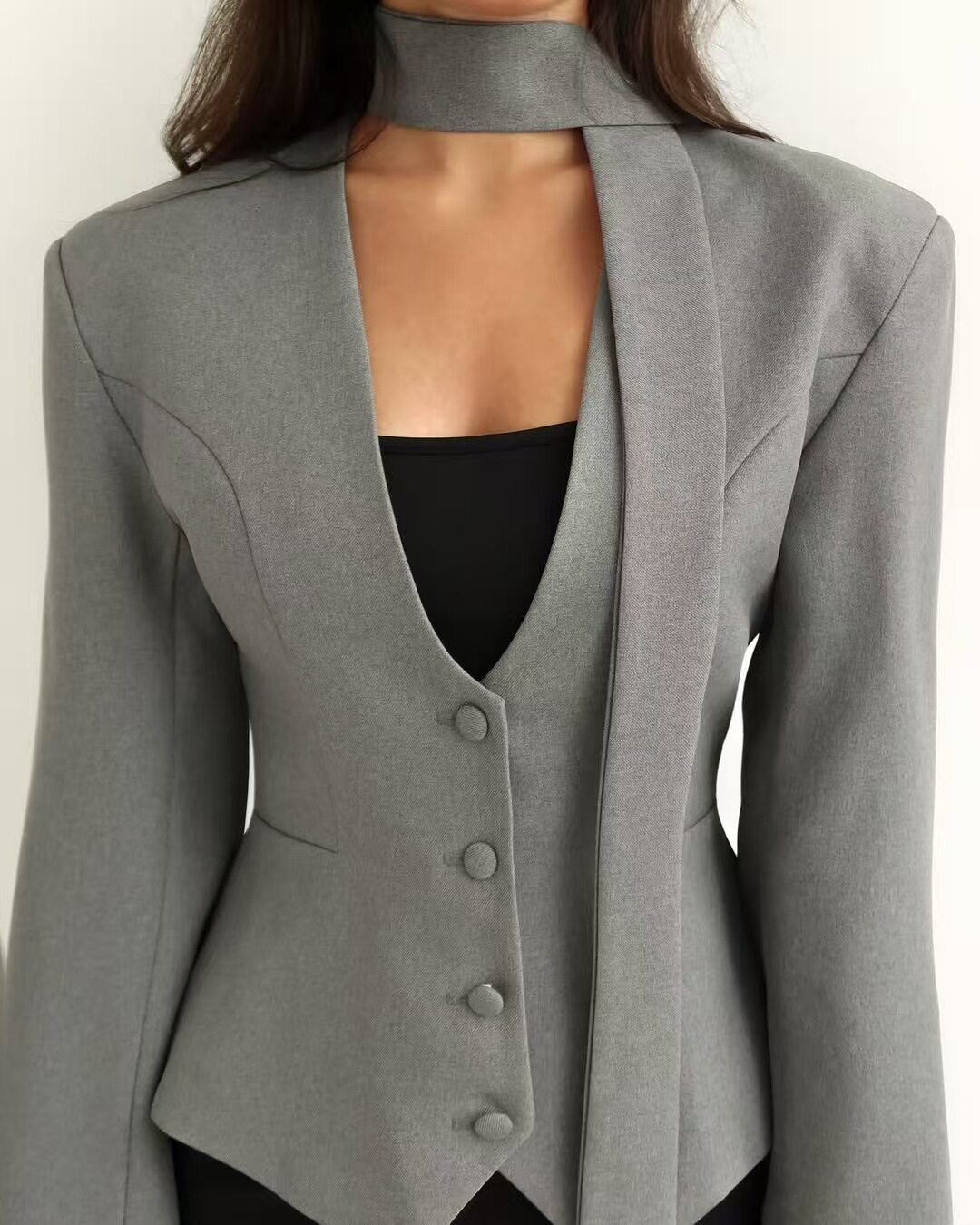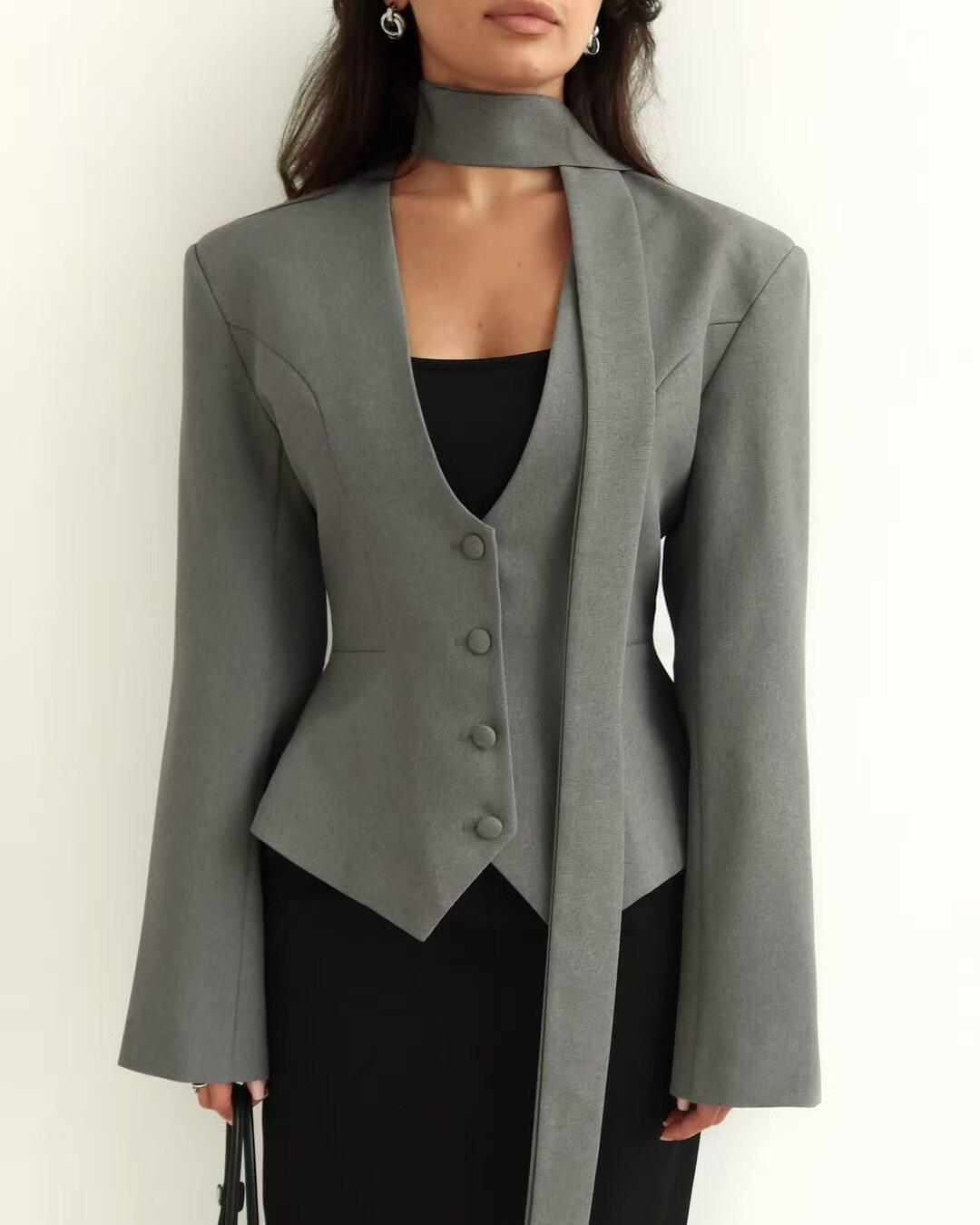 European and American Style Fashion Solid Color V-Neck Scarf-Decorated Long-Sleeve Casual Blazer Jacket