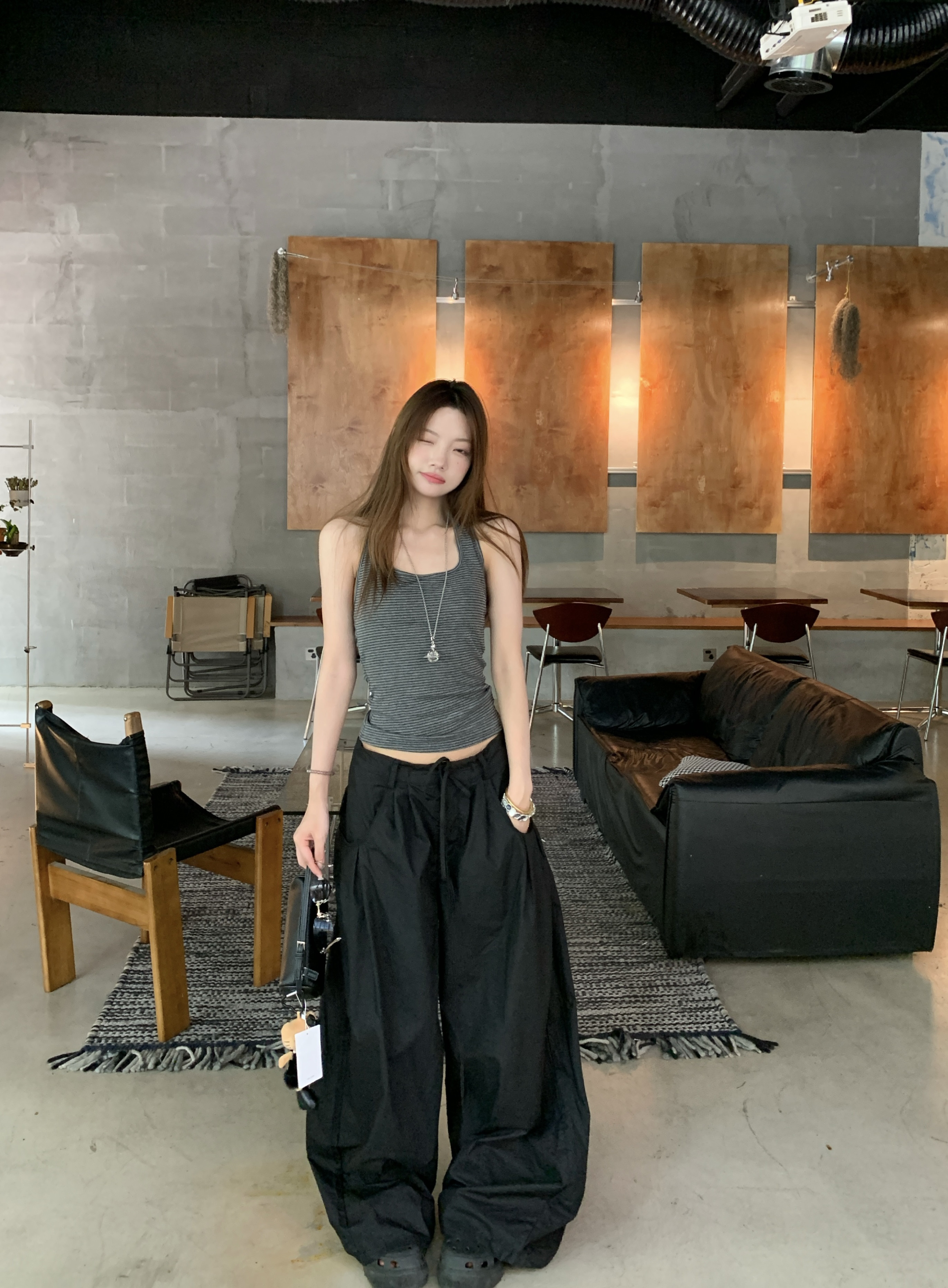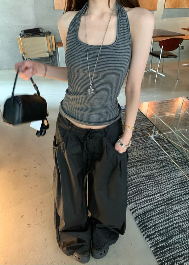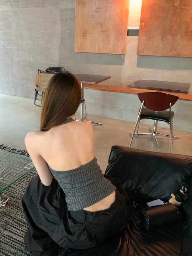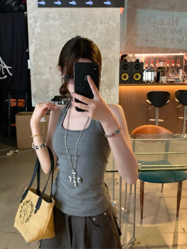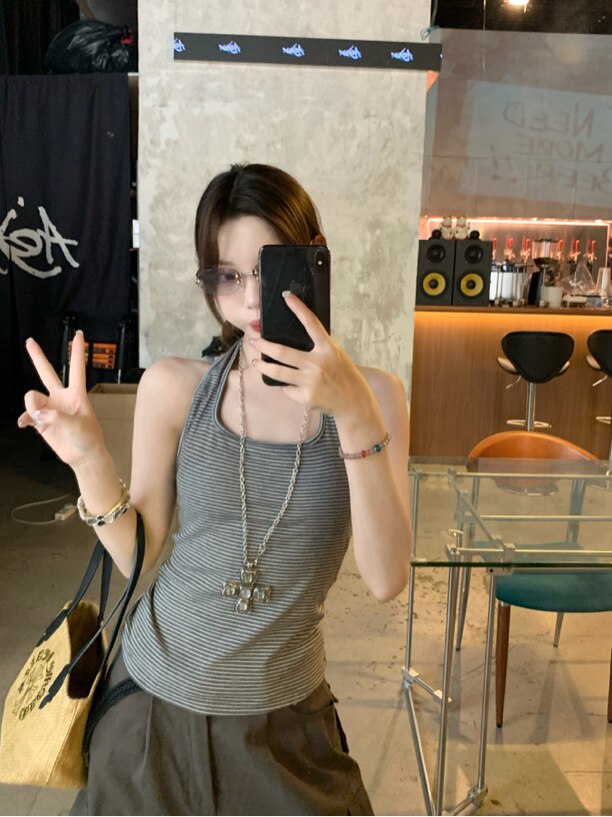 Striped Halter Neck U-Neck Tank Top for Women, Summer Sweet and Spicy Style, Slim Fit, Stylish Design with Chest Pads, Short Top