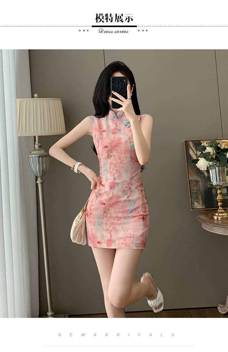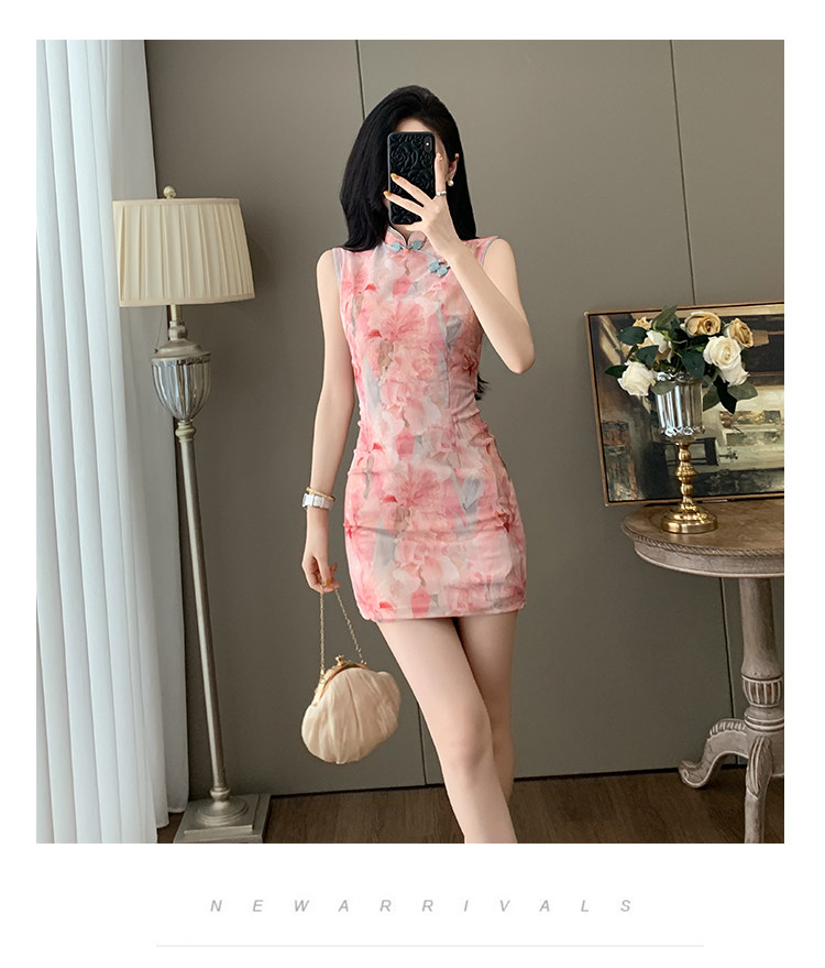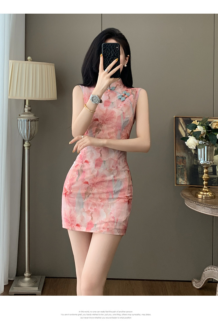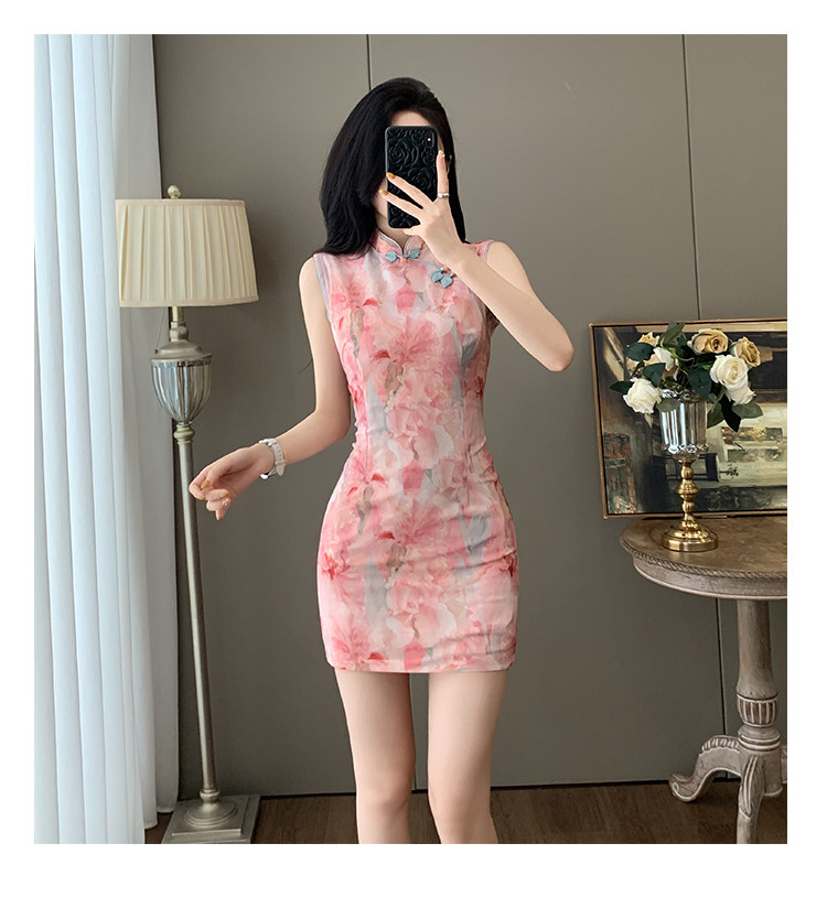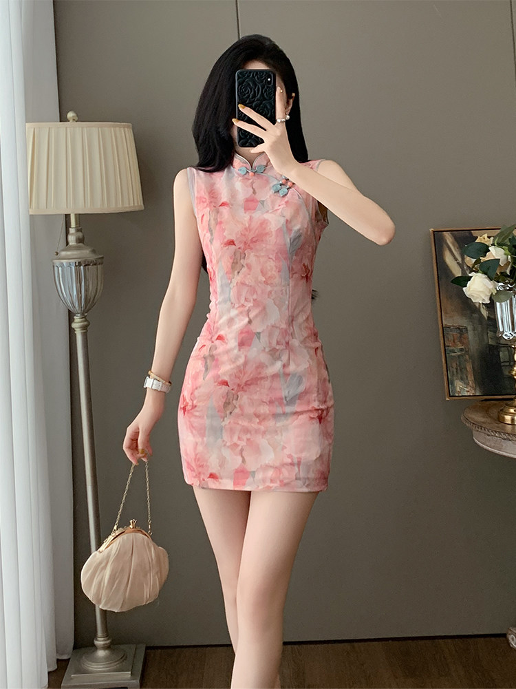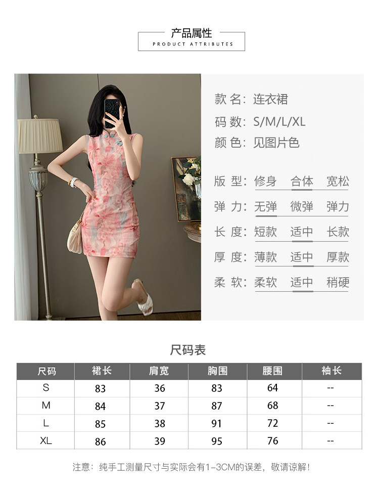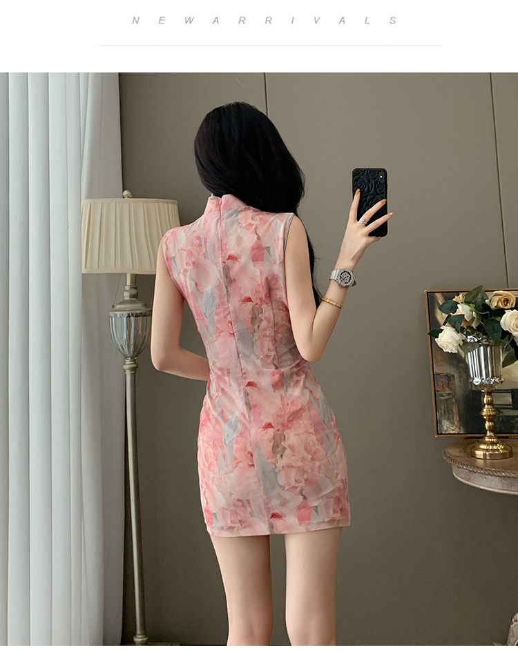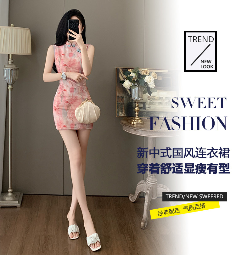 Summer New Chinese-Style National Style Stand-Up Collar Buttoned Dress for Women, Elegant Sleeveless Retro Printed Improved Slim-Fit Cheongsam Dress