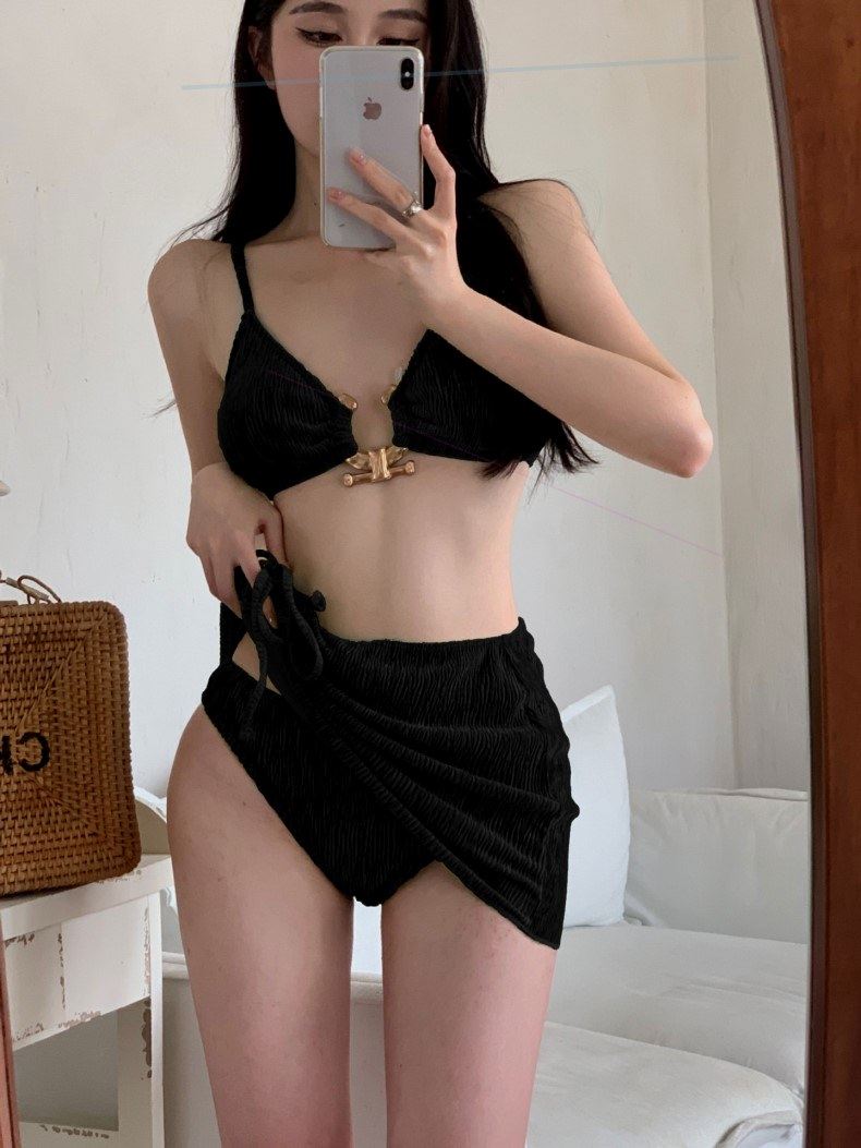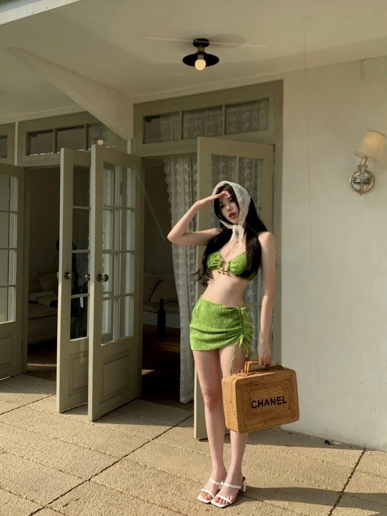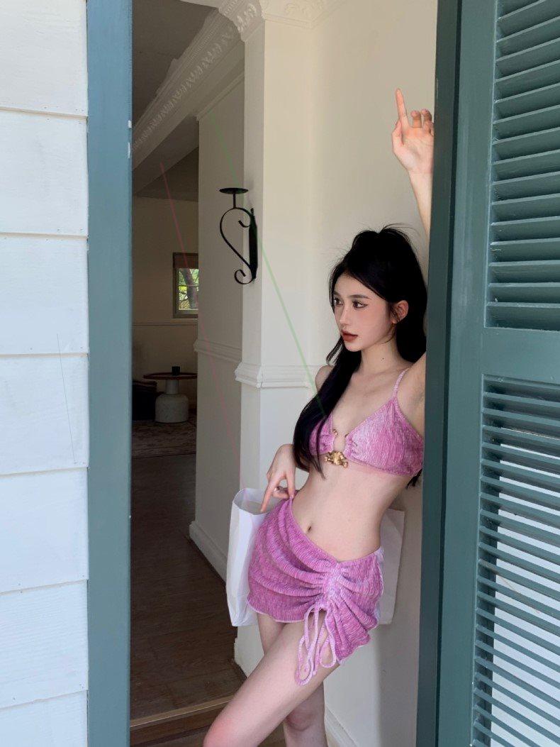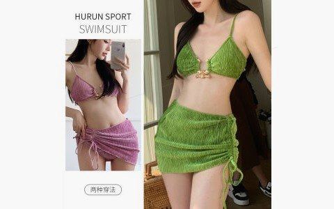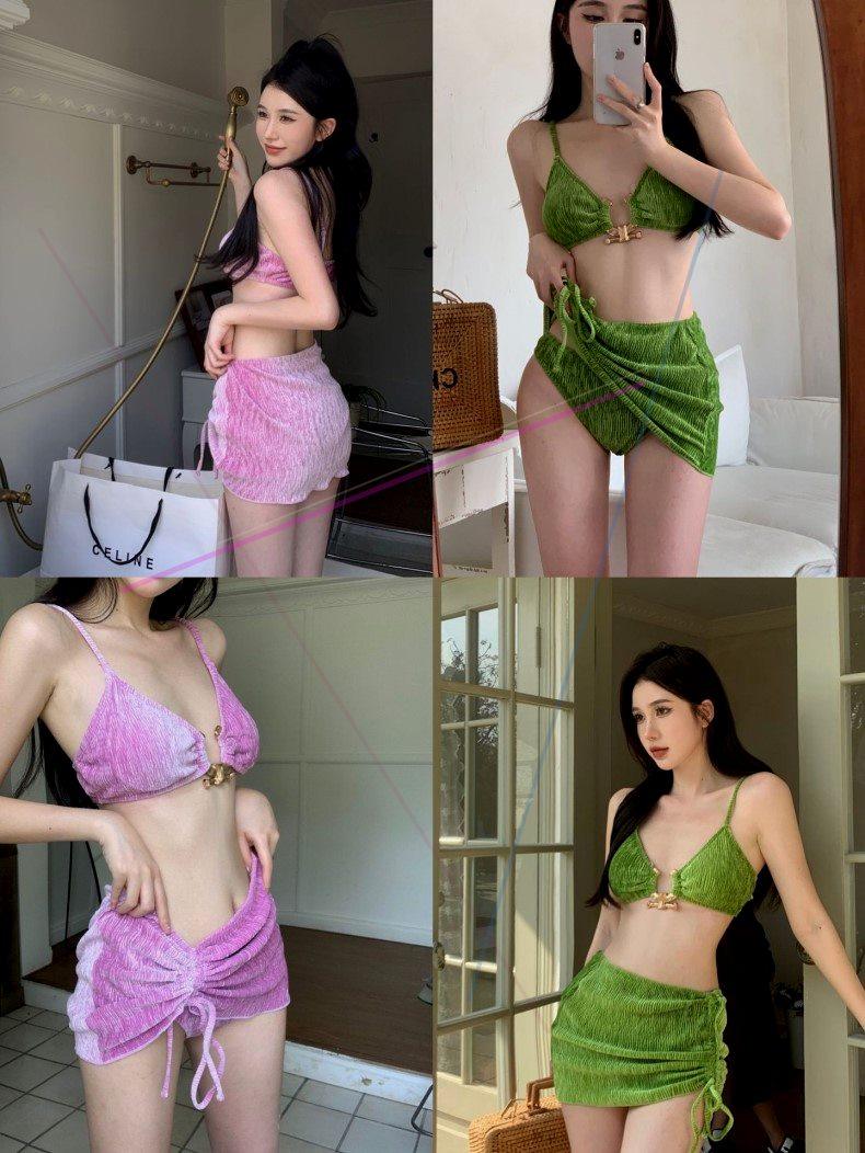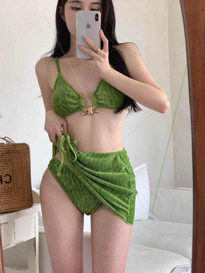 Fresh Green Velvet Bikini Three-Piece Set European and American Style ins Slimming Sexy Two-Piece Swimsuit for Sanya Vacation and Hot Spring Bathing