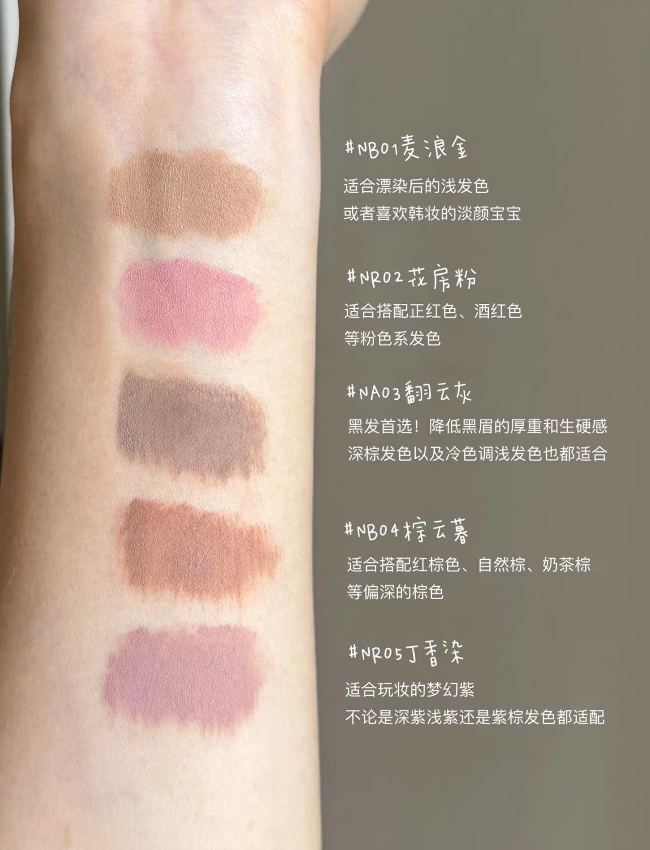 Color Classification Nb01 Mailangjin,Nr02 Flower Room Powder,Na03 Cloud Gray,Nb04 Brown Cloud Twilight,Nr05 Clove Dye