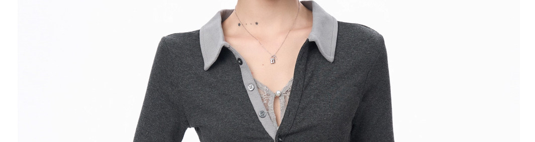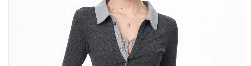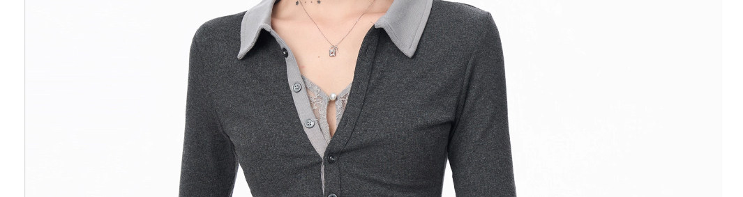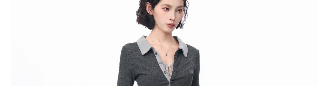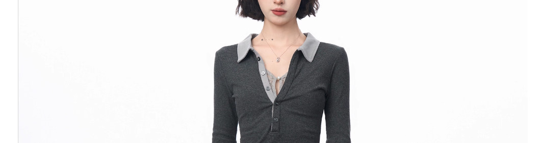 Gray Polo Collar Lace Fake Two-Piece Short-Sleeved T-Shirt for Women, Summer Design with a Unique and Cool Style, Half-Sleeve Top ins