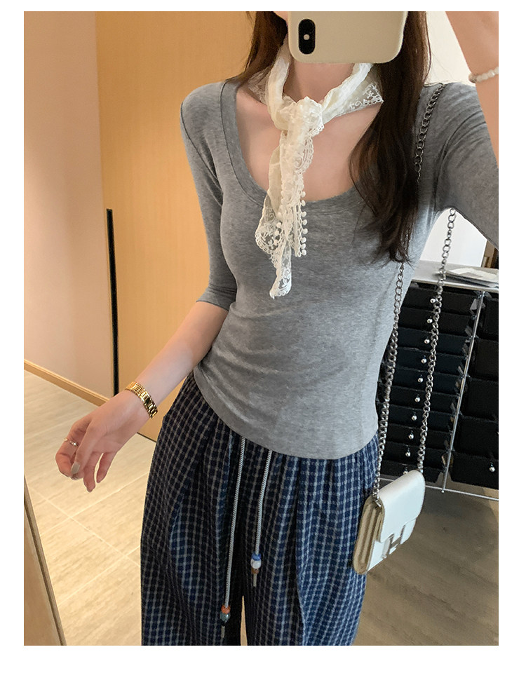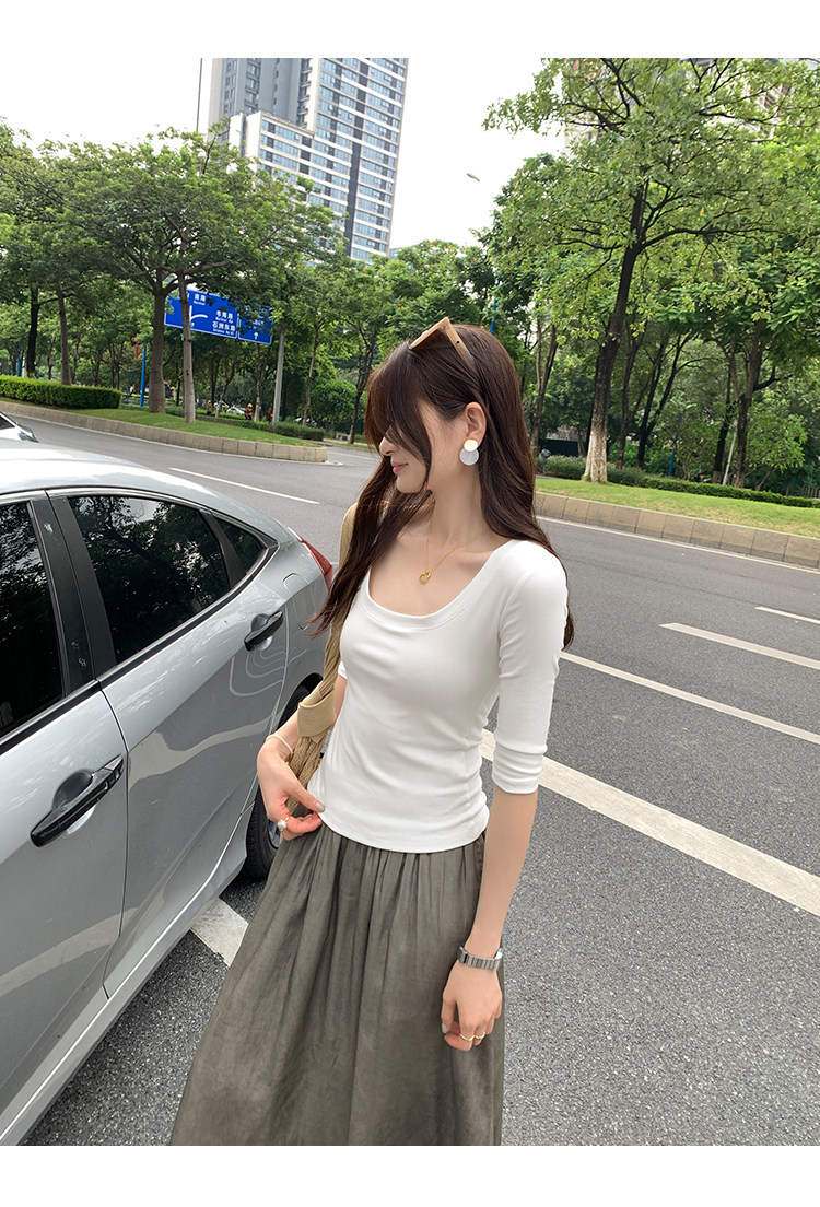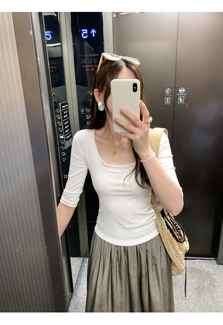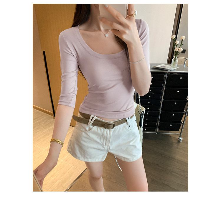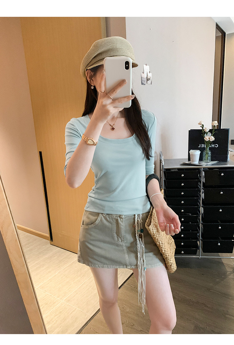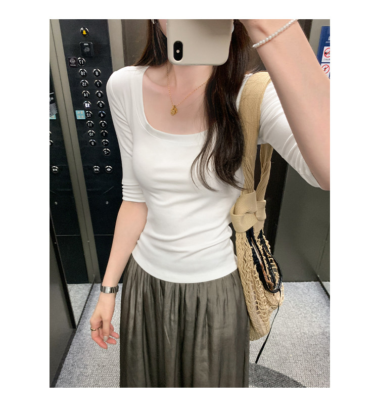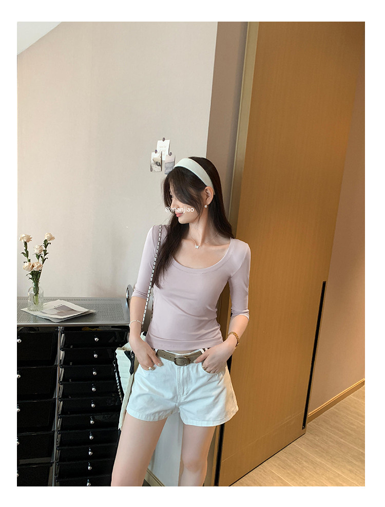 Lyocell Tencel U-Neck Mid-Sleeve T-Shirt for Women, Summer Korean Style, Pure and Alluring, Revealing Collarbone, Slim Fit, Age-Reducing Base Top