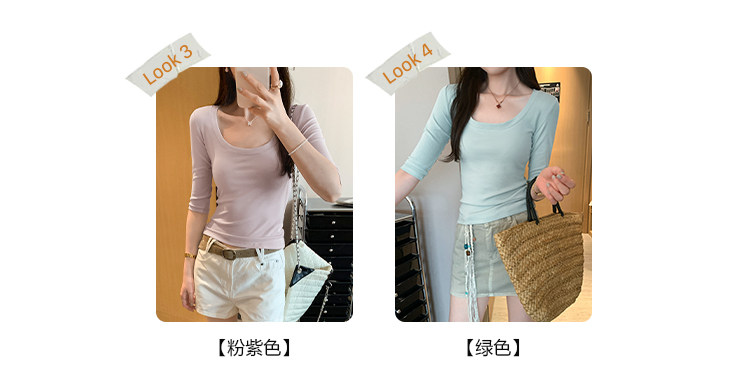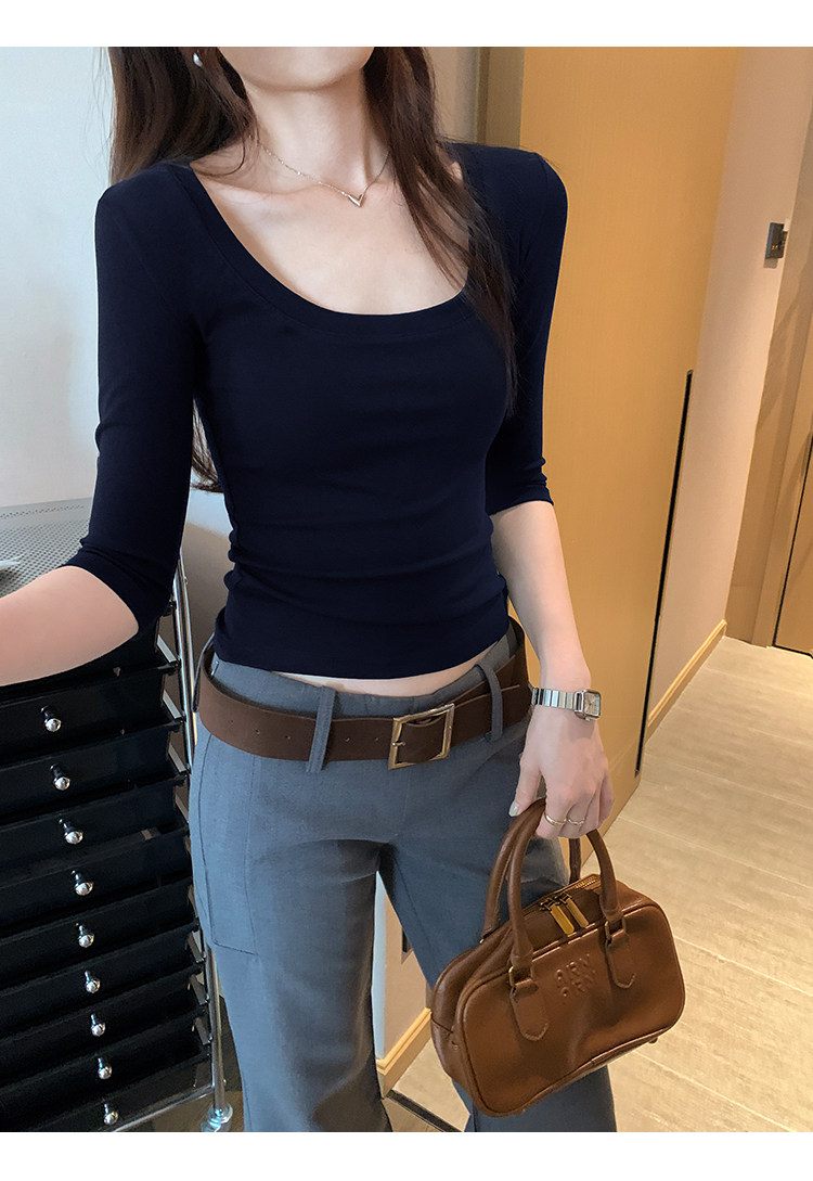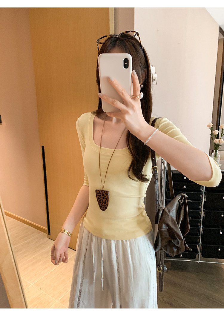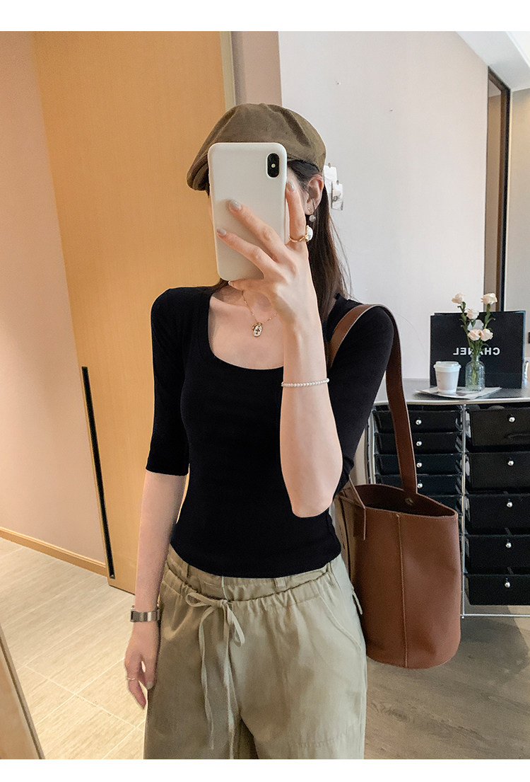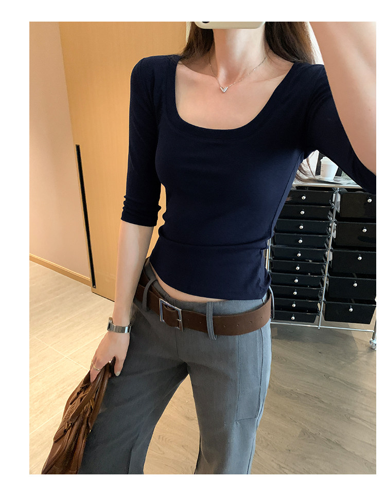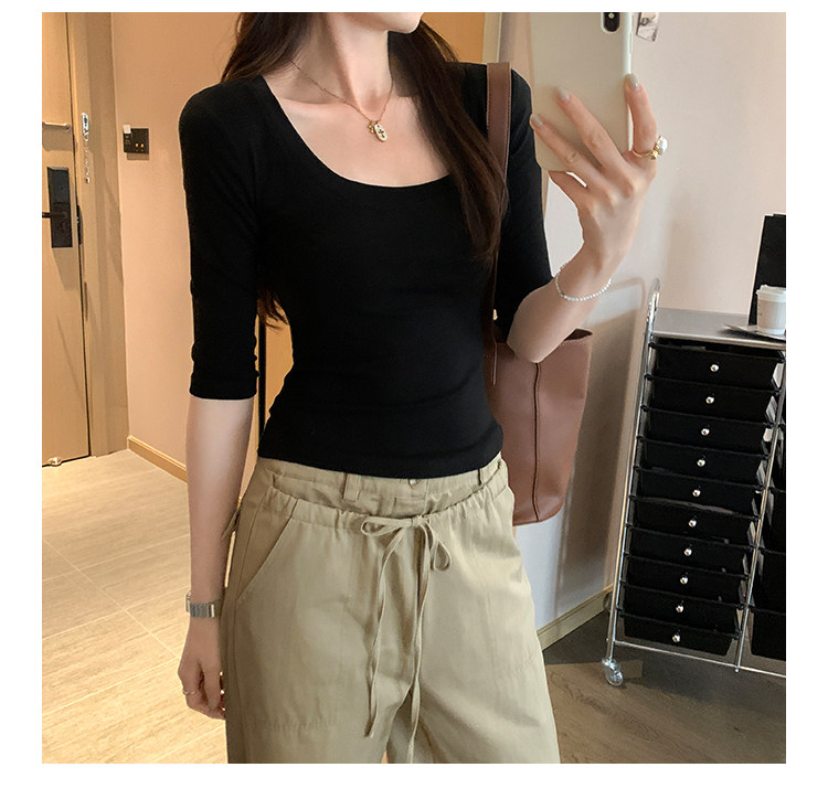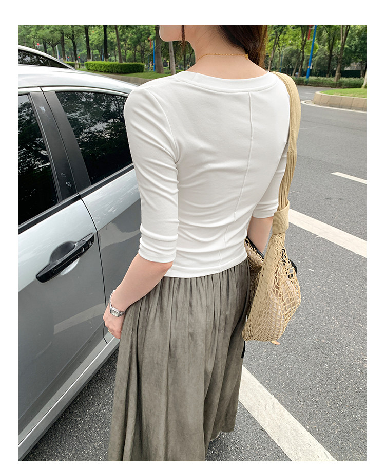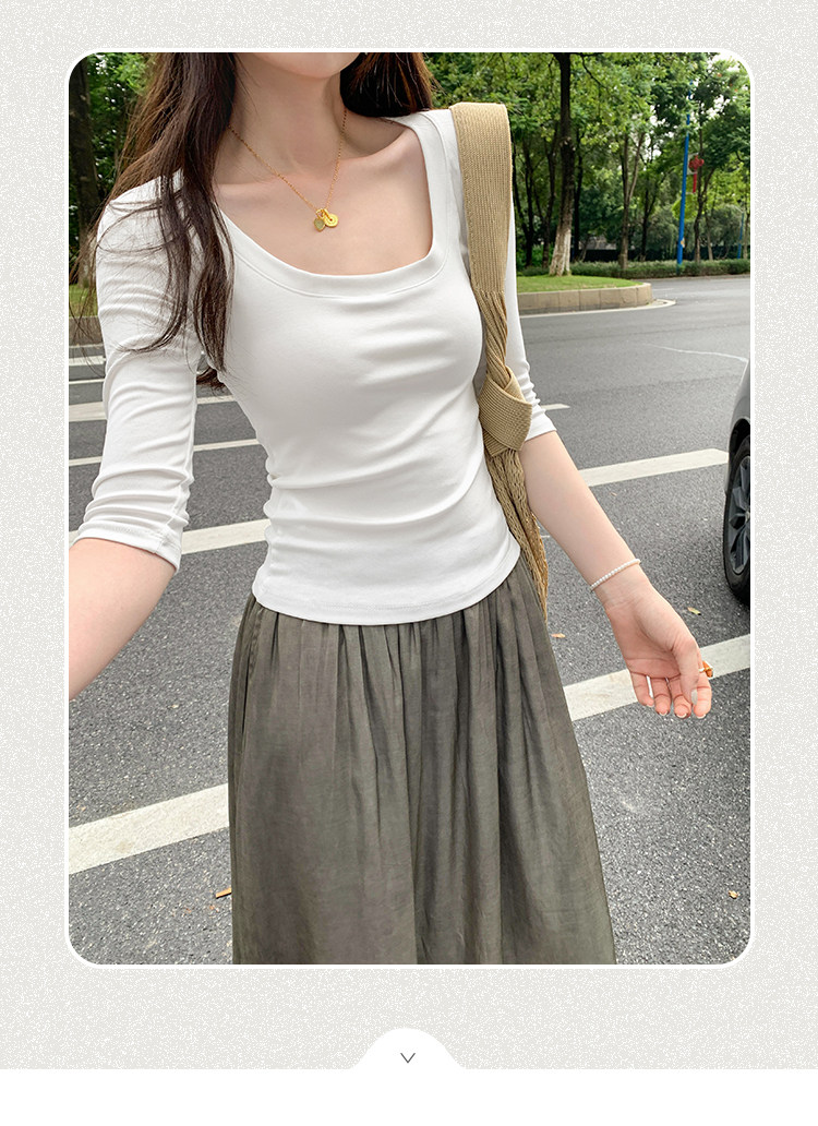 Lyocell Tencel U-Neck Mid-Sleeve T-Shirt for Women, Summer Korean Style, Pure and Alluring, Revealing Collarbone, Slim Fit, Age-Reducing Base Top