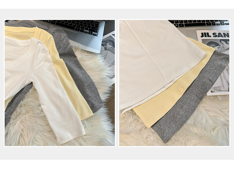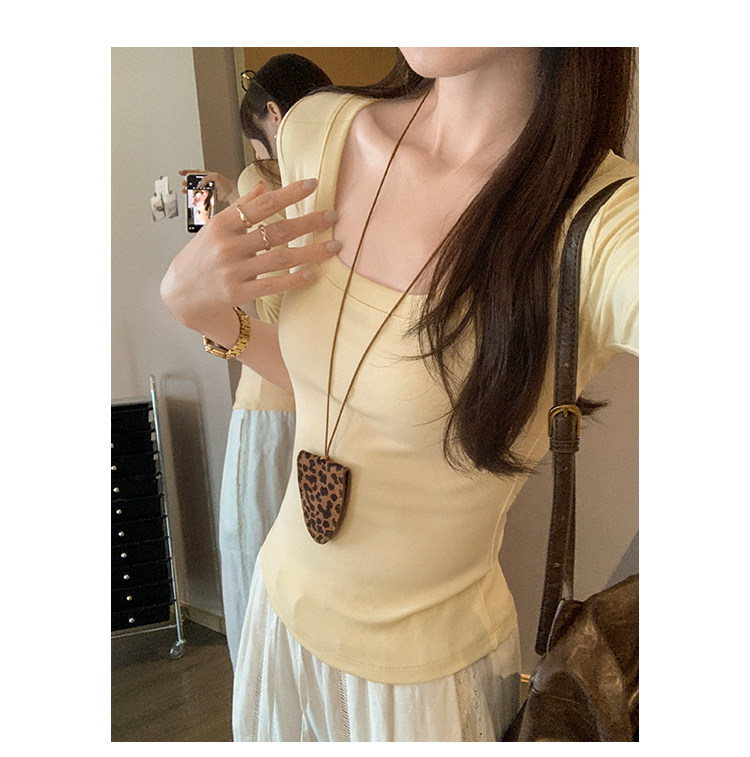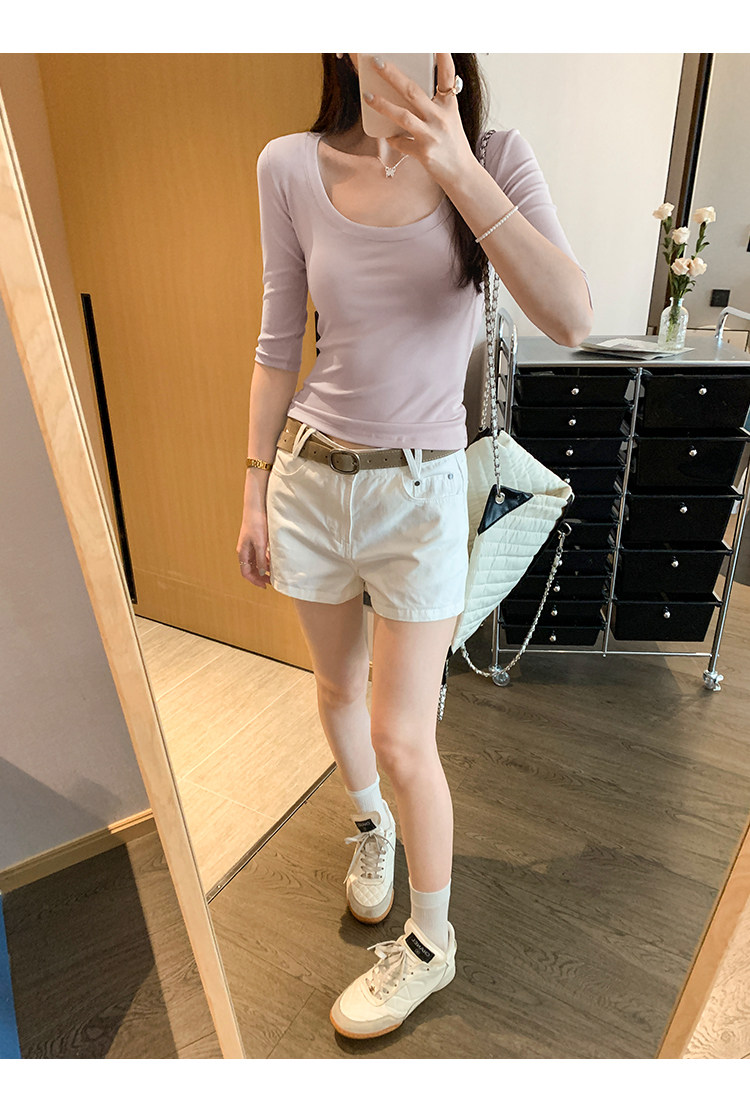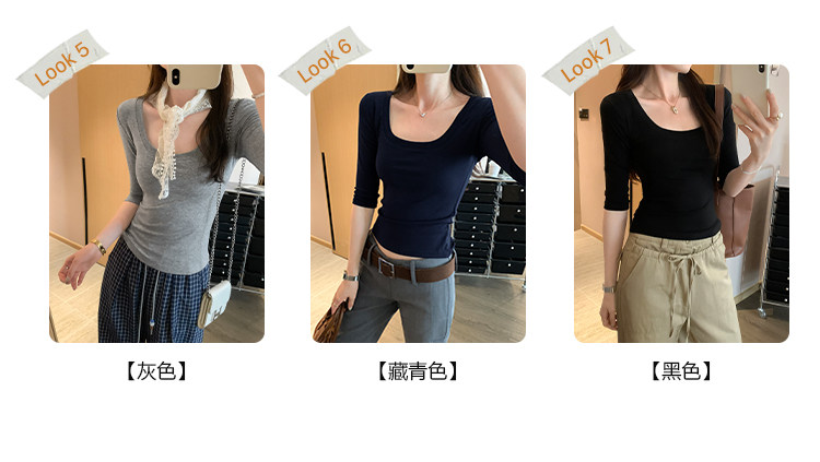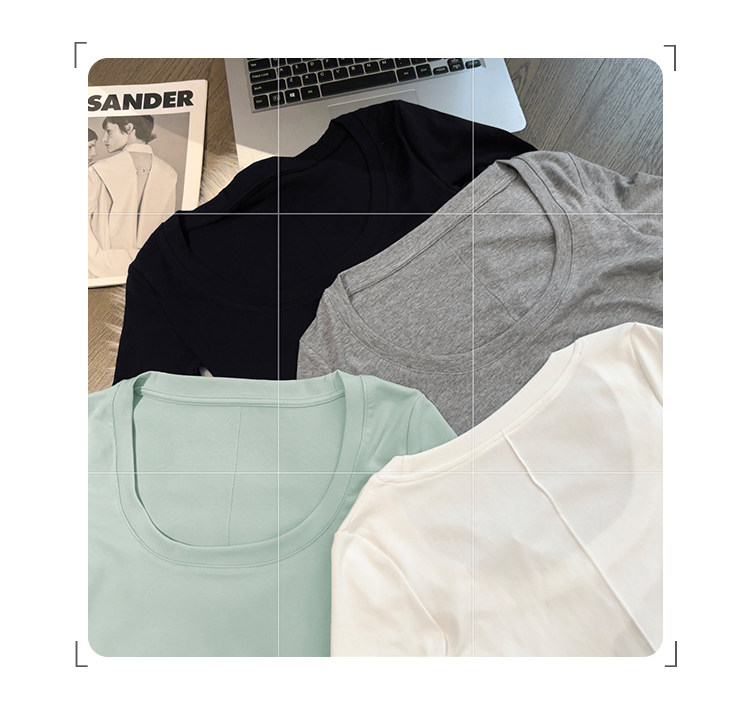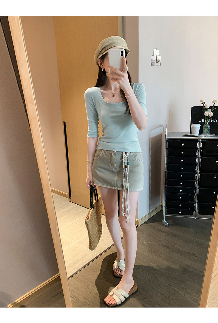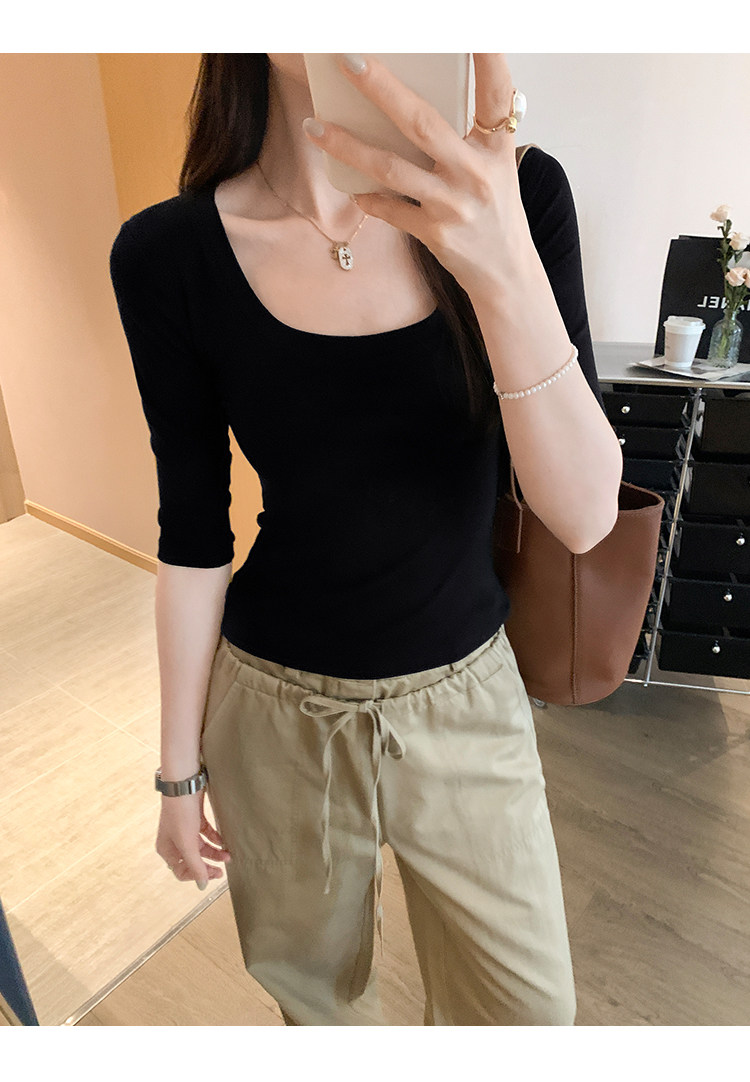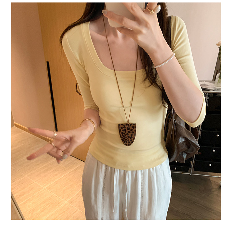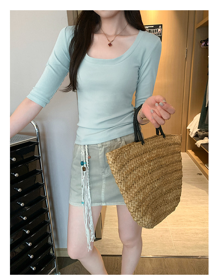Lyocell Tencel U-Neck Mid-Sleeve T-Shirt for Women, Summer Korean Style, Pure and Alluring, Revealing Collarbone, Slim Fit, Age-Reducing Base Top