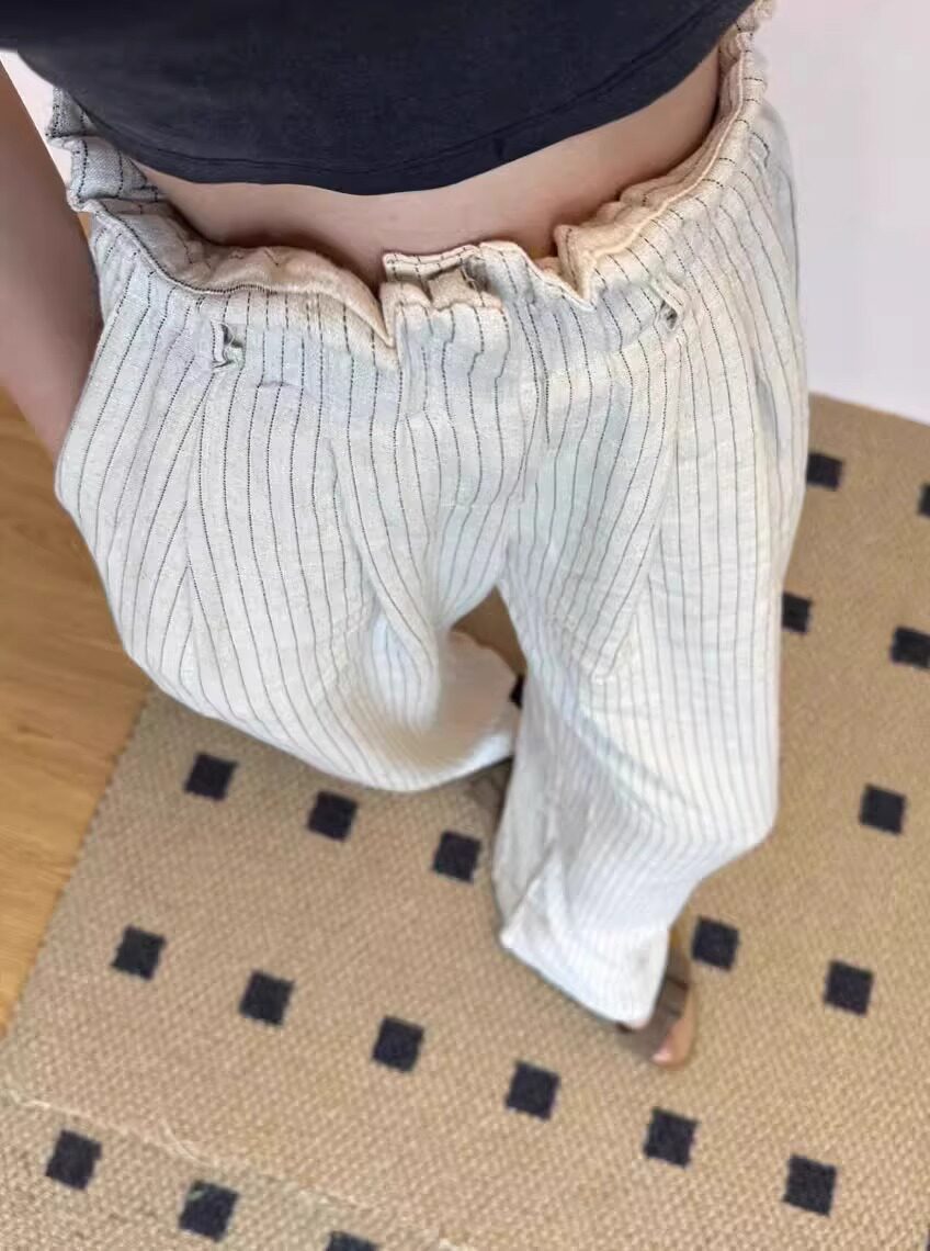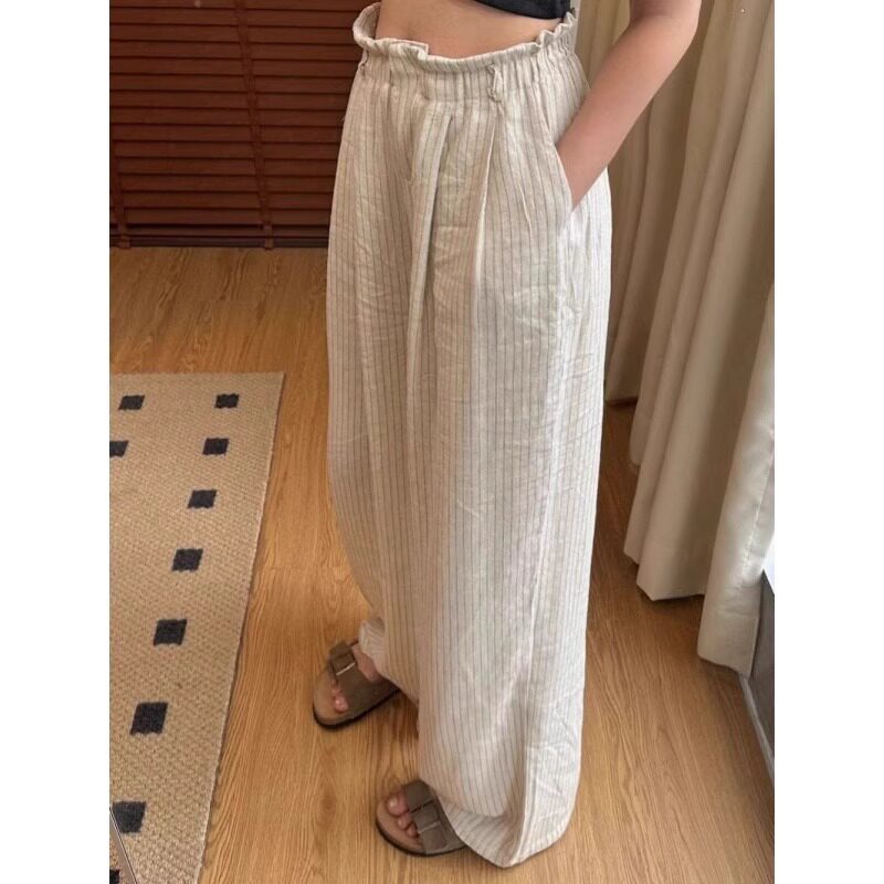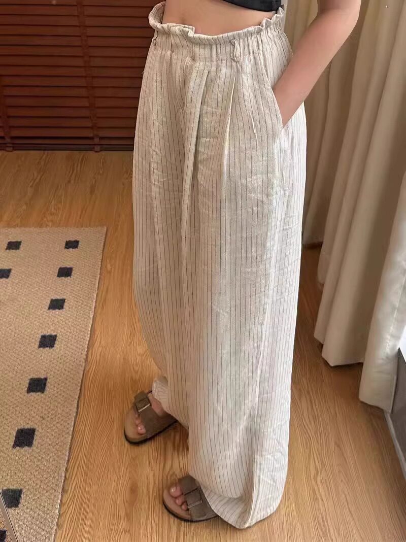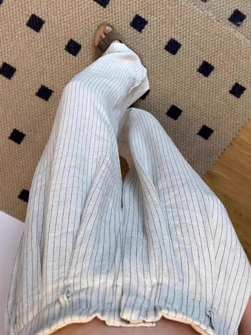 Lazy style striped cotton and linen wide-leg pants for women in summer, thin and drapey sycamore pants, straight-leg casual walking and mopping trousers