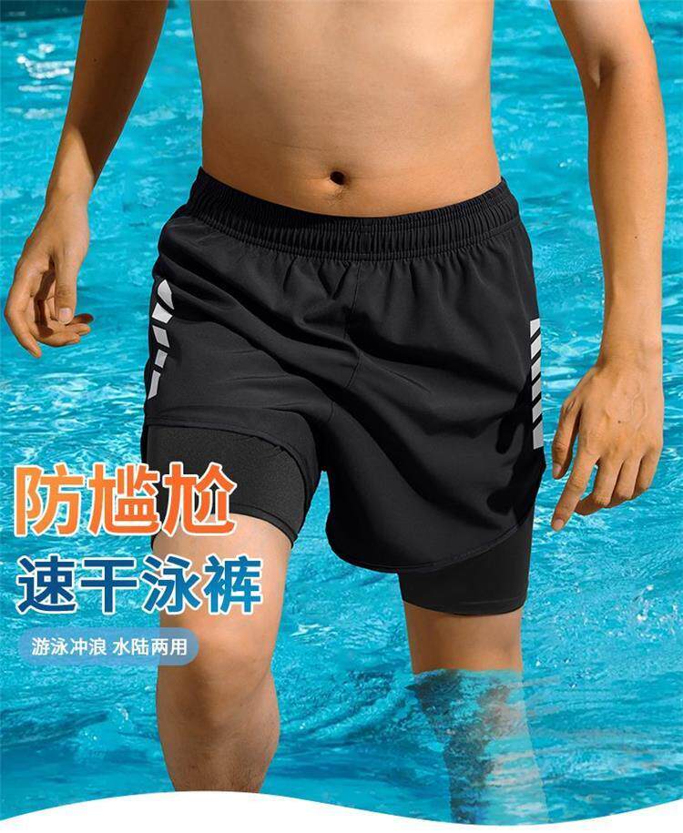 Men's Swimming Trunks, Anti-Embarrassment, Double-Layered, Quick-Drying Swimming Equipment, Adult Swimming Cap, Swimming Goggles, Three-Piece Set, New Style Men's Swimsuit