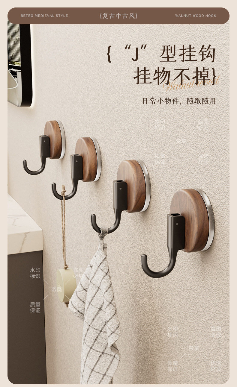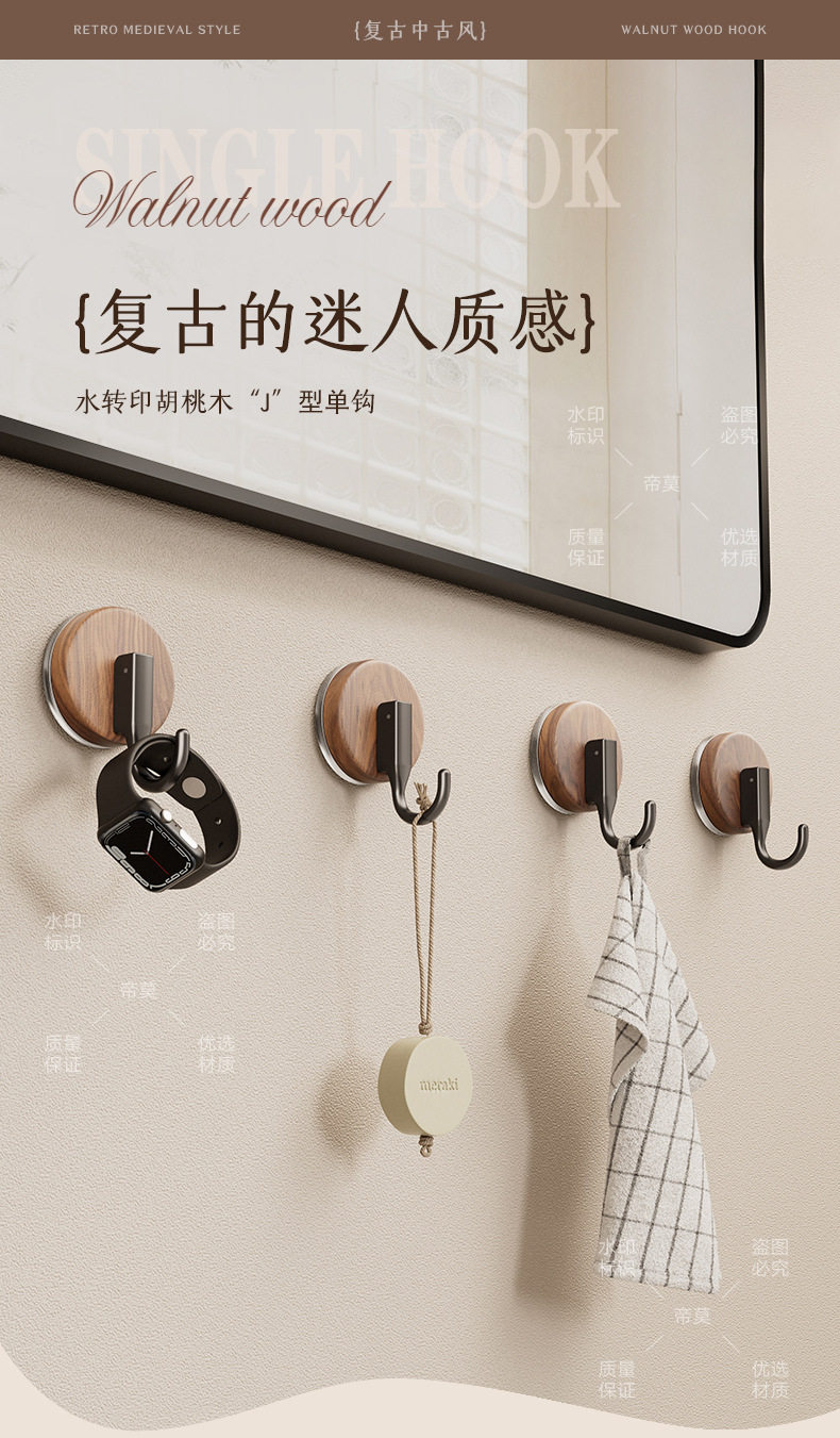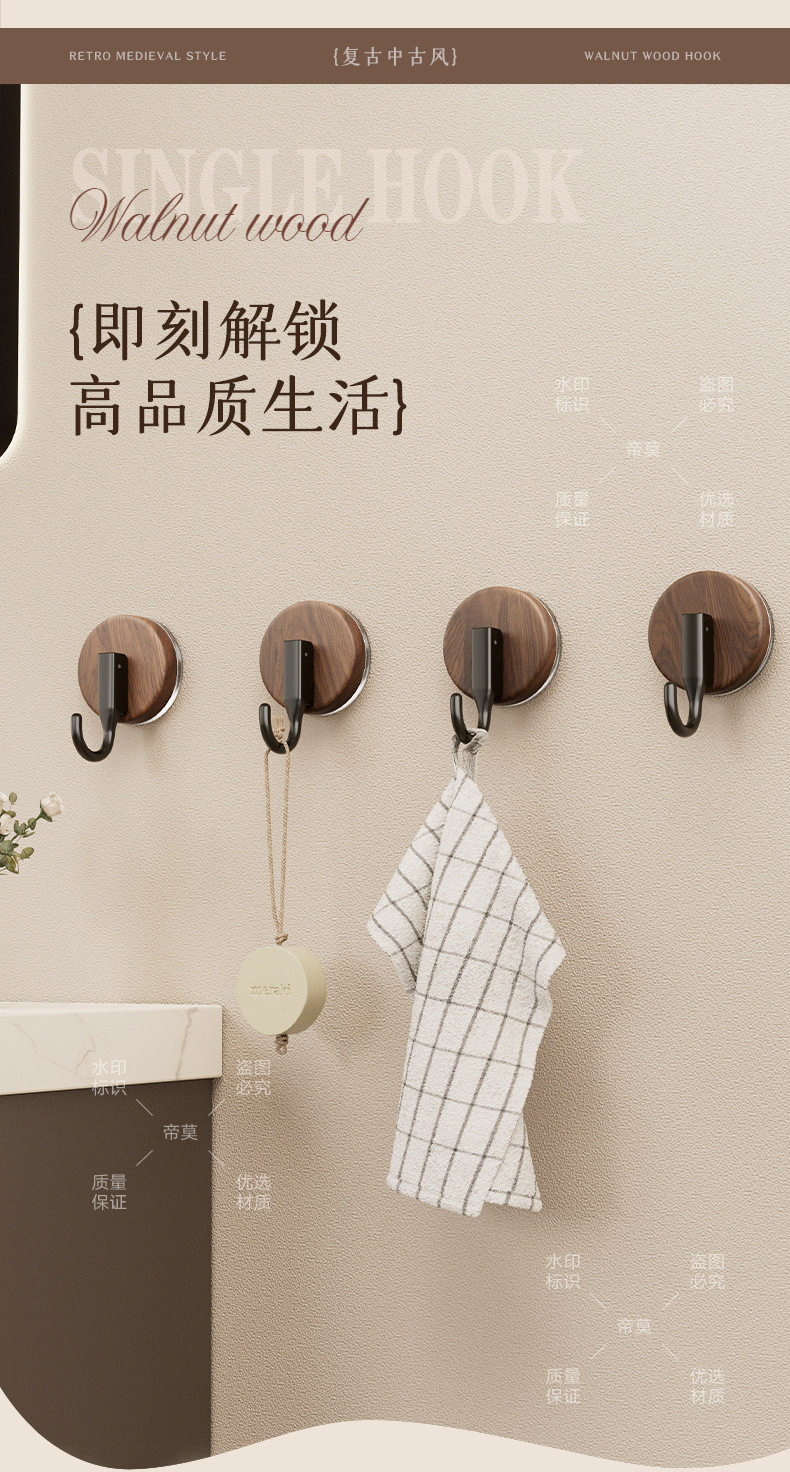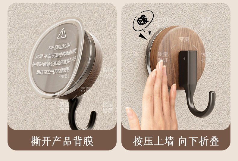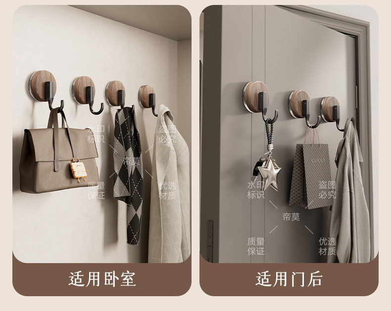 German Precision Wood Grain Suction Cup Hook, No-Drill, Heavy-Duty, for Bathroom and Behind Door, Towel Vacuum Traceless Adhesive Hook