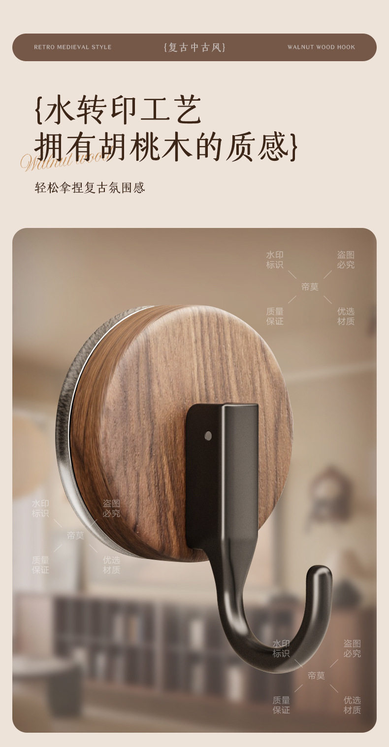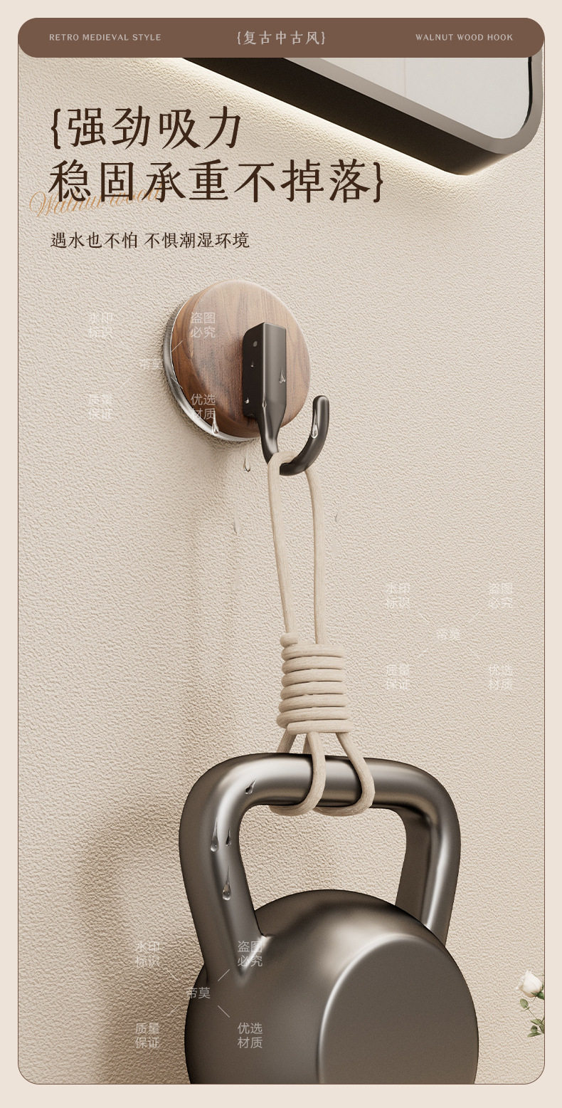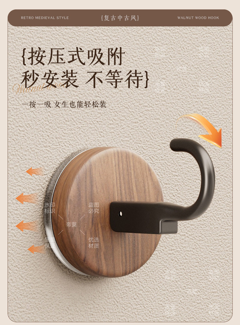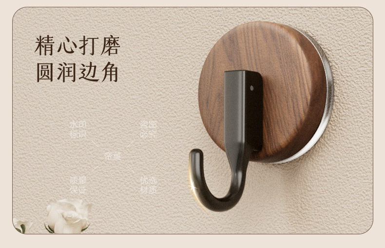 German Precision Wood Grain Suction Cup Hook, No-Drill, Heavy-Duty, for Bathroom and Behind Door, Towel Vacuum Traceless Adhesive Hook