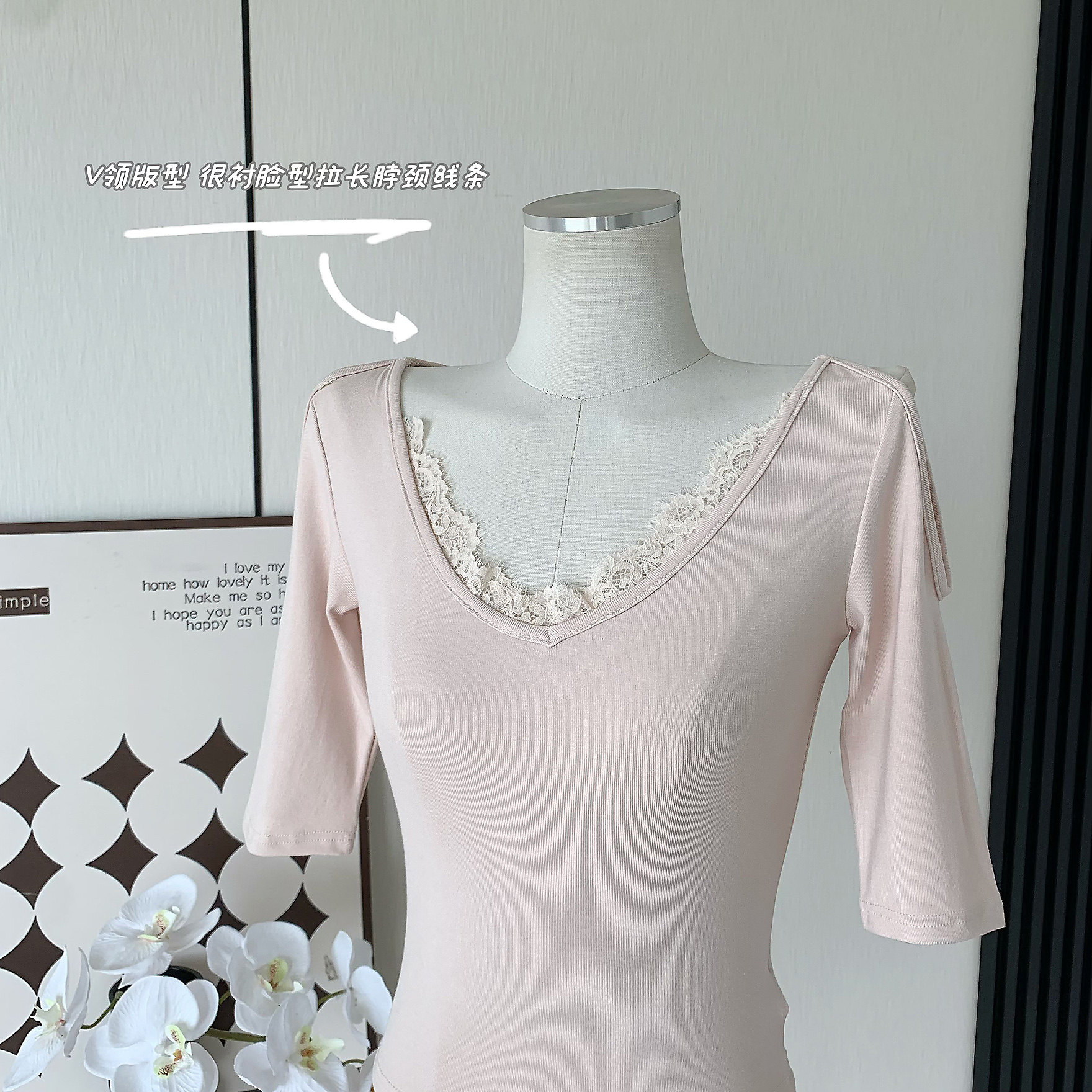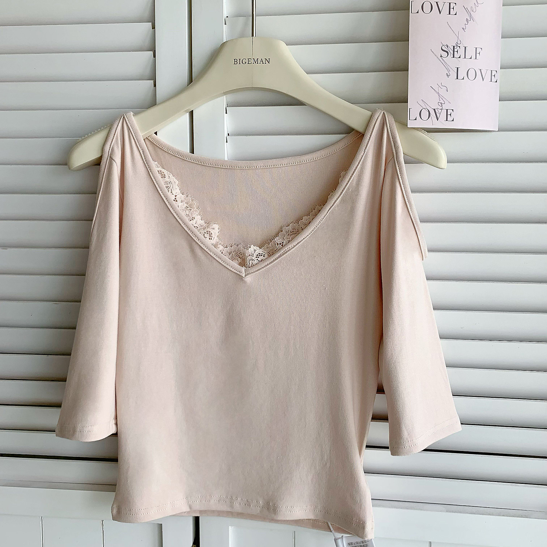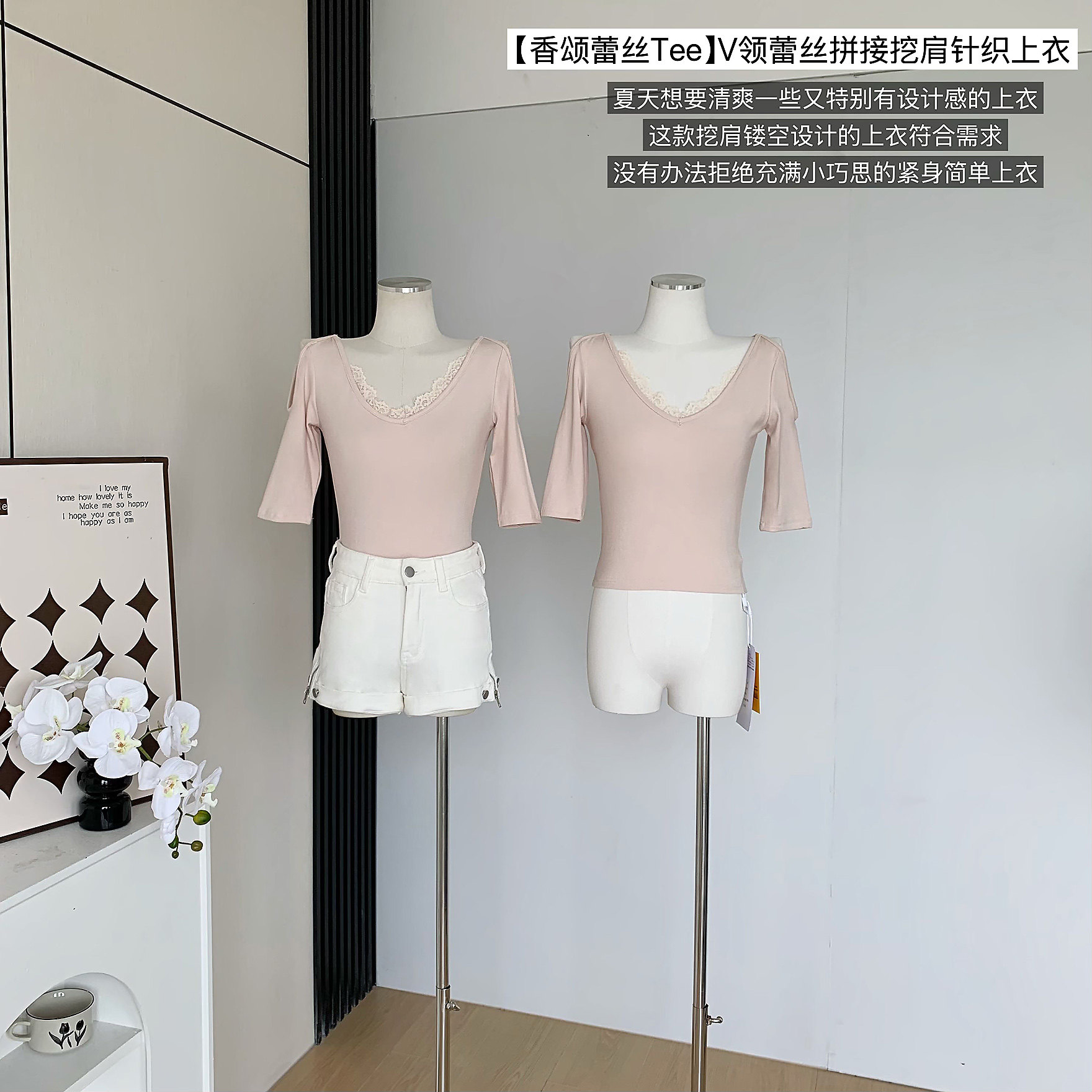 Popw Chanson Lace Tee V Neck Lace Splicing Shoulder-Length Pure Lust Elegant Sexy Slim Knitted Top