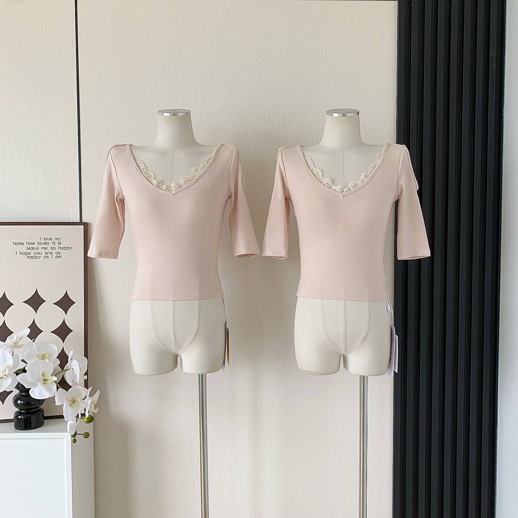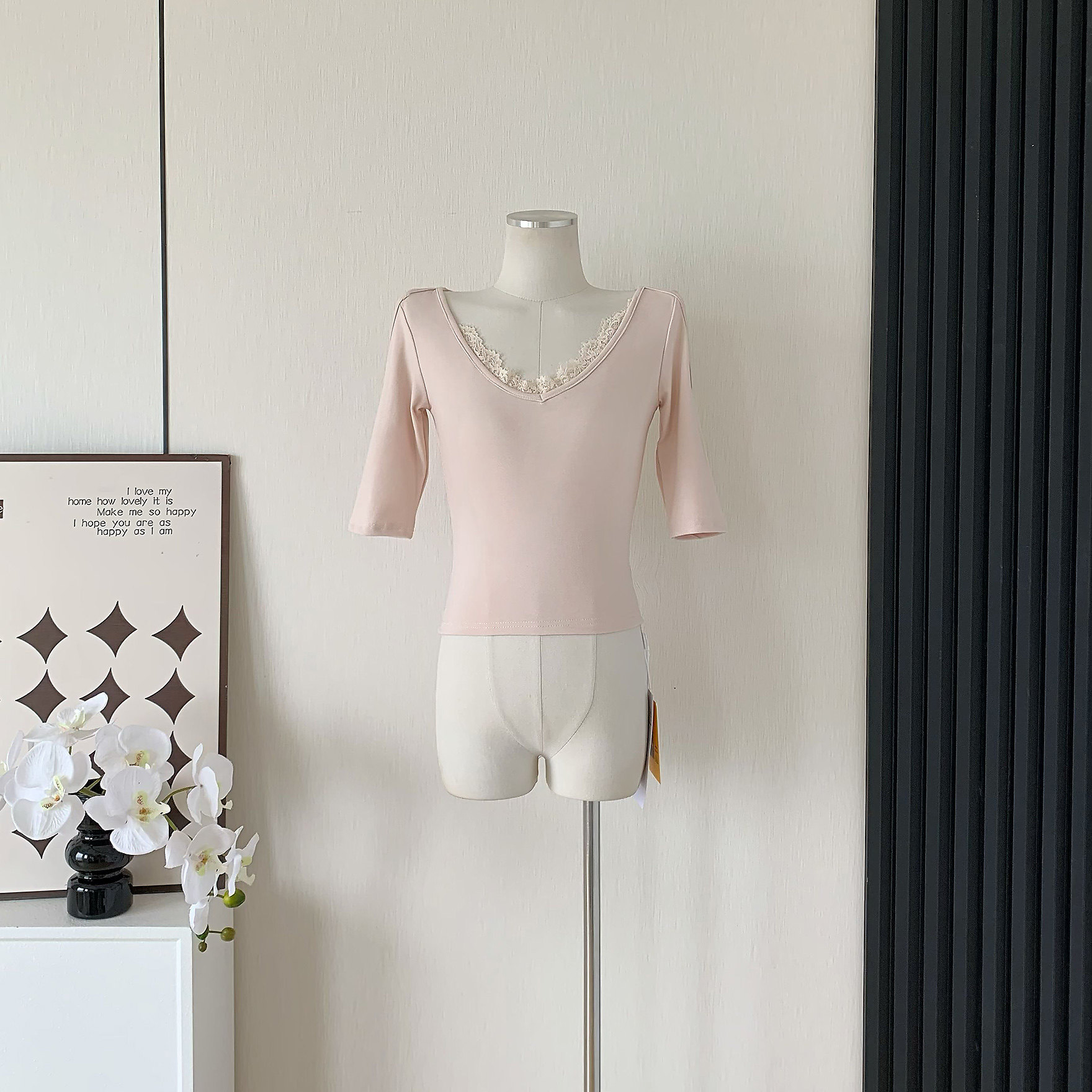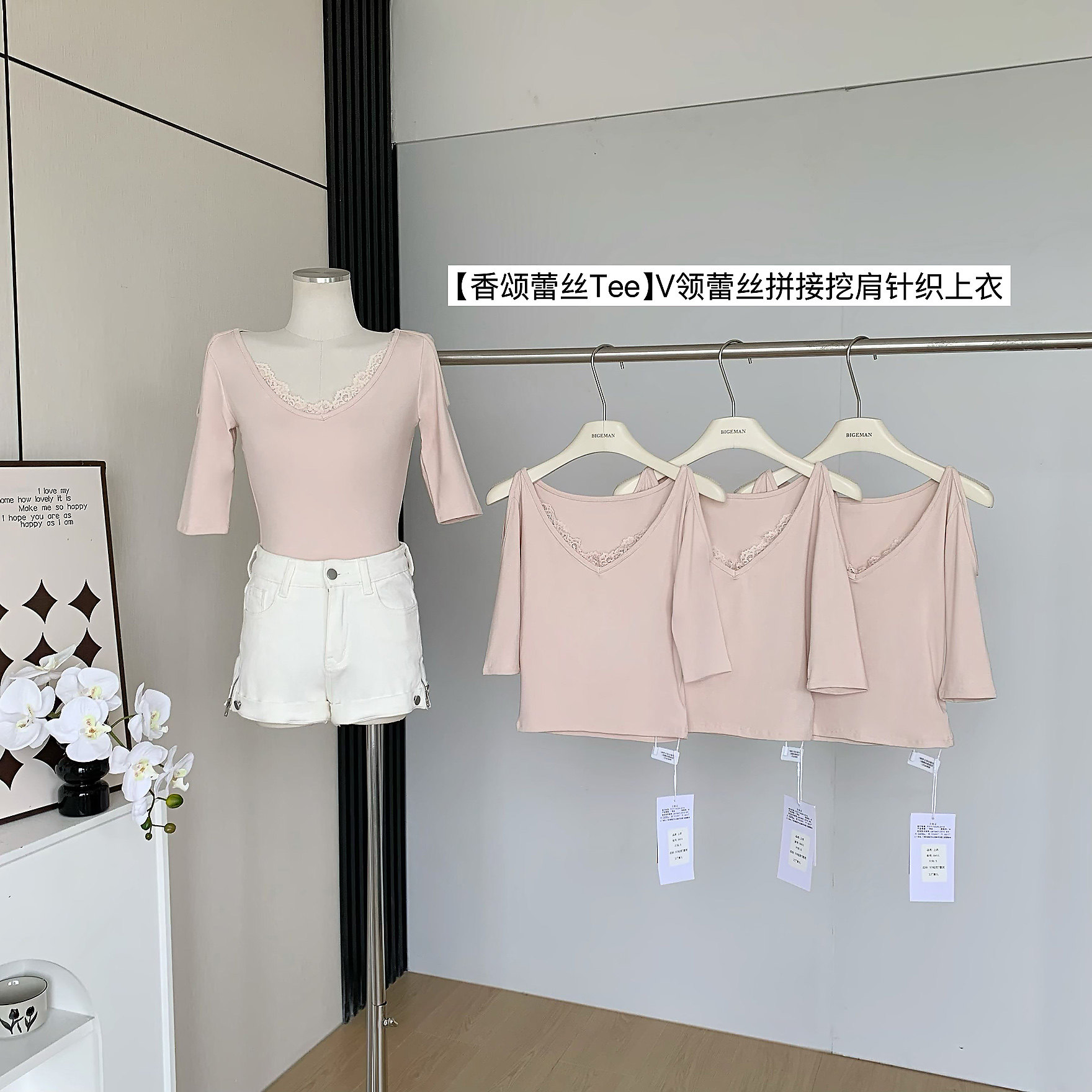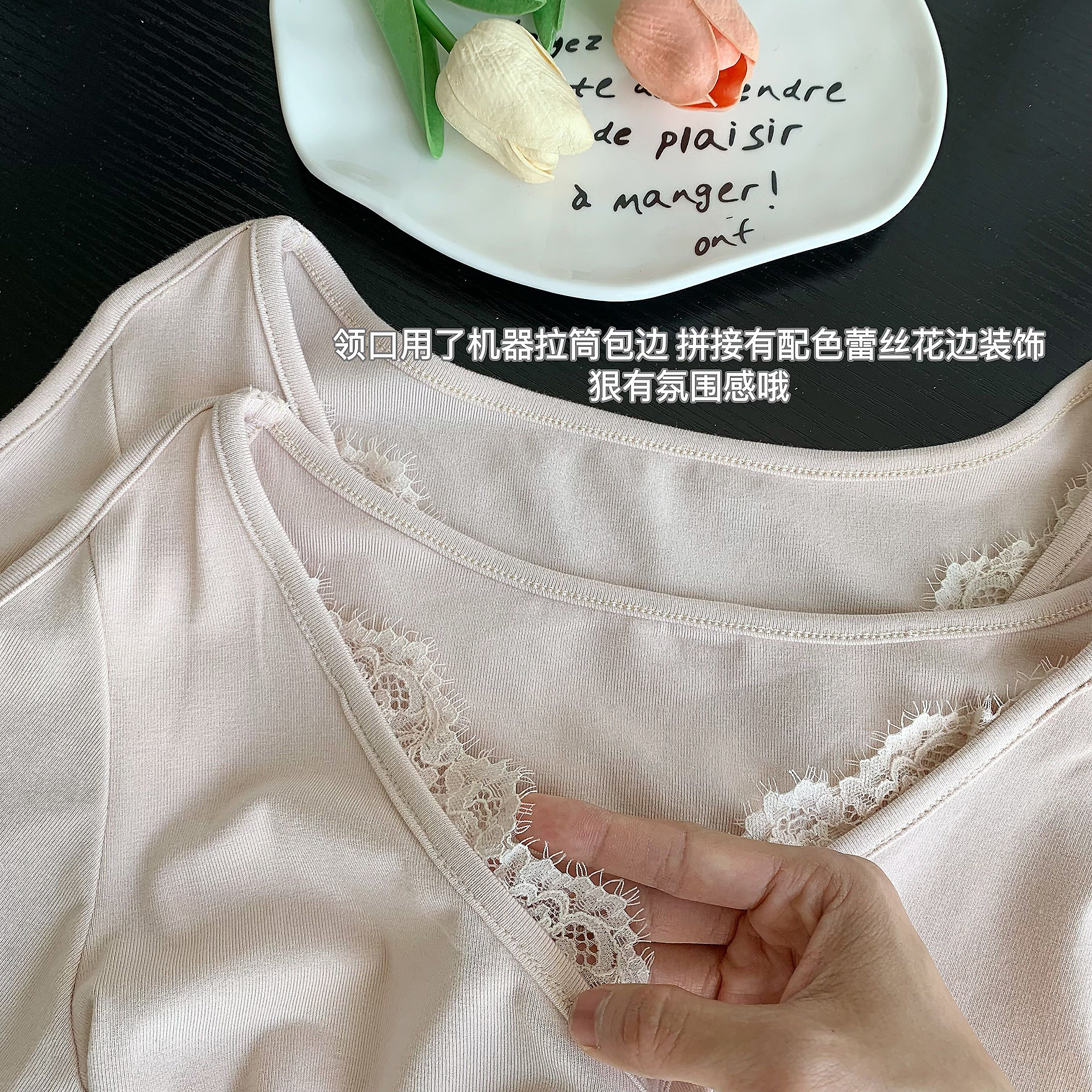 Popw Chanson Lace Tee V Neck Lace Splicing Shoulder-Length Pure Lust Elegant Sexy Slim Knitted Top
