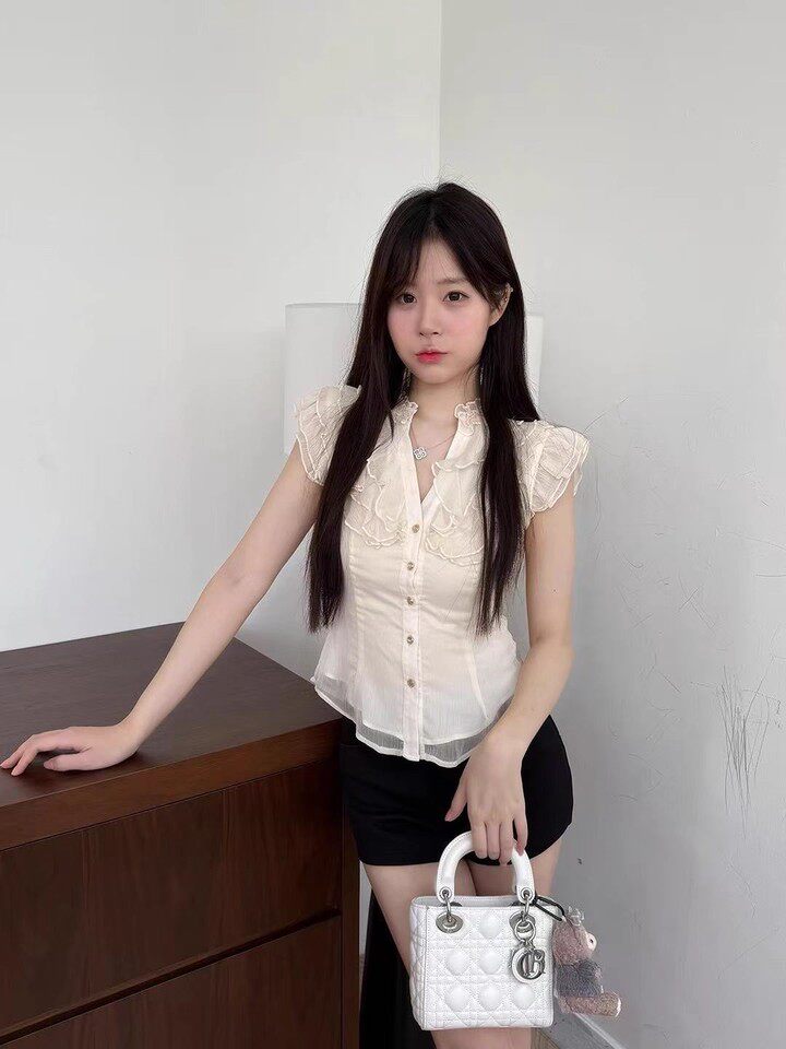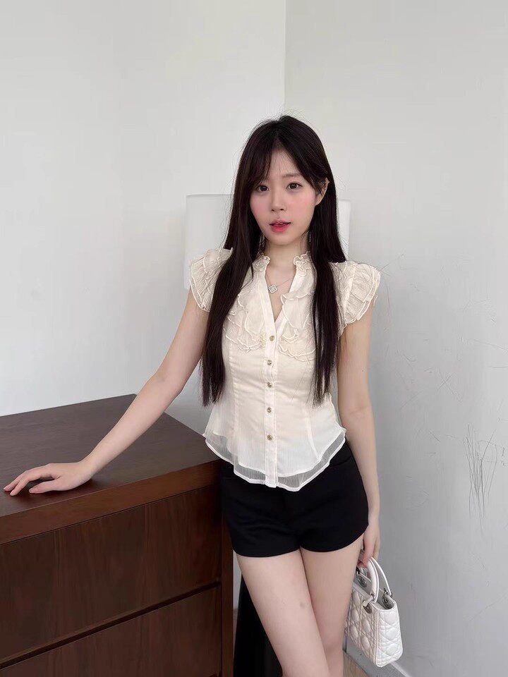 French style ruffled mesh shirt, slim design, V-neck, small flying sleeves, short-sleeved shirt, top for women, summer
