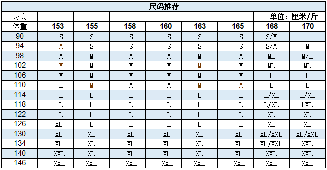 China (cm) 160-165/84-86 165-170 / 88-90 167-172 / 92-96 168-173 / 98-102 170-176 / 106-110