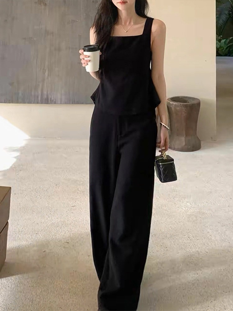 Korean high-end temperament suit for women, summer style strapless sleeveless top, high-waisted wide-leg pants two-piece set