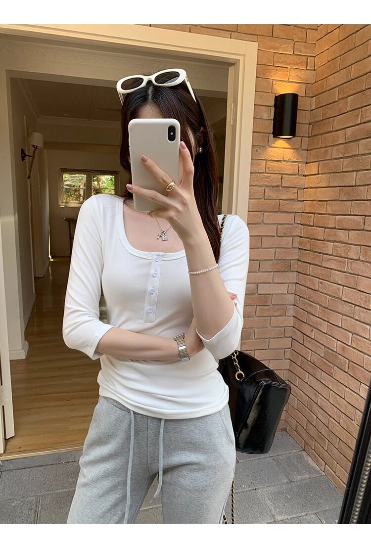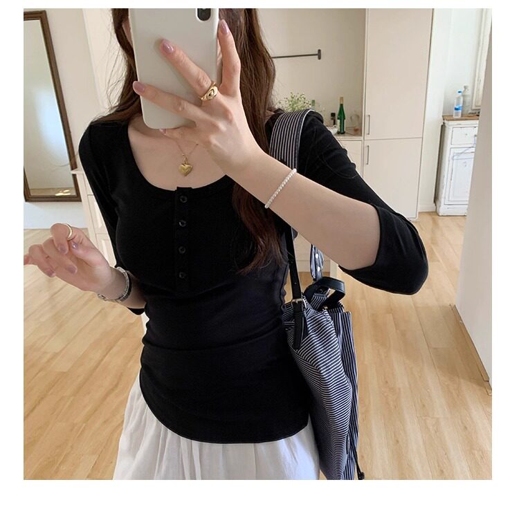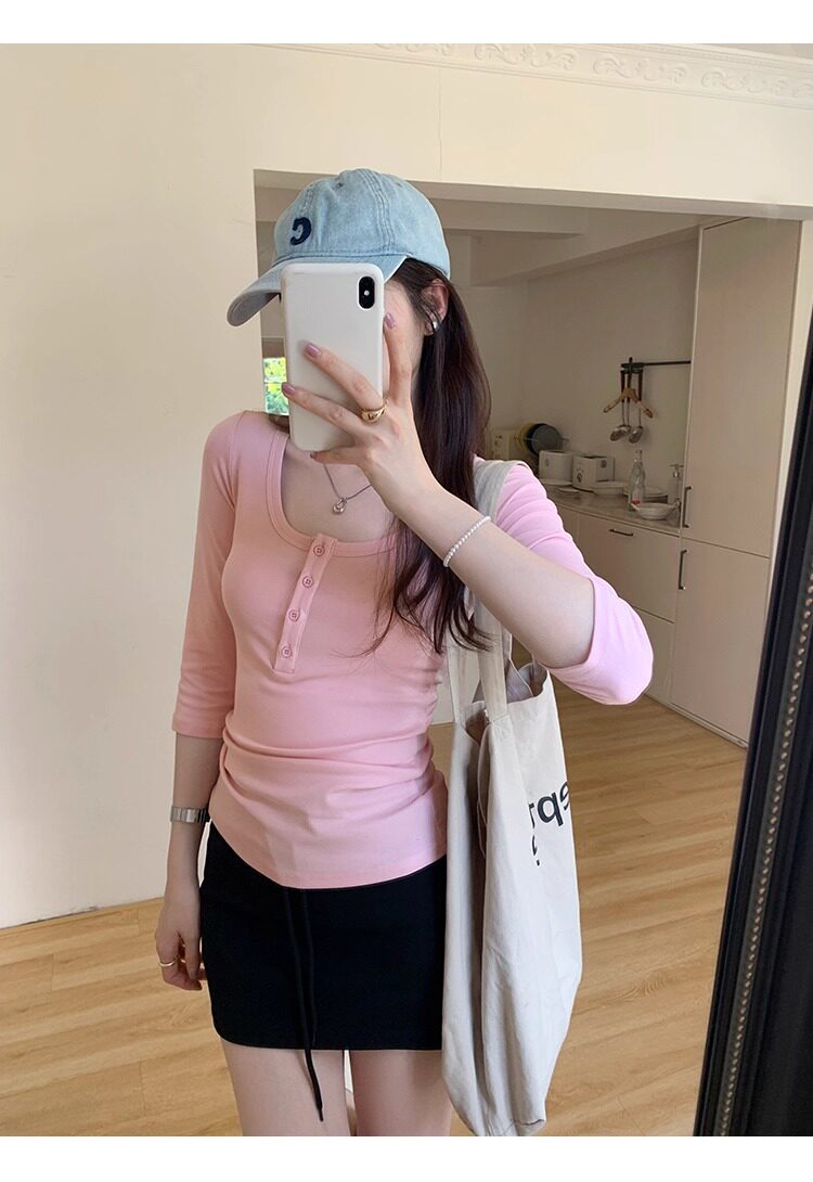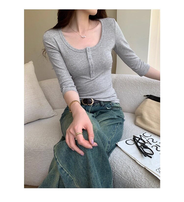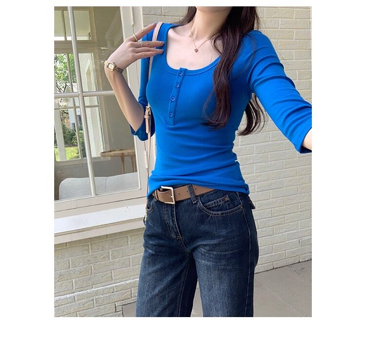 Klein Blue U-Neck Mid-Sleeve T-Shirt for Women, Summer Low-Neck, Revealing Collarbone, Regular Shoulder, Slim Fit, Versatile Half-Sleeve Base Shirt Top
