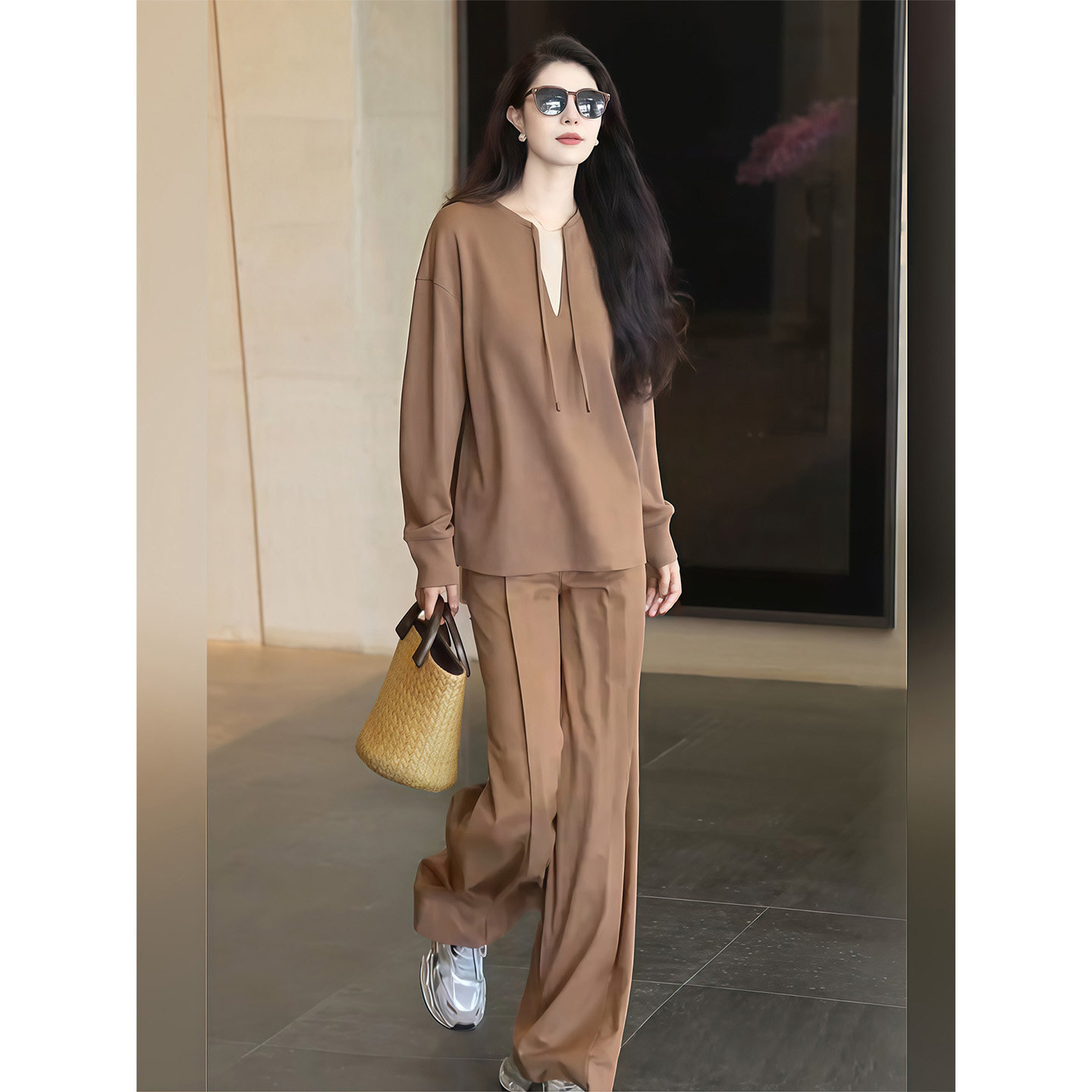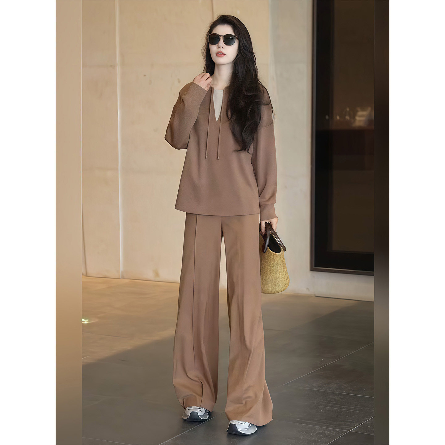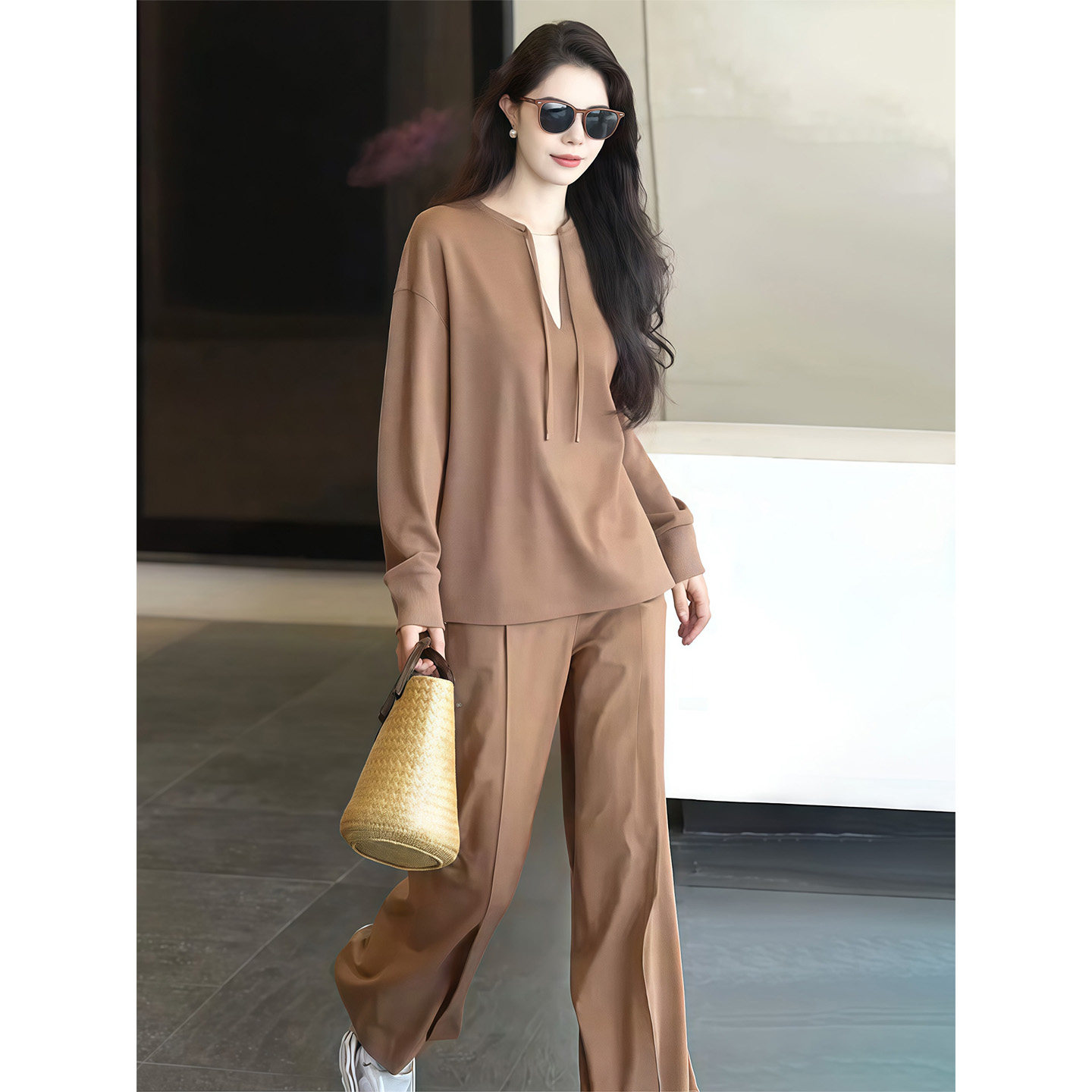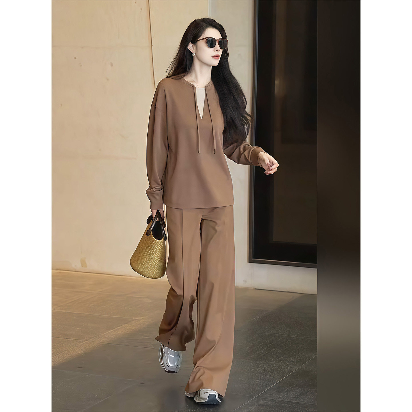 Simple fashionable casual suit for women spring 2026 coffee color temperament age-reducing drawstring top high-waisted trousers two-piece set