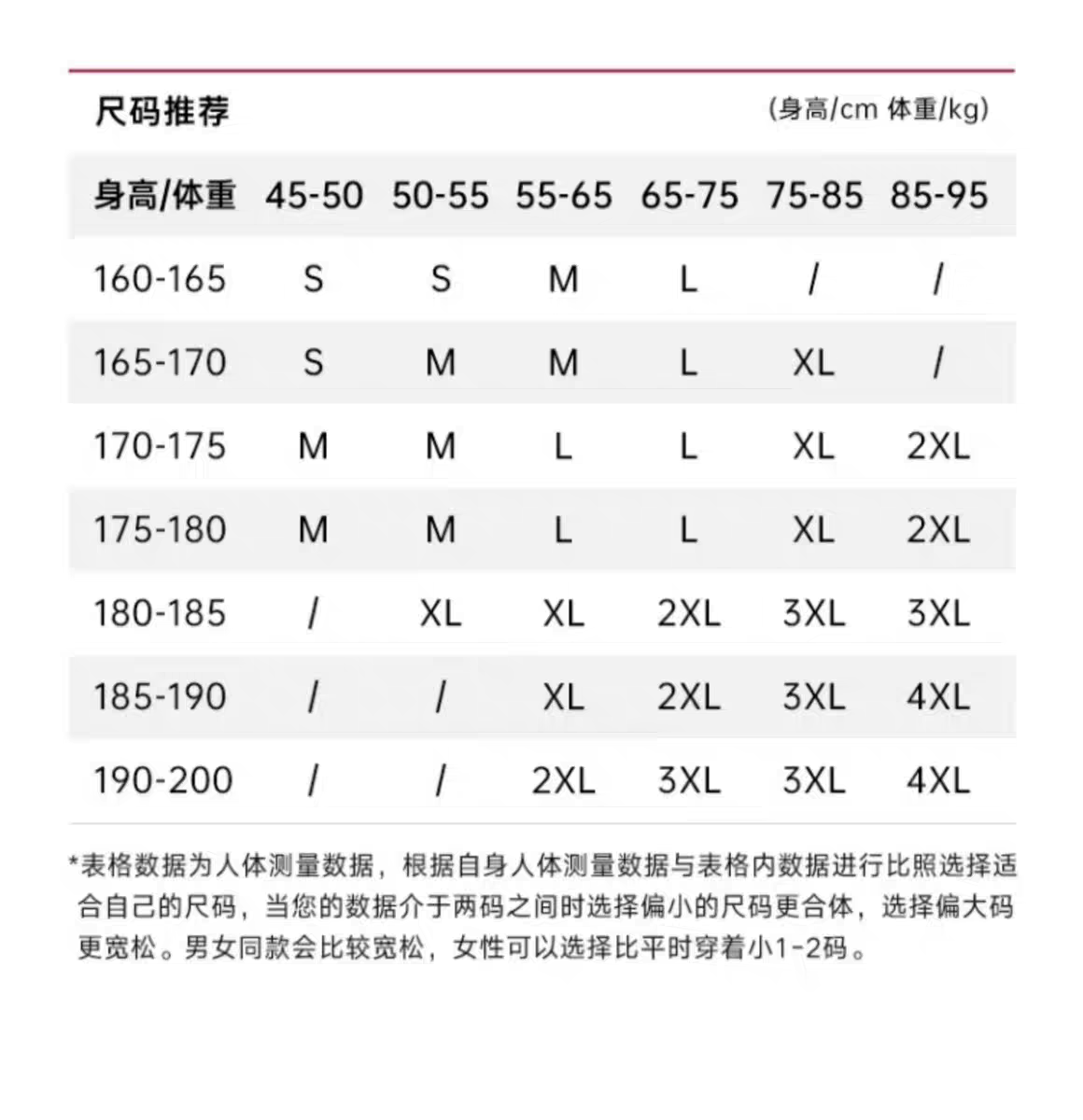 China (cm) 160-165/84-86 165-170 / 88-90 167-172 / 92-96 168-173 / 98-102 170-176 / 106-110