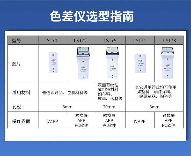 Color Classification Ls170 App Operation [Paper Packaging and Printing],Ls171 Ordinary Model [Paint Plastic Metal],Ls172 Touch Screen Model [Commonly Used in Paper Packaging, Printing and Other Industries],Ls173 Touch Screen Model [Commonly Used in Paint, Plastic, Metal and Other Industries],Ls175 Large Diameter Model [Textile Fabric Texture],Ls176 Spectrophotometer (Touch Screen Model),Ls155 Color Difference Haze Meter and Transmittance Meter Three-In-One,Ls177 Desktop 50mm Large Diameter Colorimeter,Ls178 Small Aperture 1mm Spectrophotometer