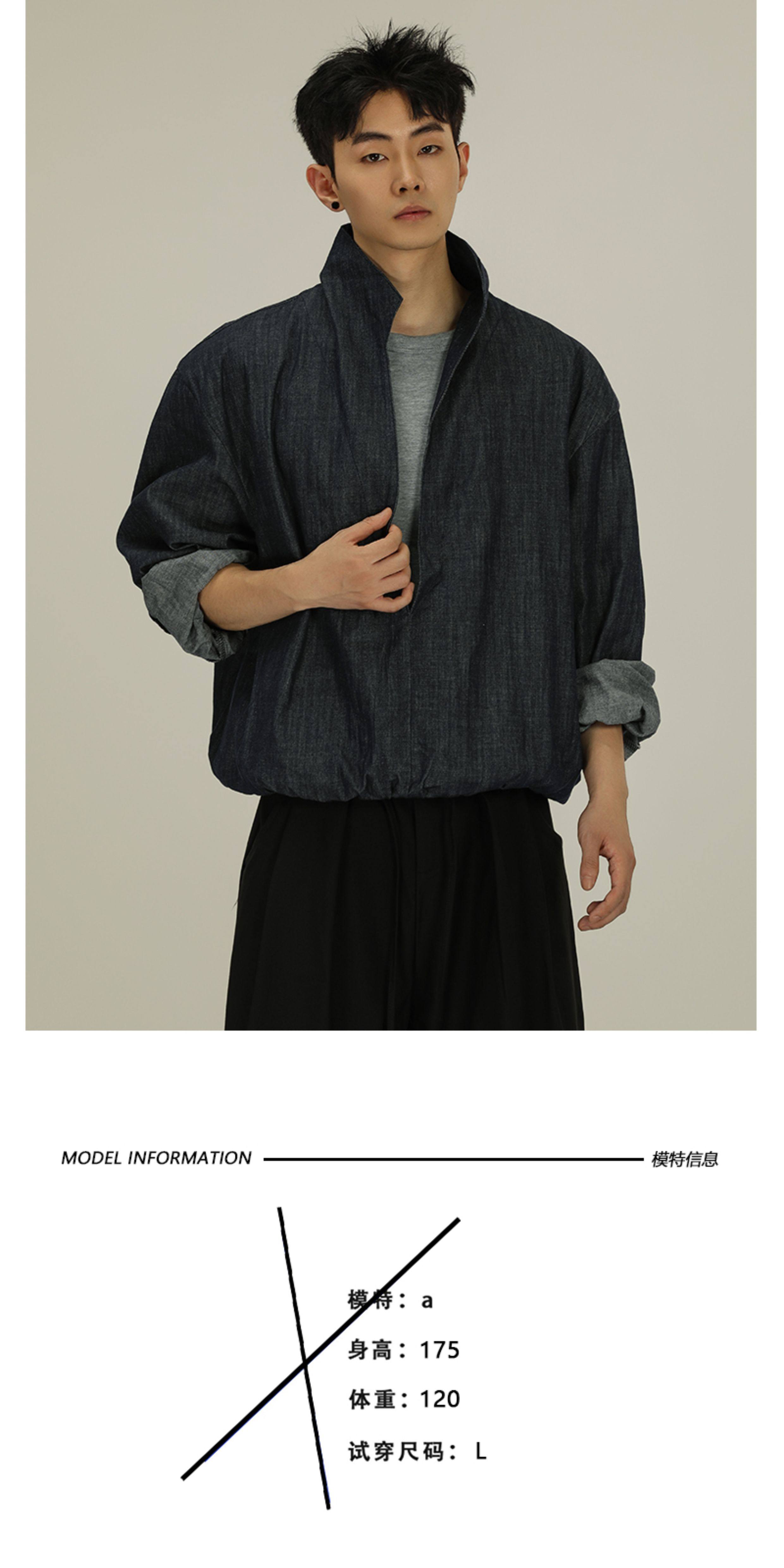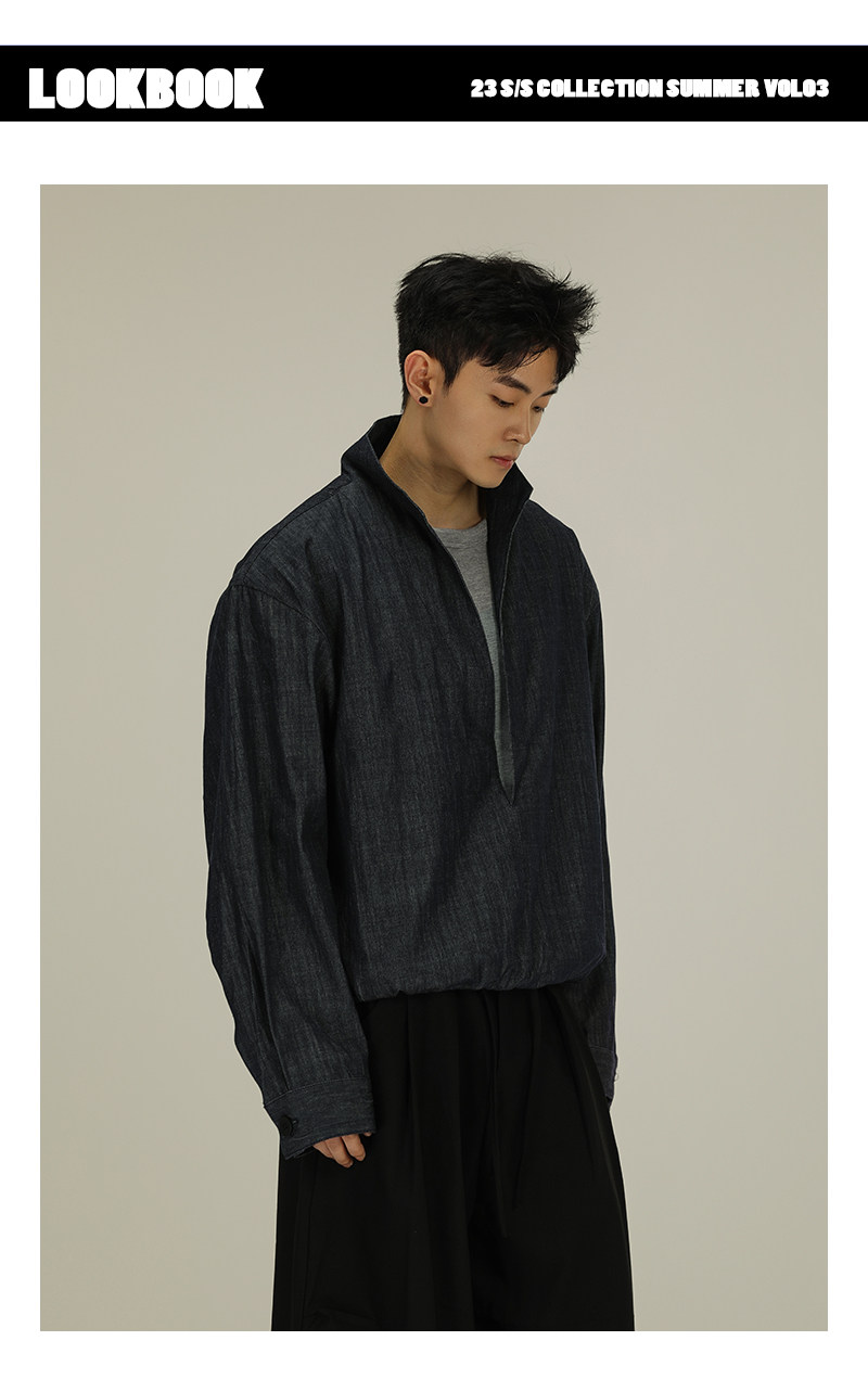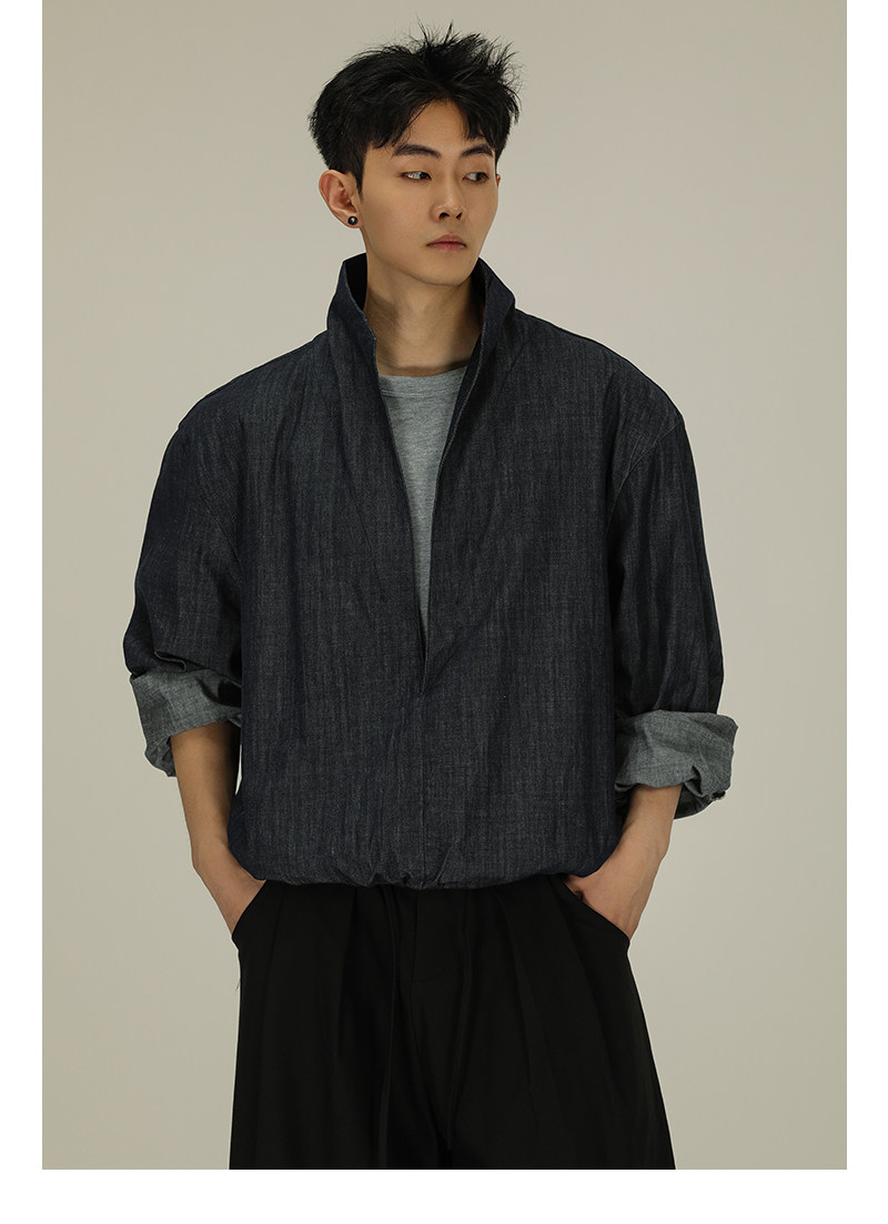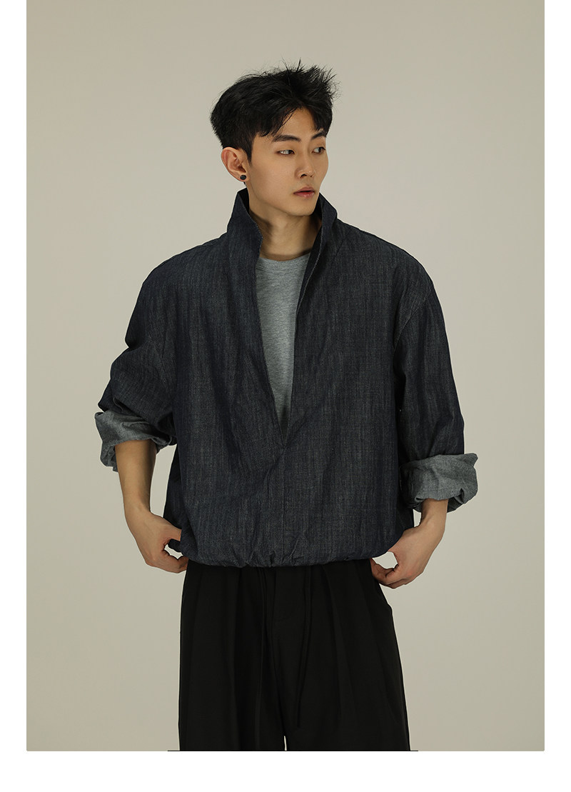 A Carton American-Style Original Denim Faux Two-Piece V-Neck Jacket, Loose Fit, Unisex Pullover Design, Stand Collar, Thin Coat, Trendy
