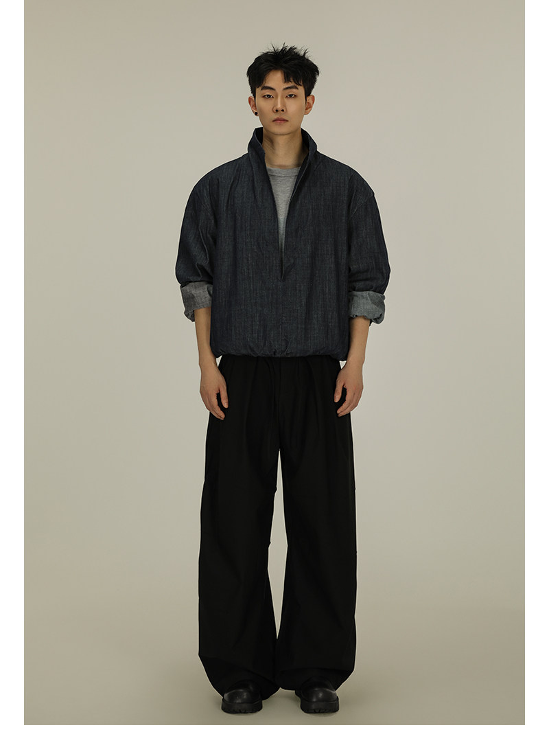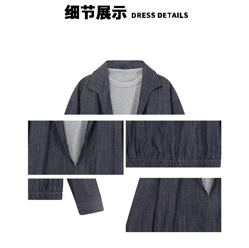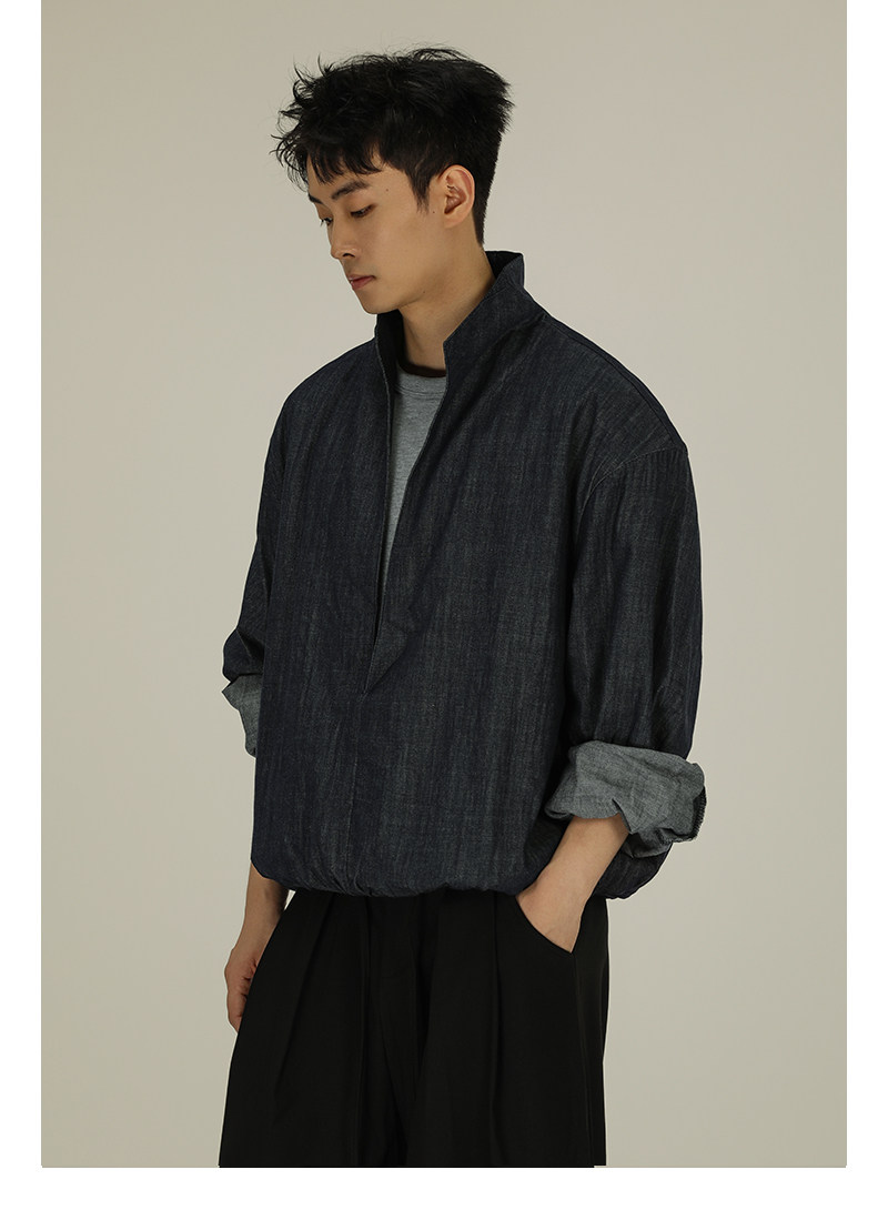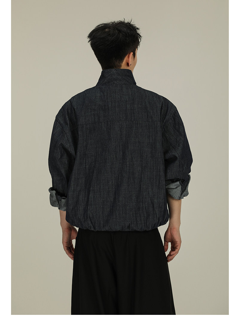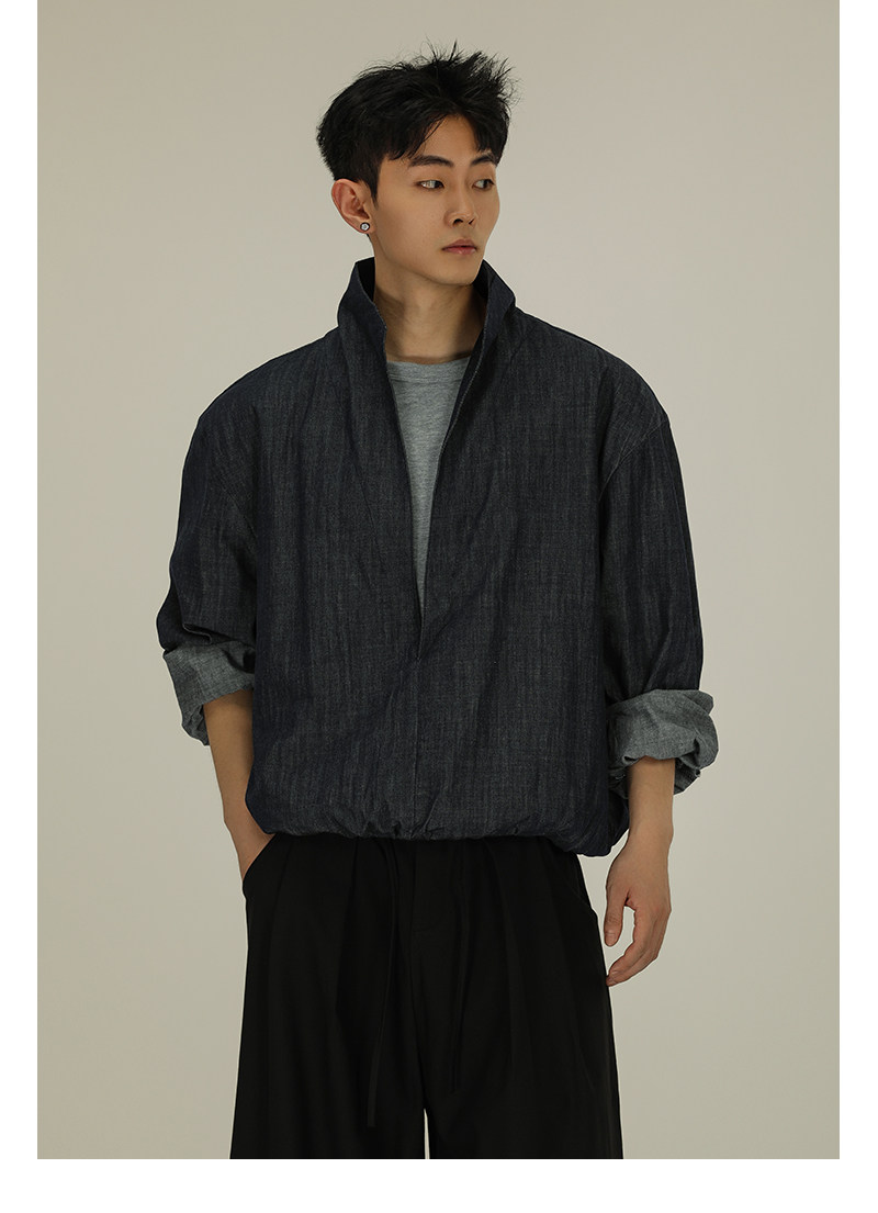 A Carton American-Style Original Denim Faux Two-Piece V-Neck Jacket, Loose Fit, Unisex Pullover Design, Stand Collar, Thin Coat, Trendy