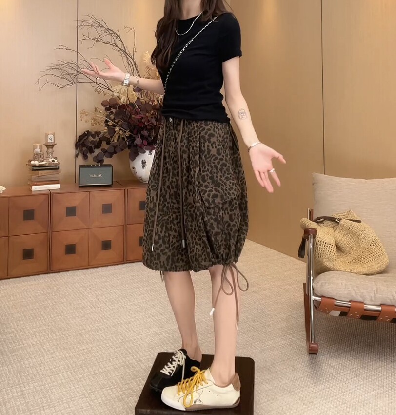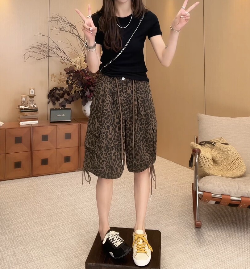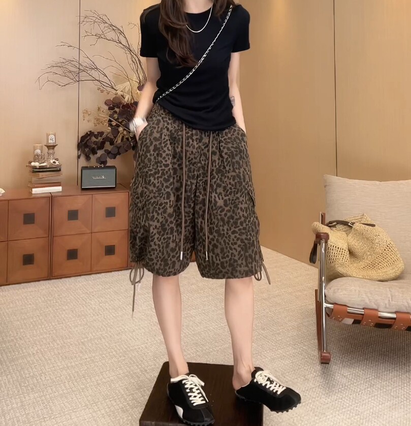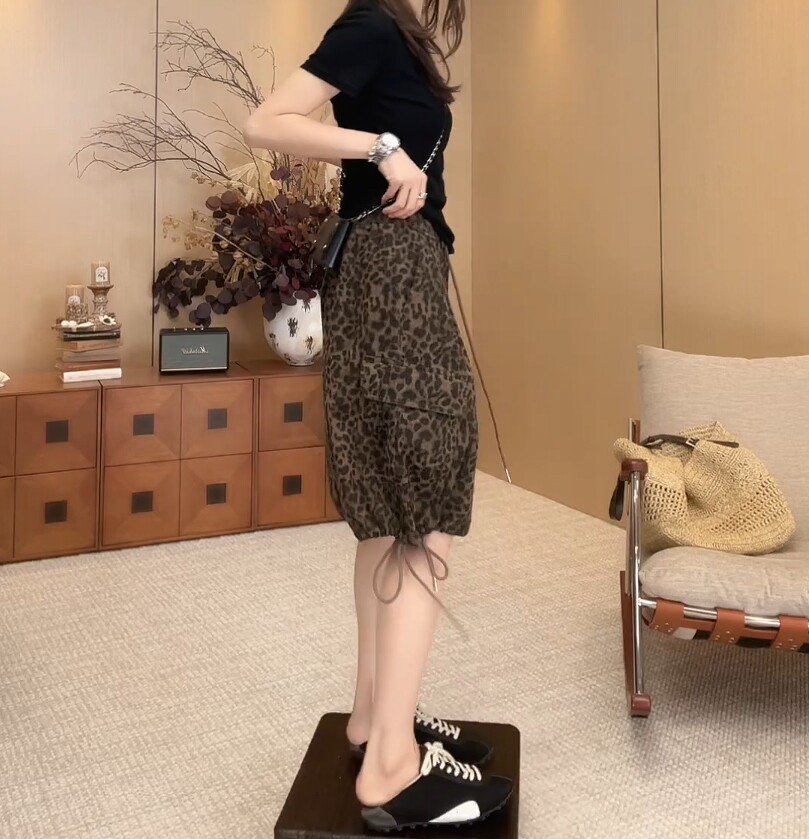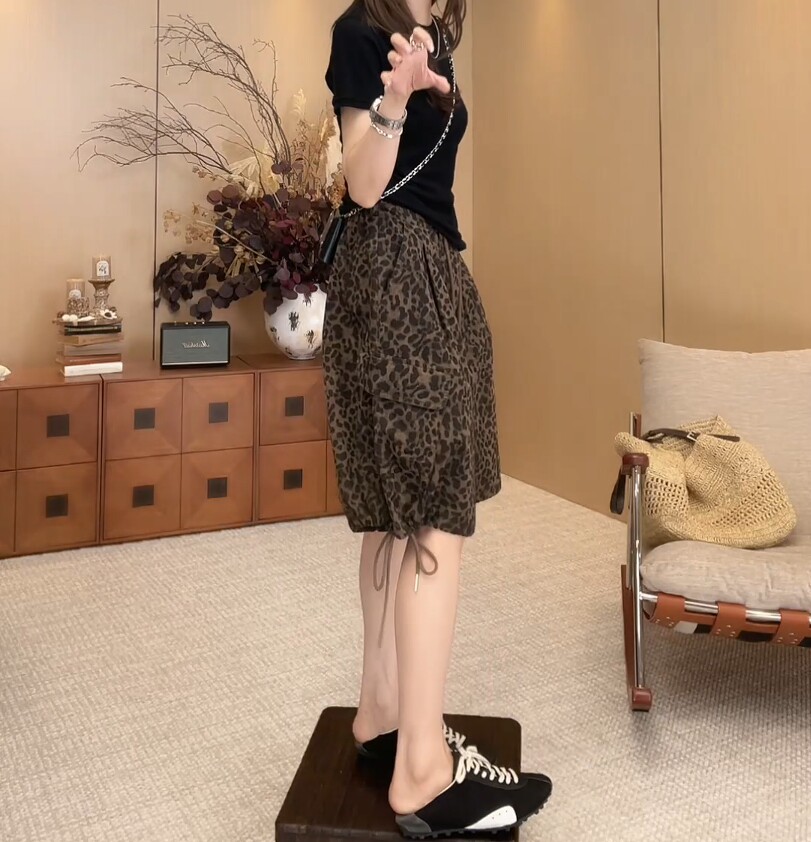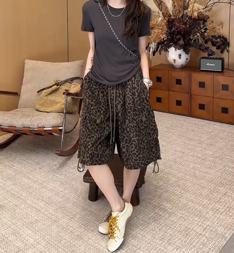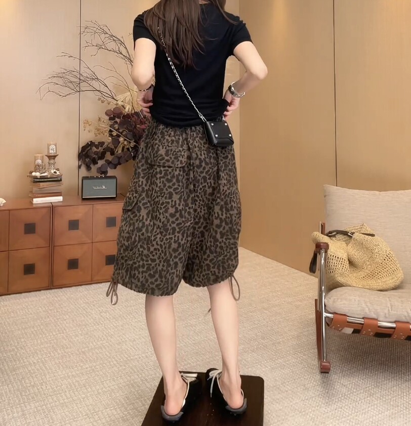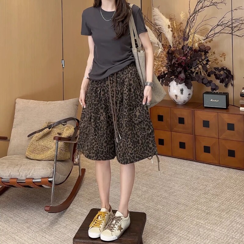 European Leopard Print Wide Leg Shorts Women's Summer New Large Size Pear Shape High Waist Slim Drawstring A-Line Five-Point Pants