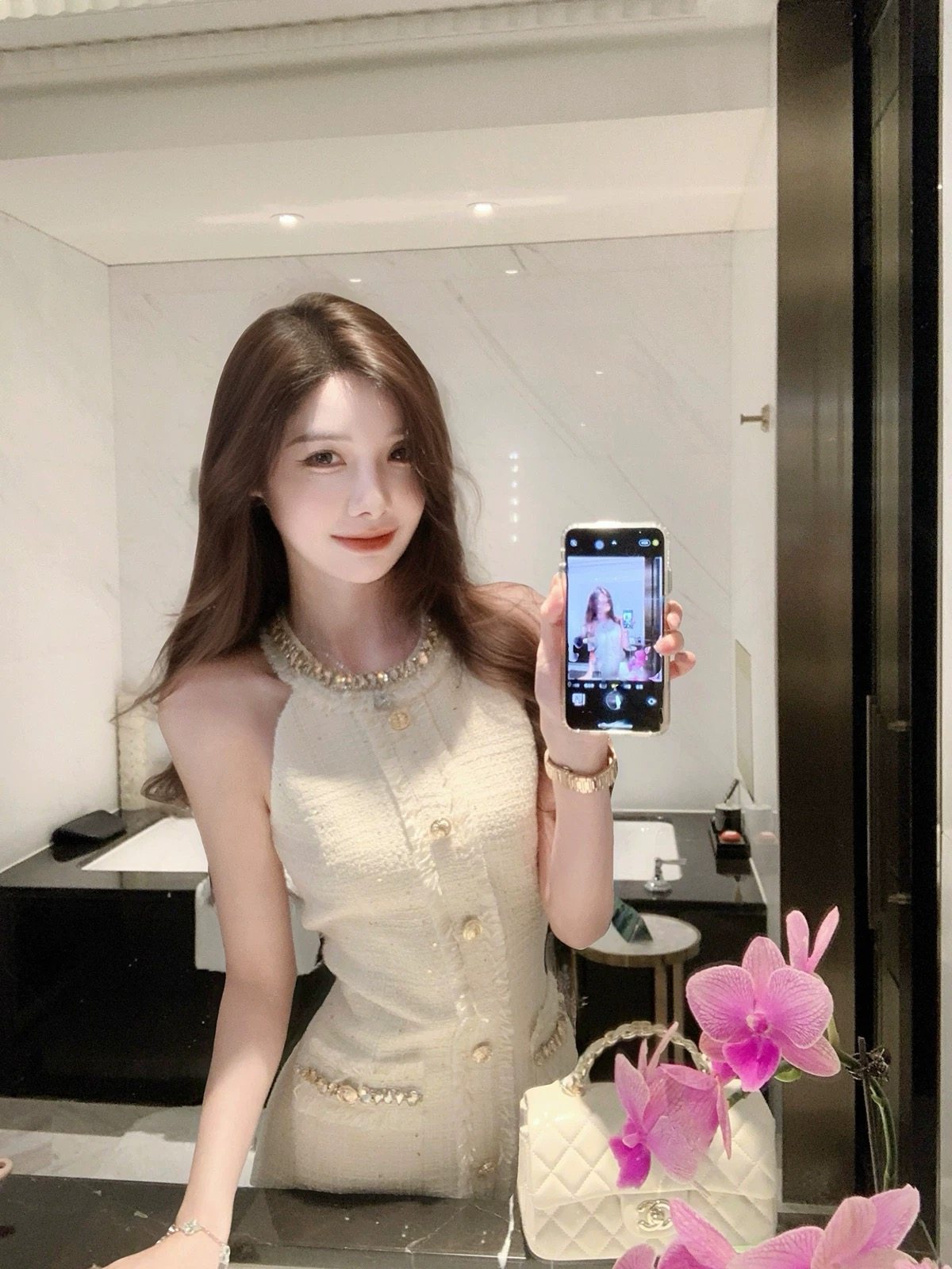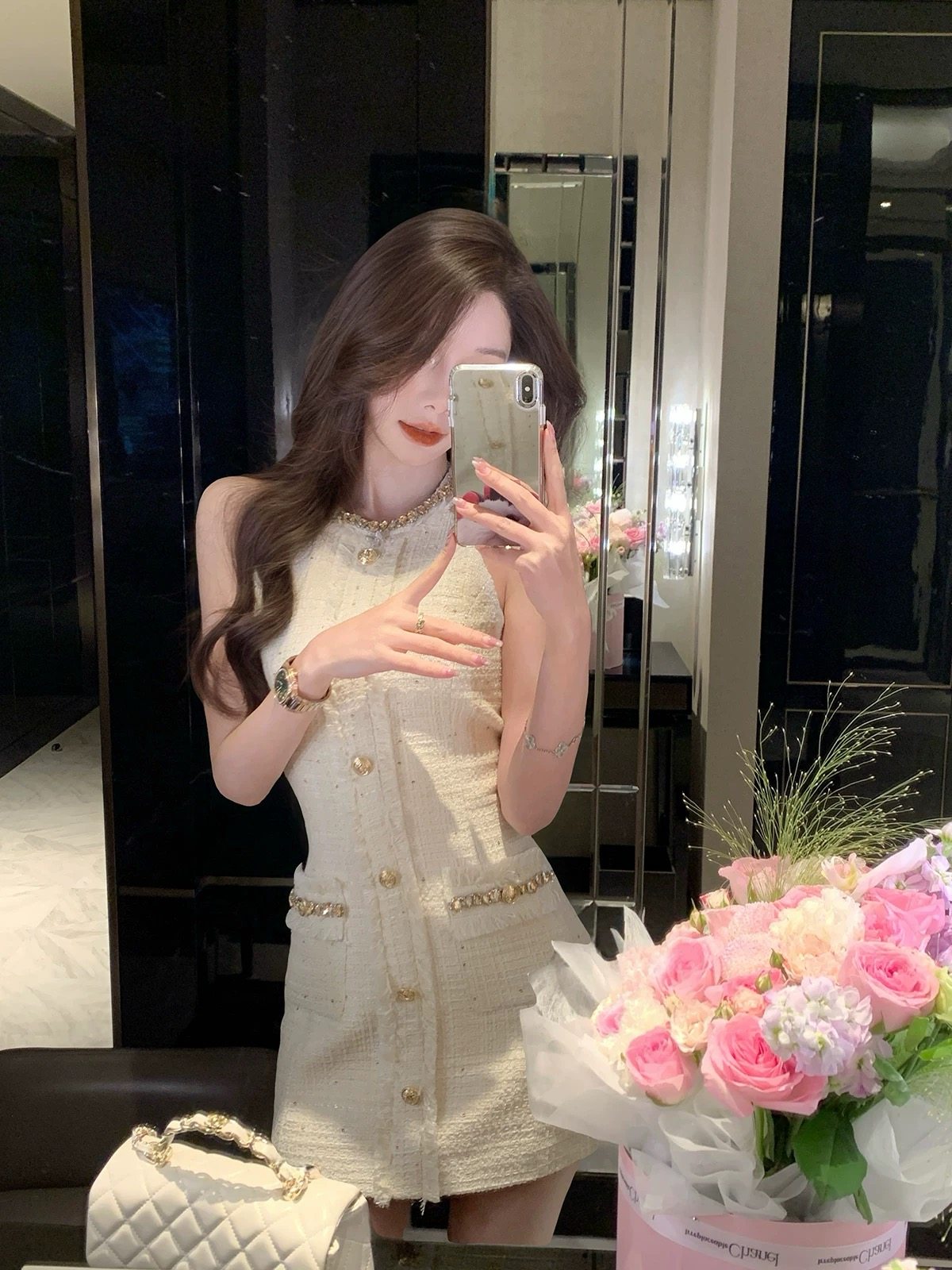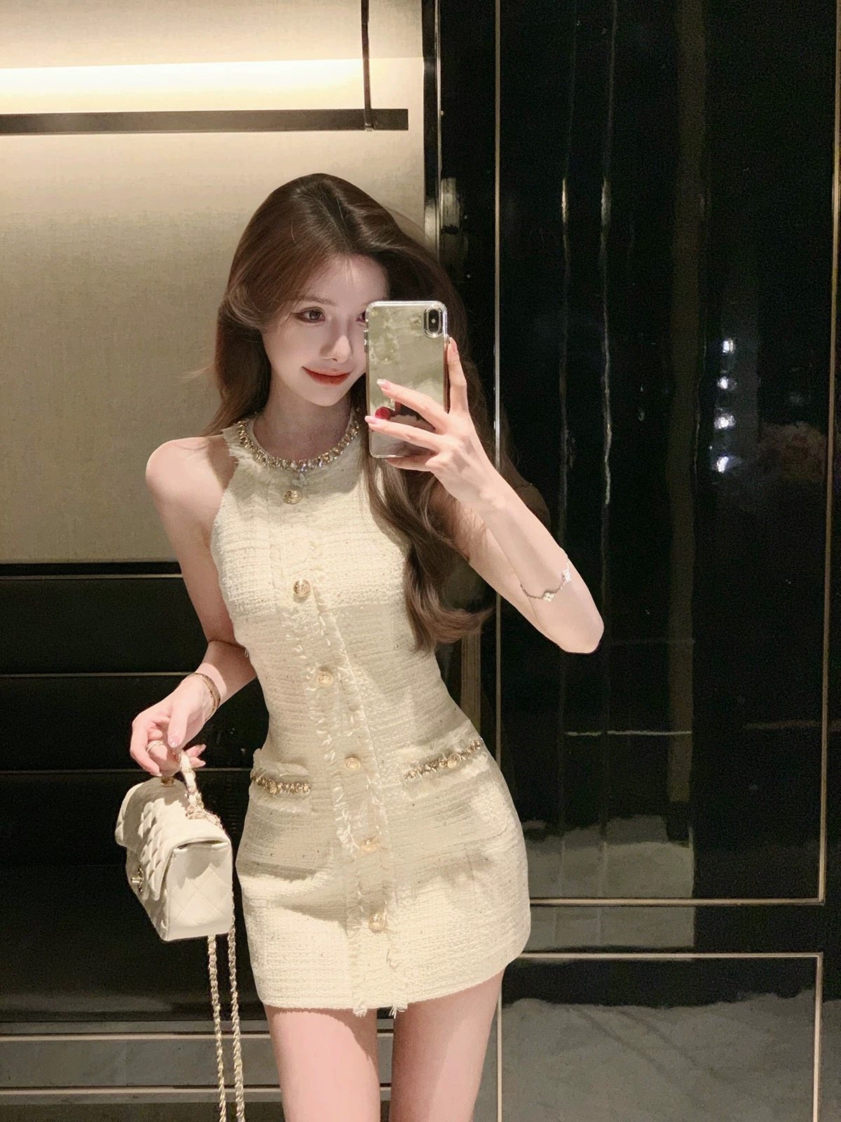 French-Style Gold-Button Chanel-Inspired Dress for Women, 2025 Summer New Sleeveless Waist-Cinching Slim-Fit Bodycon Short Dress