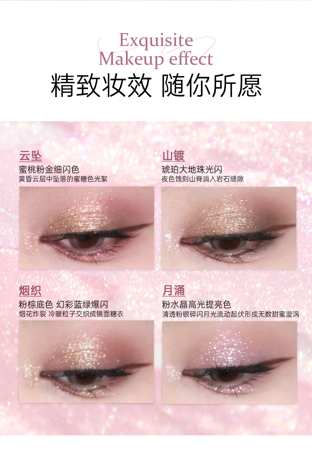 Color Classification 01 Cloud Drop Peach Pink Gold Fine Shimmer❤,02 Mountain Plated Amber Earth Pearl Shimmer❤,03 Smoke Weave Pink Brown Background Green Flash❤,04 Xia Jin Orange Brown Background Pink Gold Bag Flash❤,May Moonlight Rose Quartz Highlighter with Silver Glitter❤