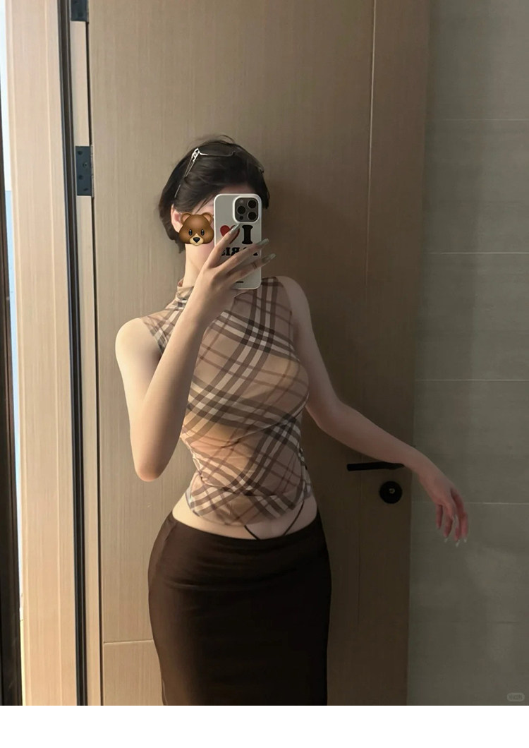 American-Style Half-High Collar Plaid Tight-Fitting Camisole for Women, Summer Retro Design, Sleeveless Outerwear, Thin Top