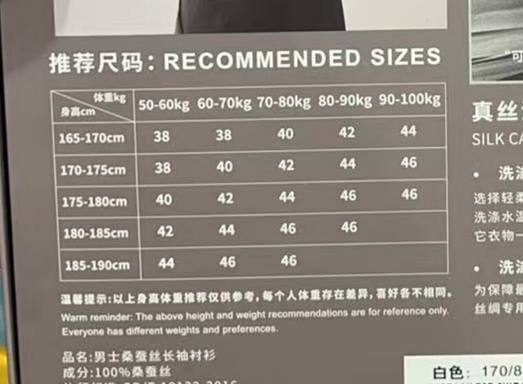 China (cm) 160-165/84-86 165-170 / 88-90 167-172 / 92-96 168-173 / 98-102 170-176 / 106-110