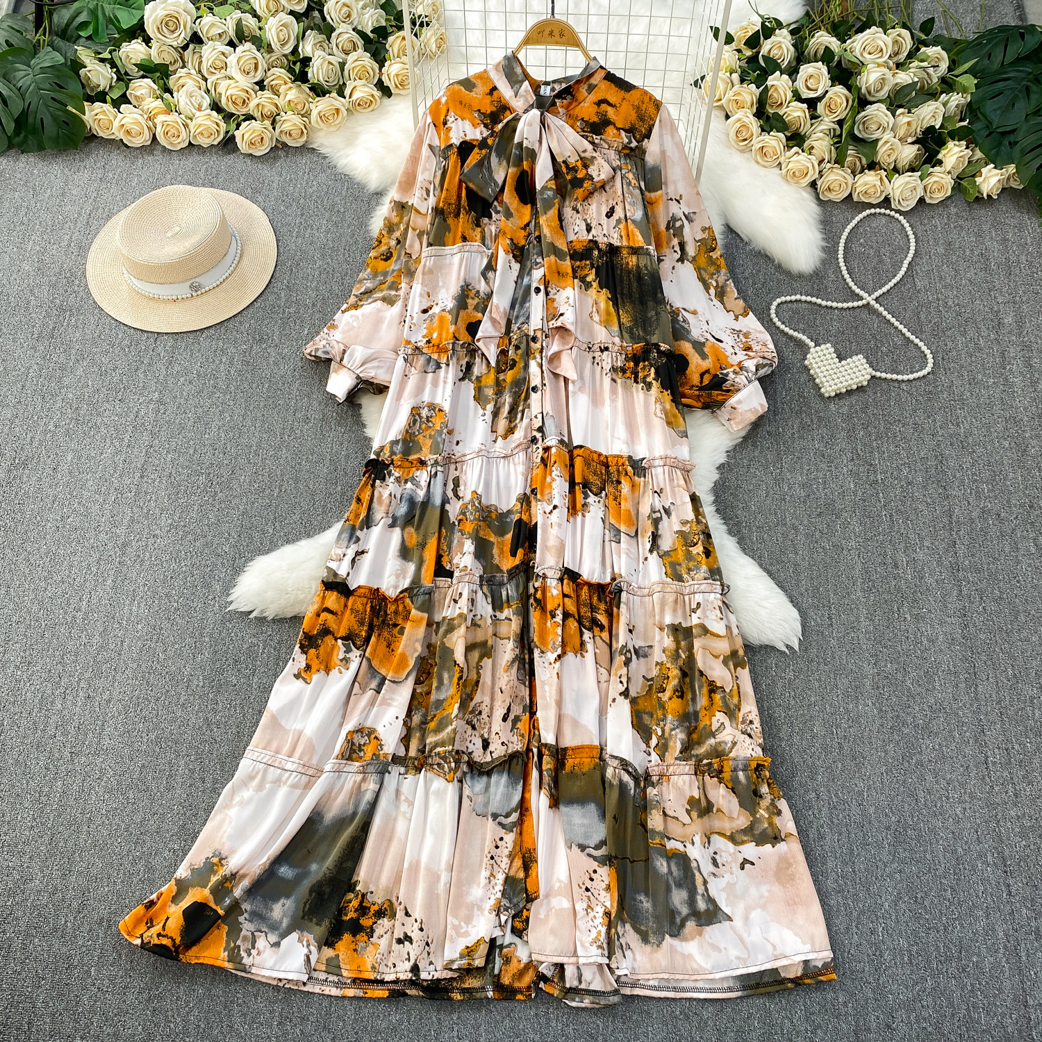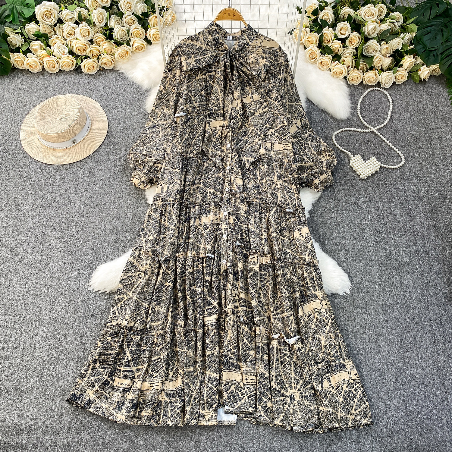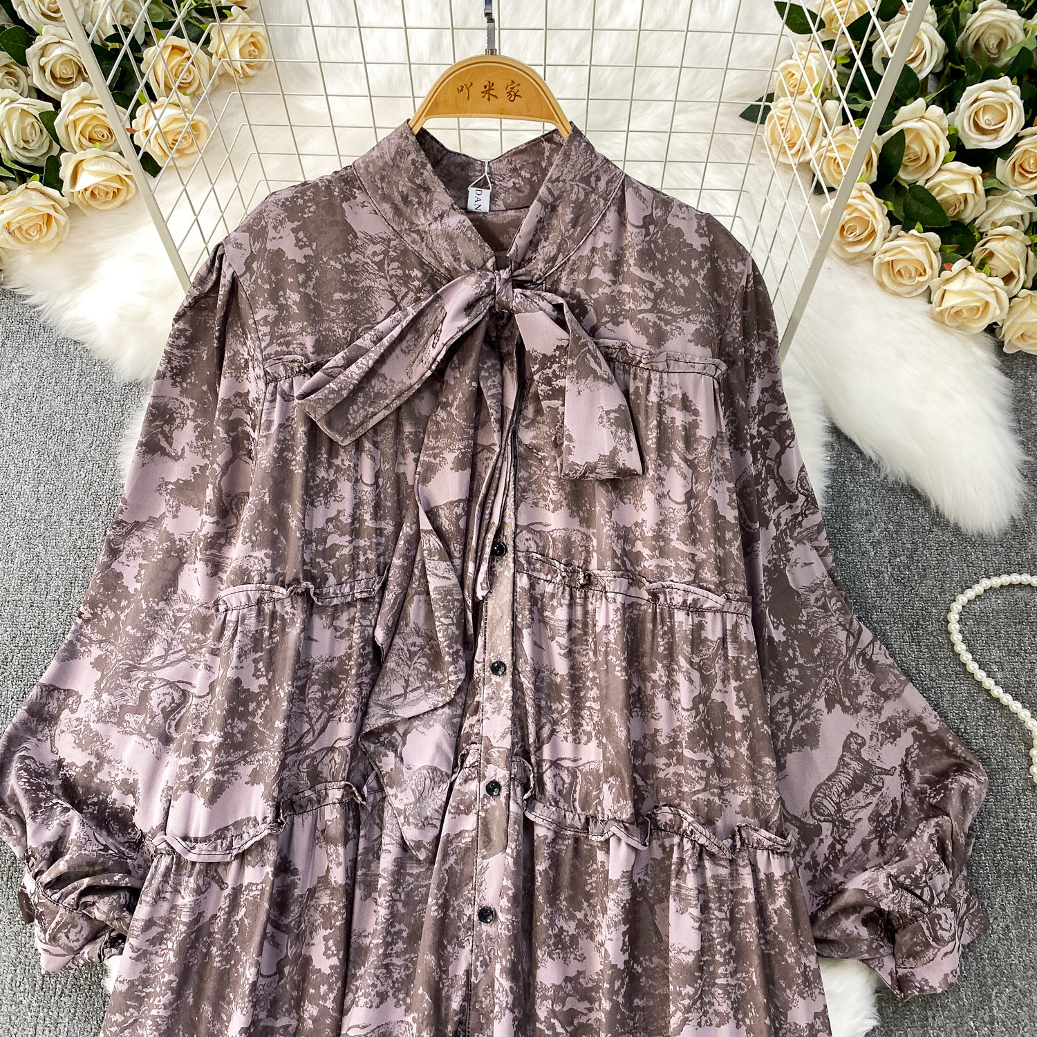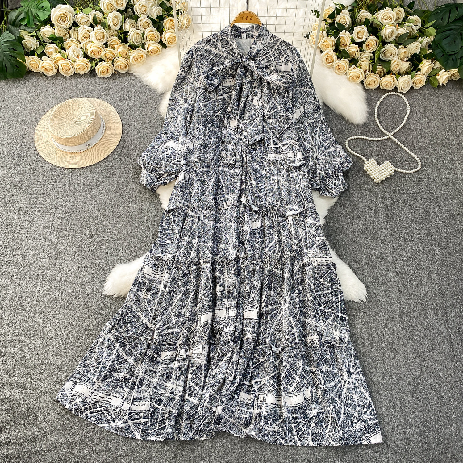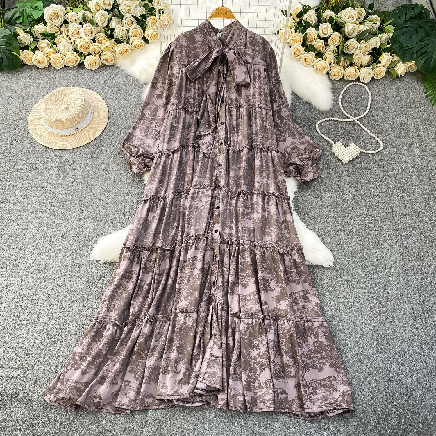 French-Style Light Mature Print Lace-Up V-Neck Long-Sleeve Dress for Women, Autumn Loose Fit, Tummy-Concealing, Slimming, Ruffled Long Dress