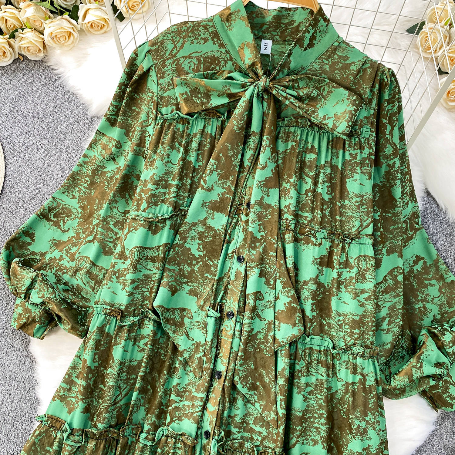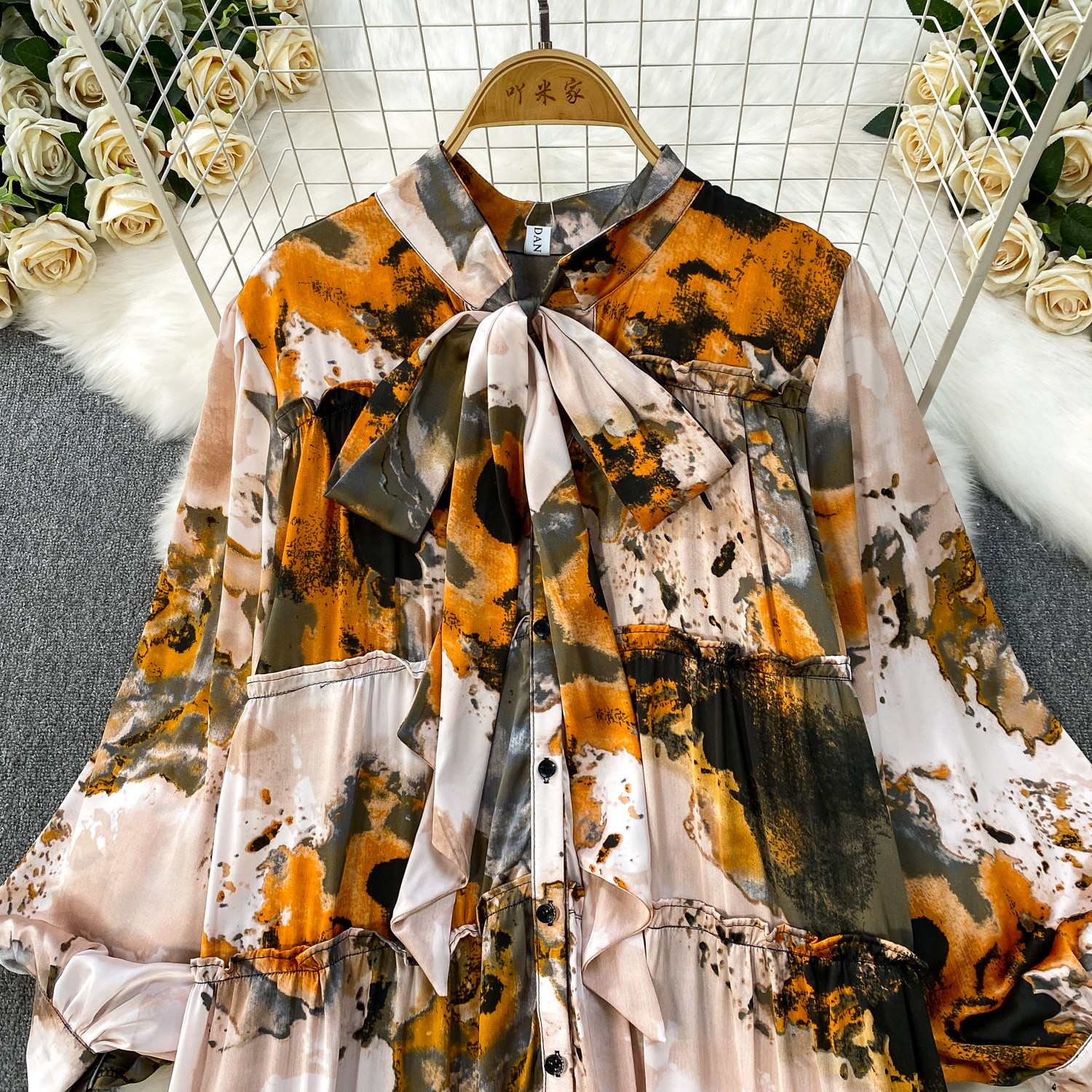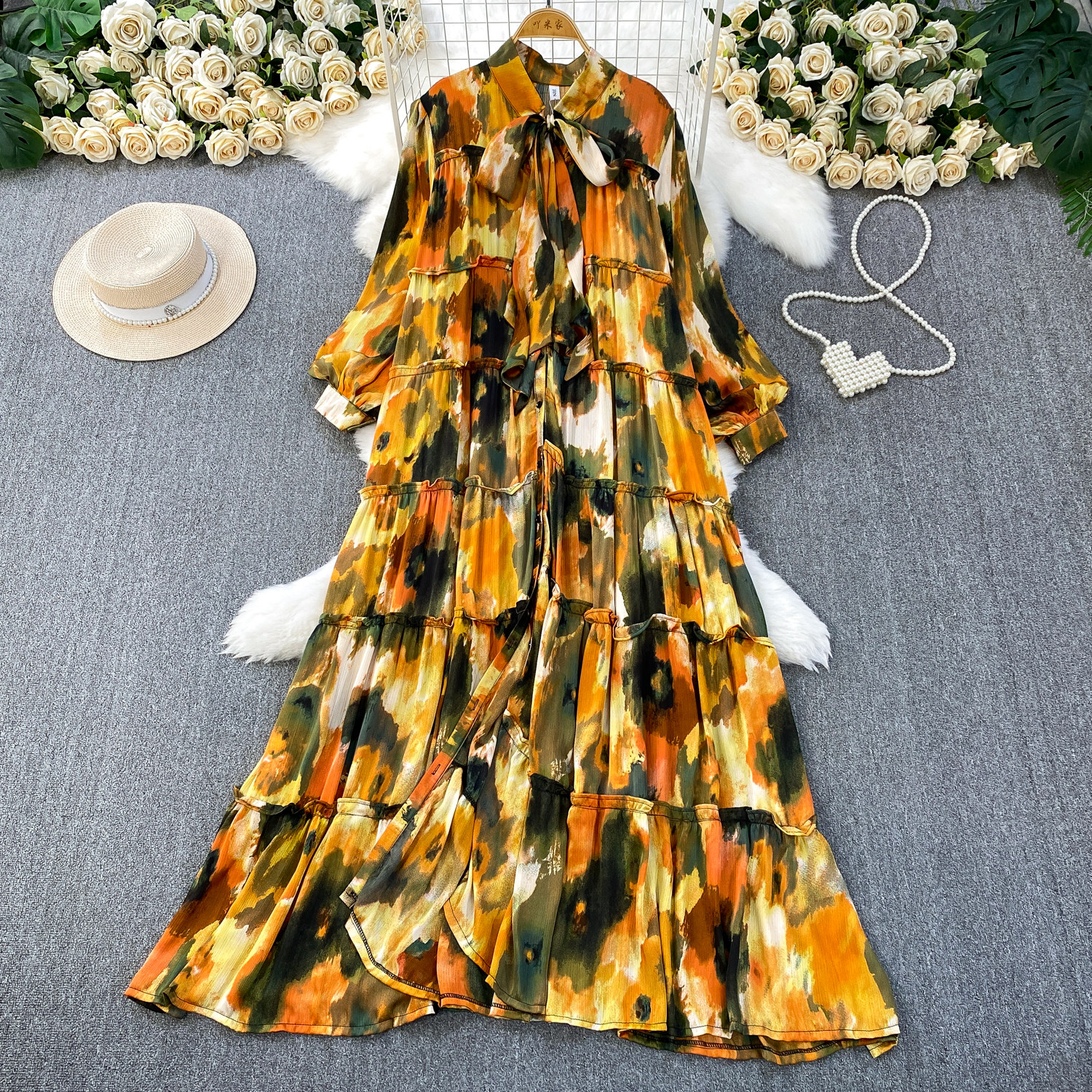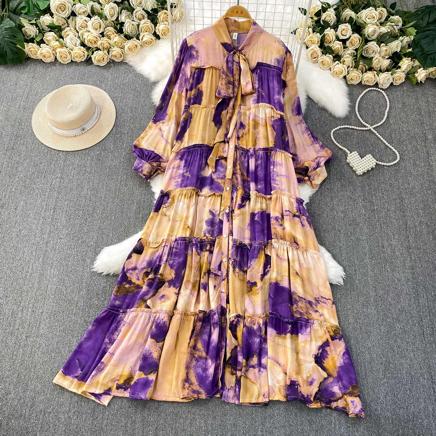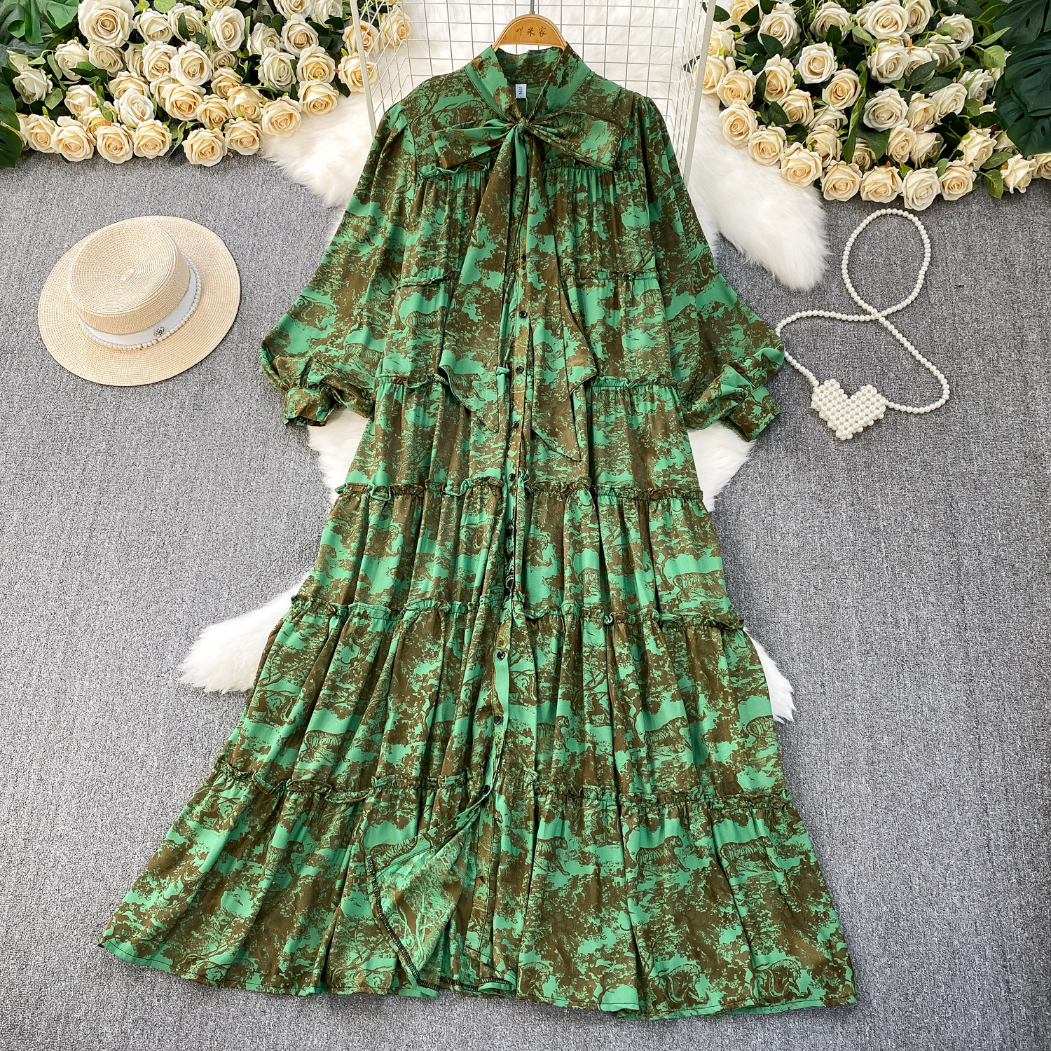 French-Style Light Mature Print Lace-Up V-Neck Long-Sleeve Dress for Women, Autumn Loose Fit, Tummy-Concealing, Slimming, Ruffled Long Dress