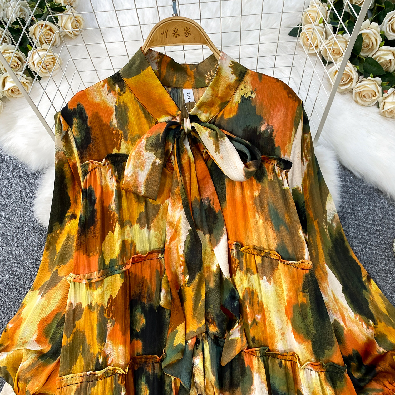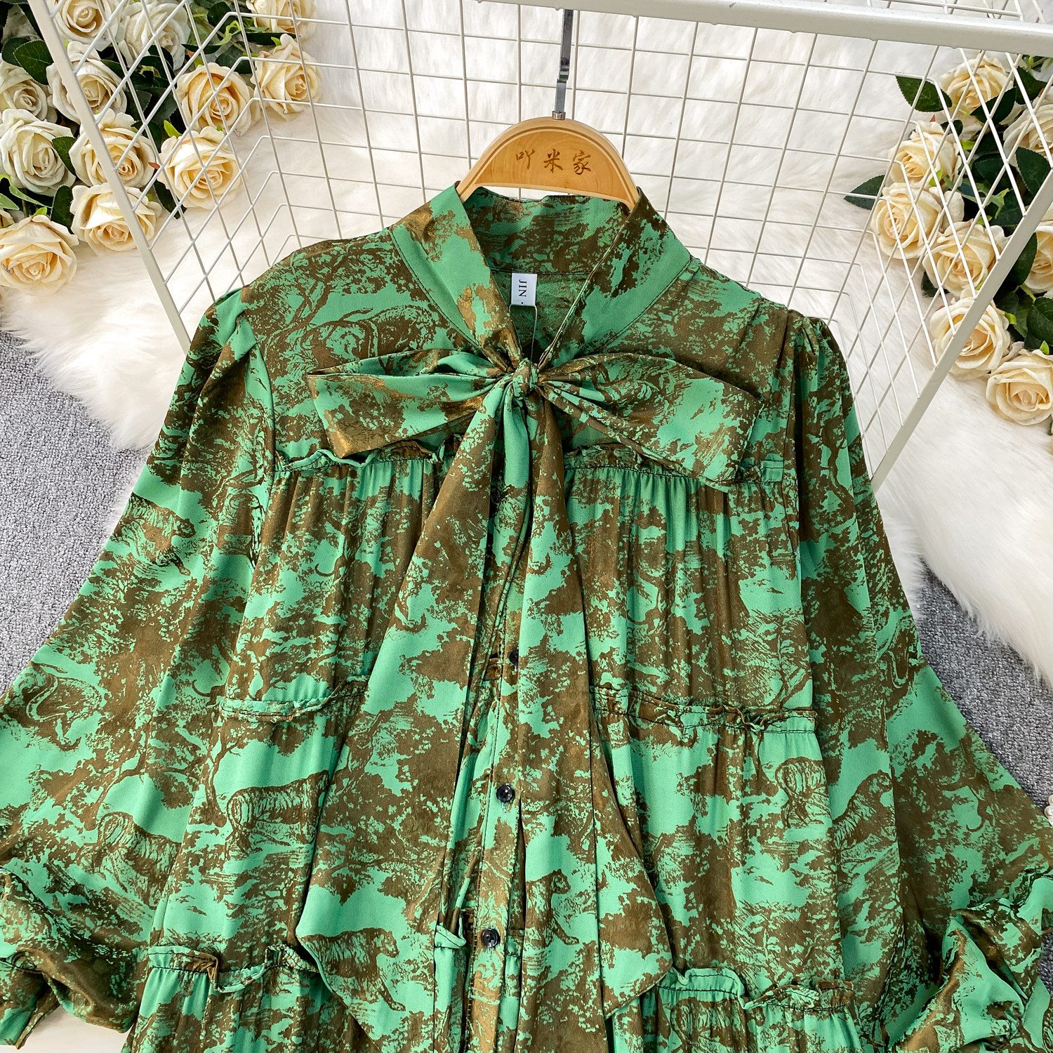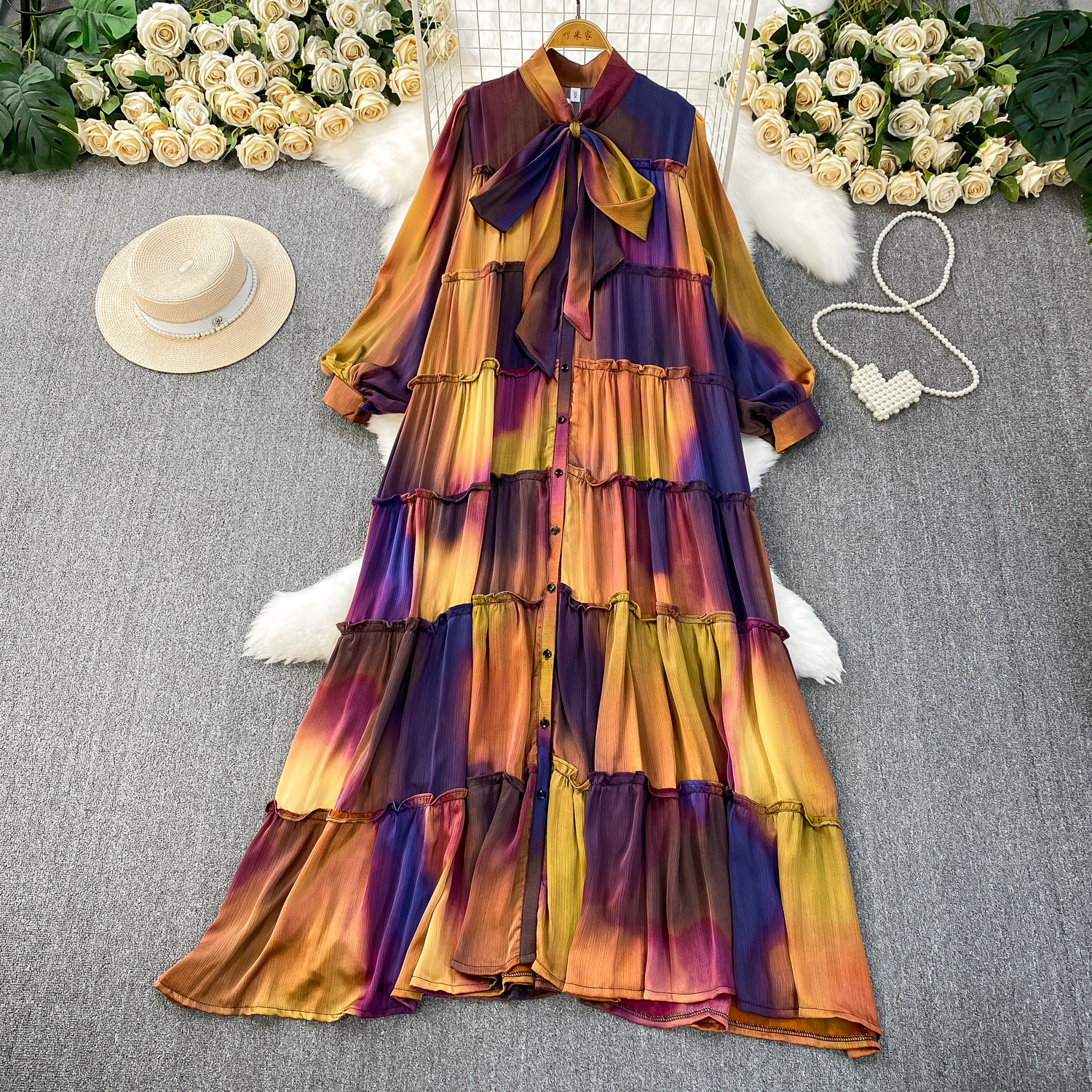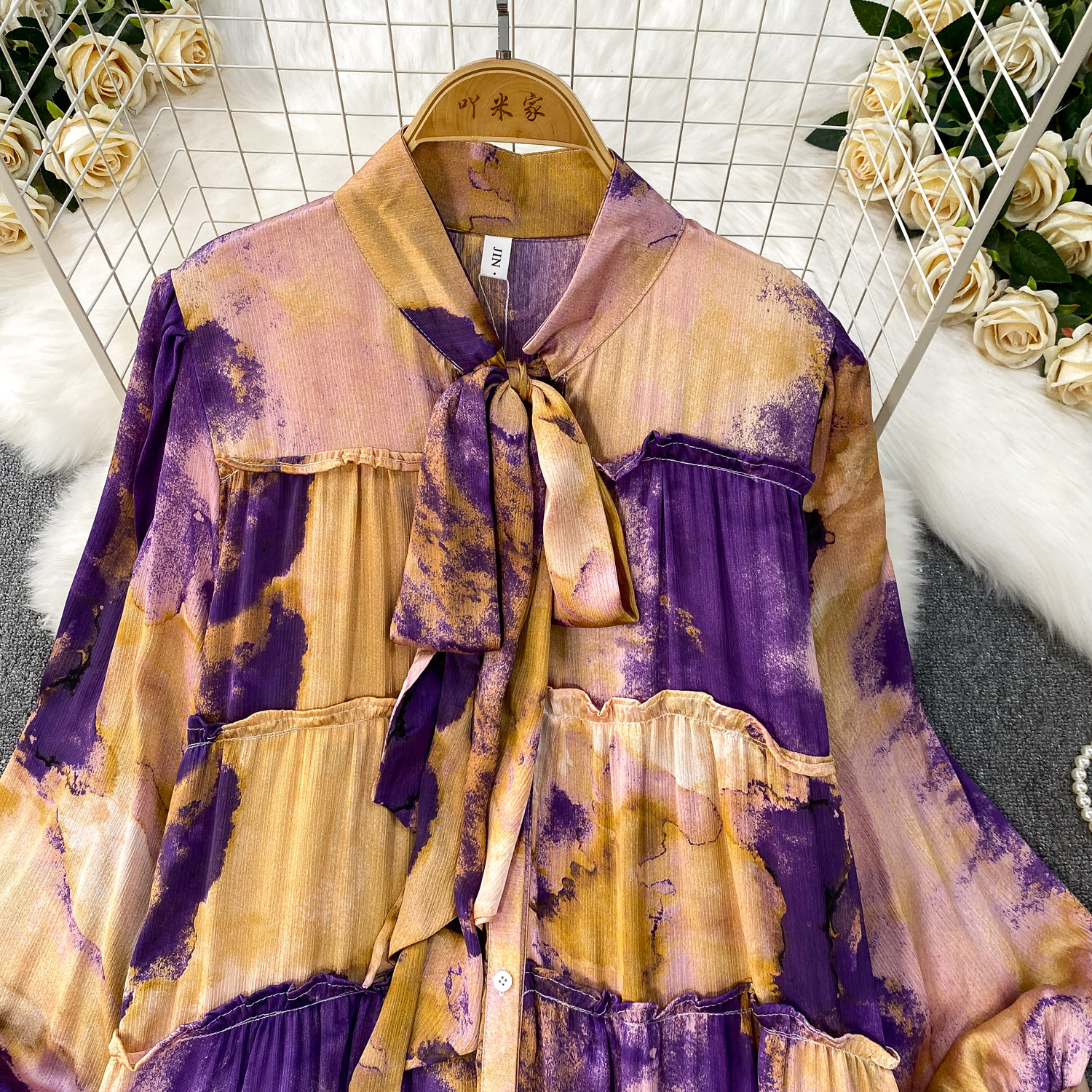 French-Style Light Mature Print Lace-Up V-Neck Long-Sleeve Dress for Women, Autumn Loose Fit, Tummy-Concealing, Slimming, Ruffled Long Dress