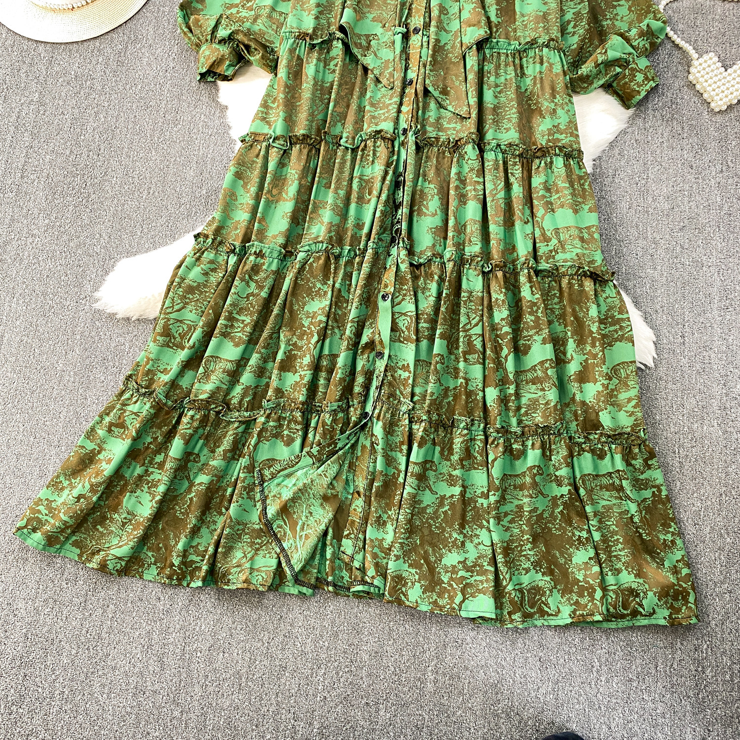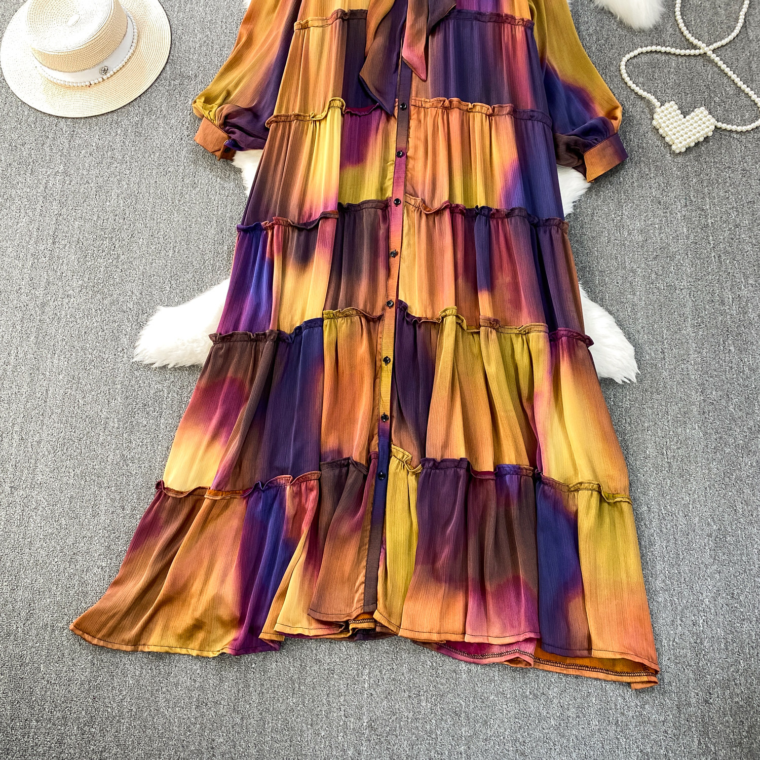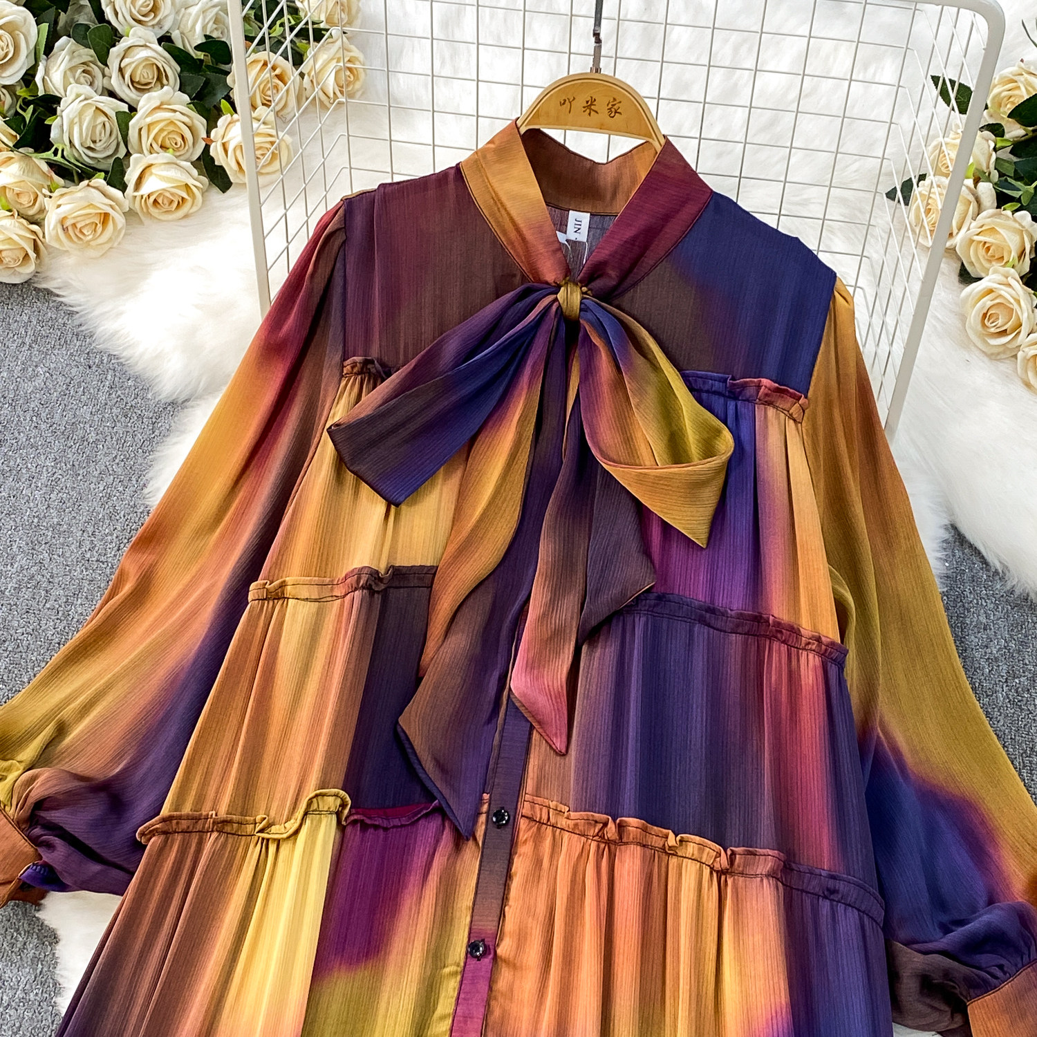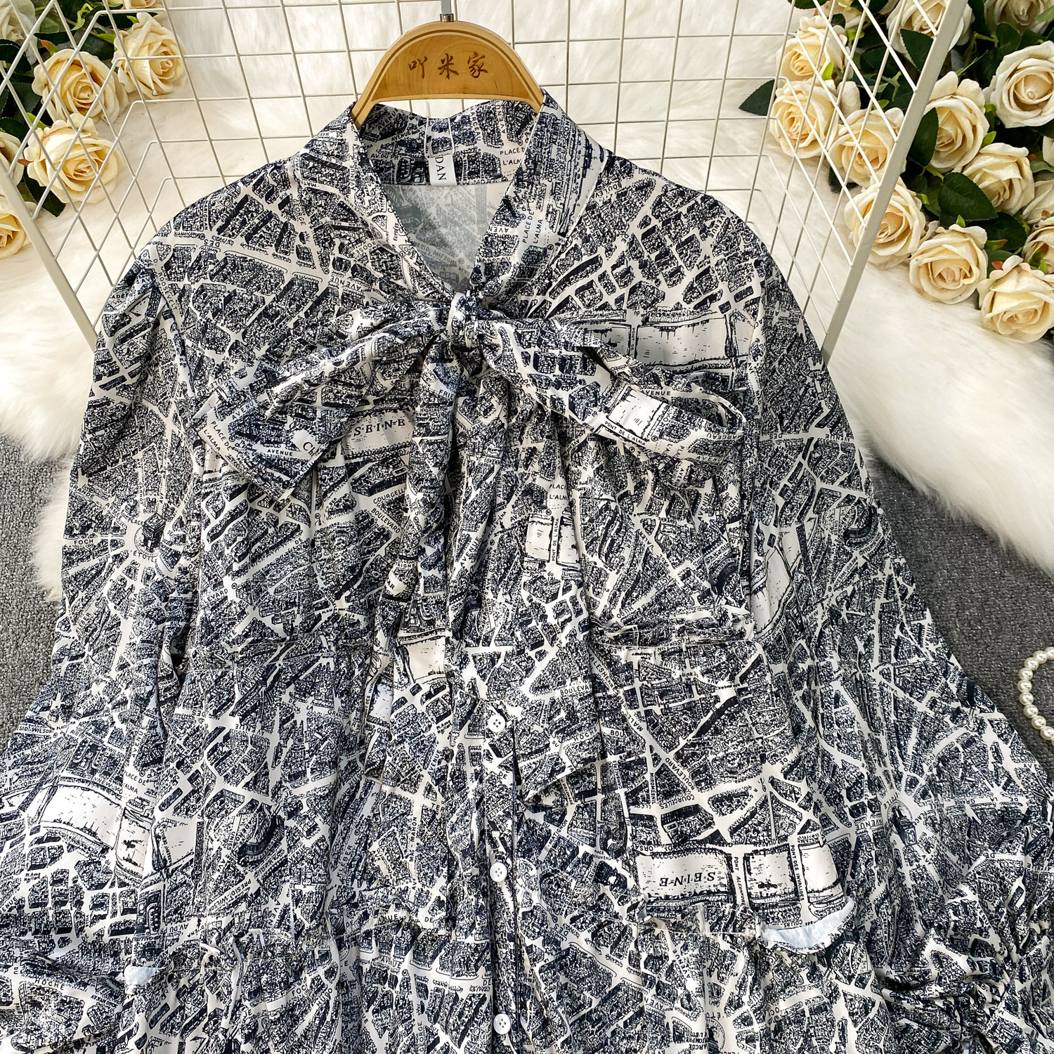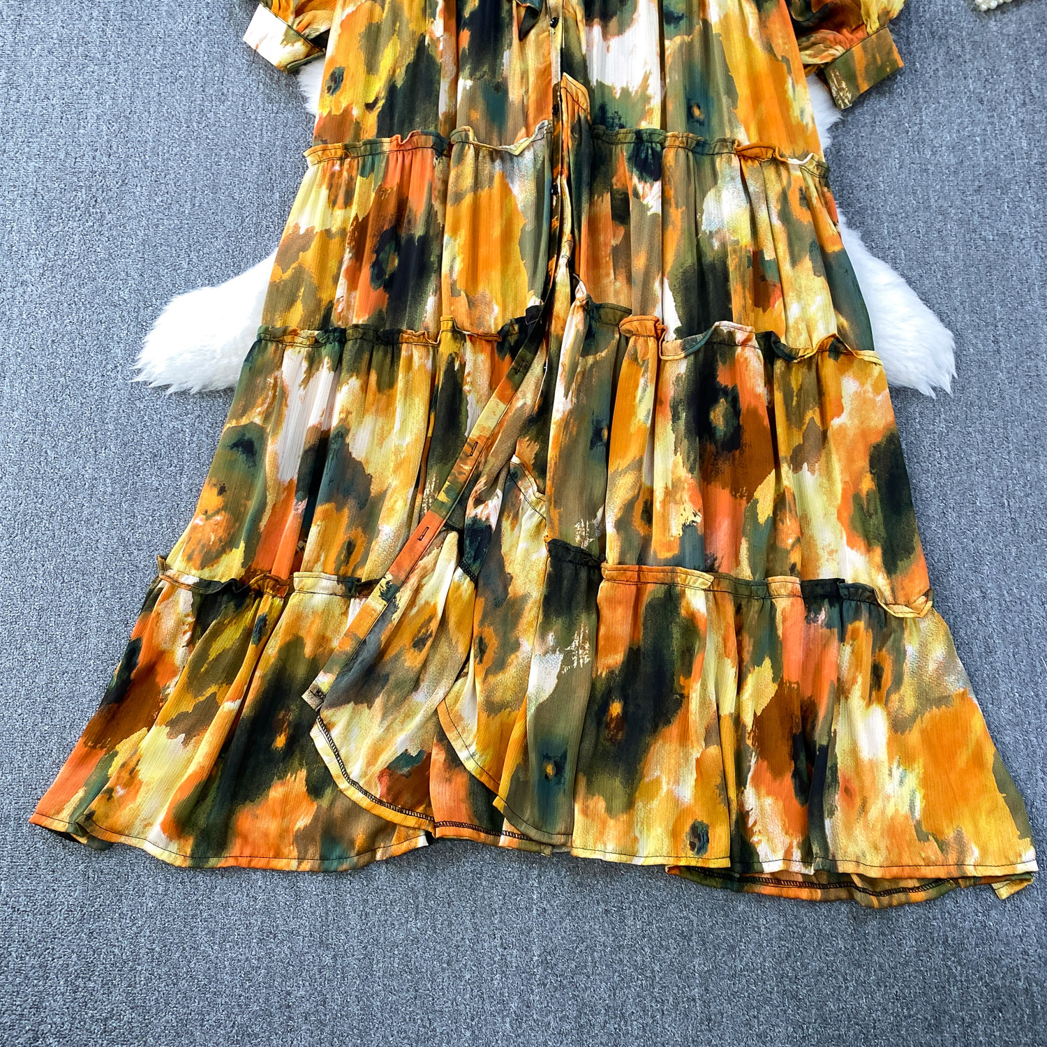 French-Style Light Mature Print Lace-Up V-Neck Long-Sleeve Dress for Women, Autumn Loose Fit, Tummy-Concealing, Slimming, Ruffled Long Dress