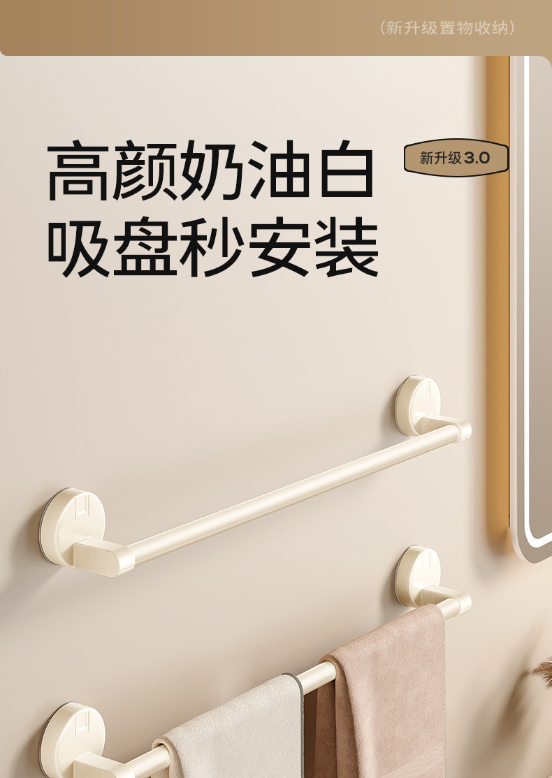 Cream-Colored Suction Cup Towel Rack, No-Drill Towel Bar for Bathroom, Toilet Storage Hanging Rod, Wall-Mounted Bathroom Shelf