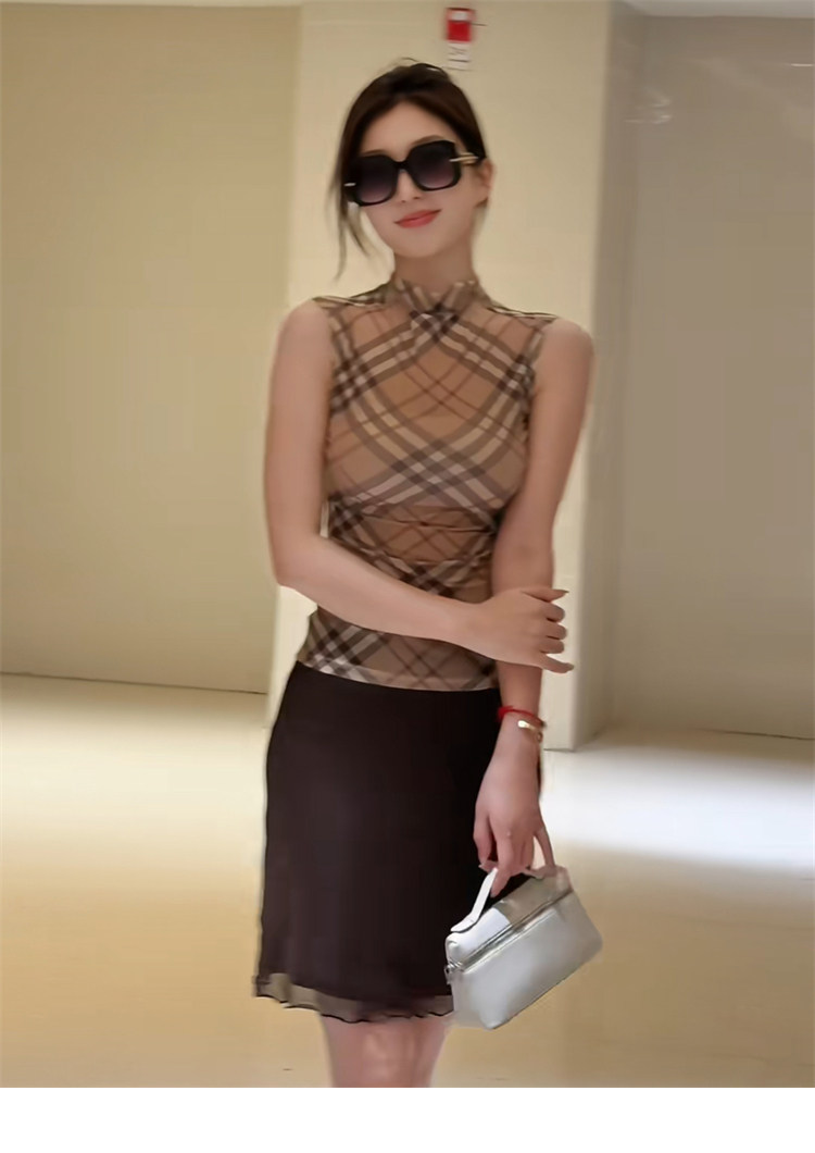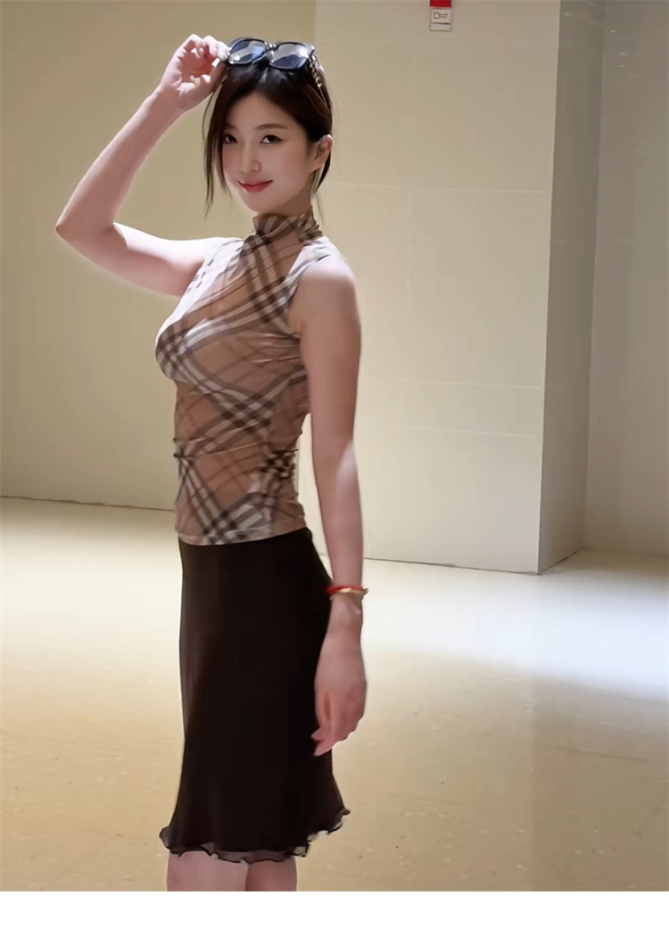 2025 New Style Hot Girl Half-High Collar Color-Blocking Sleeveless Vest for Women, Summer Plaid Waist-Cinching Thin Outerwear Elegant Top
