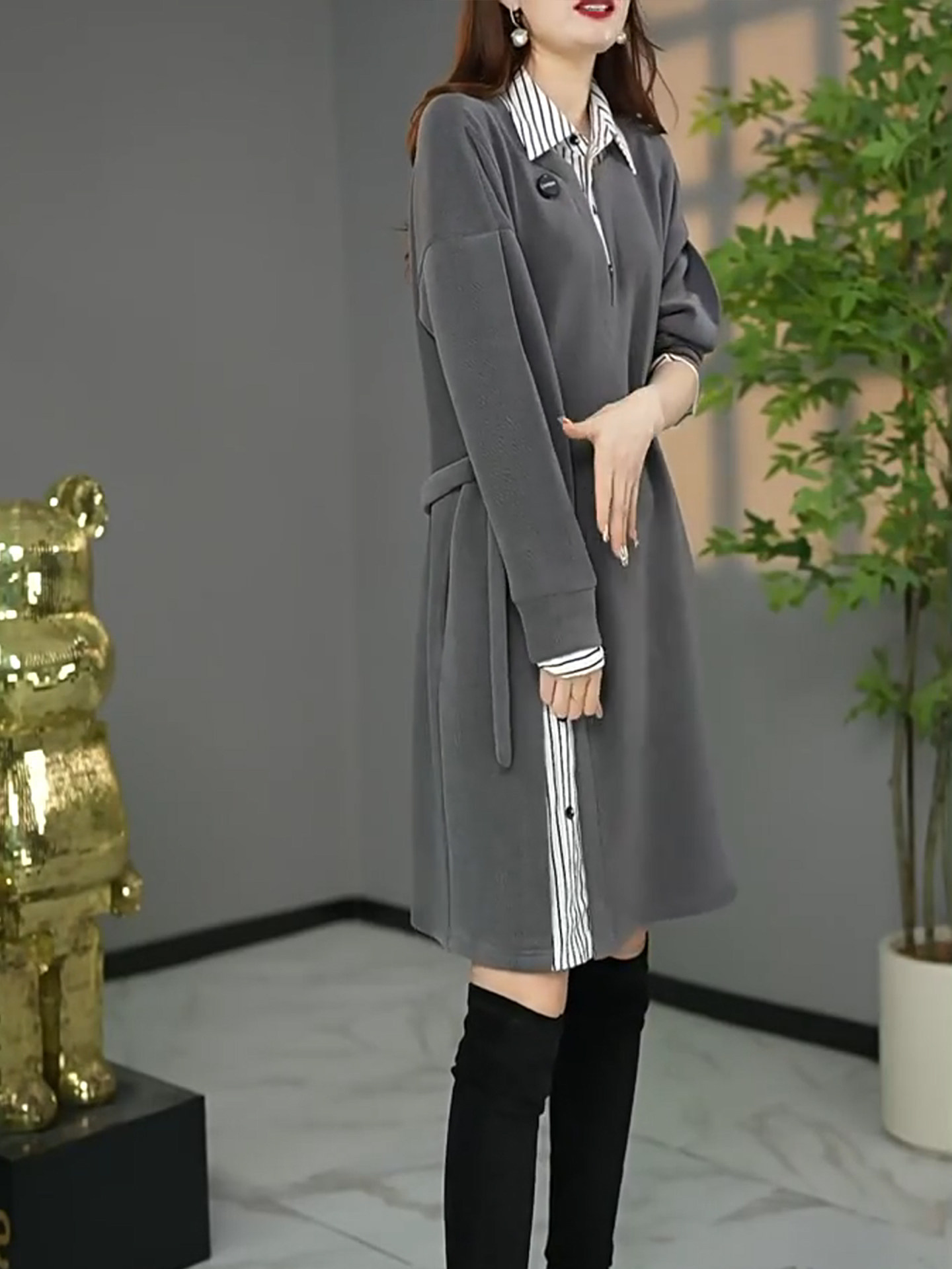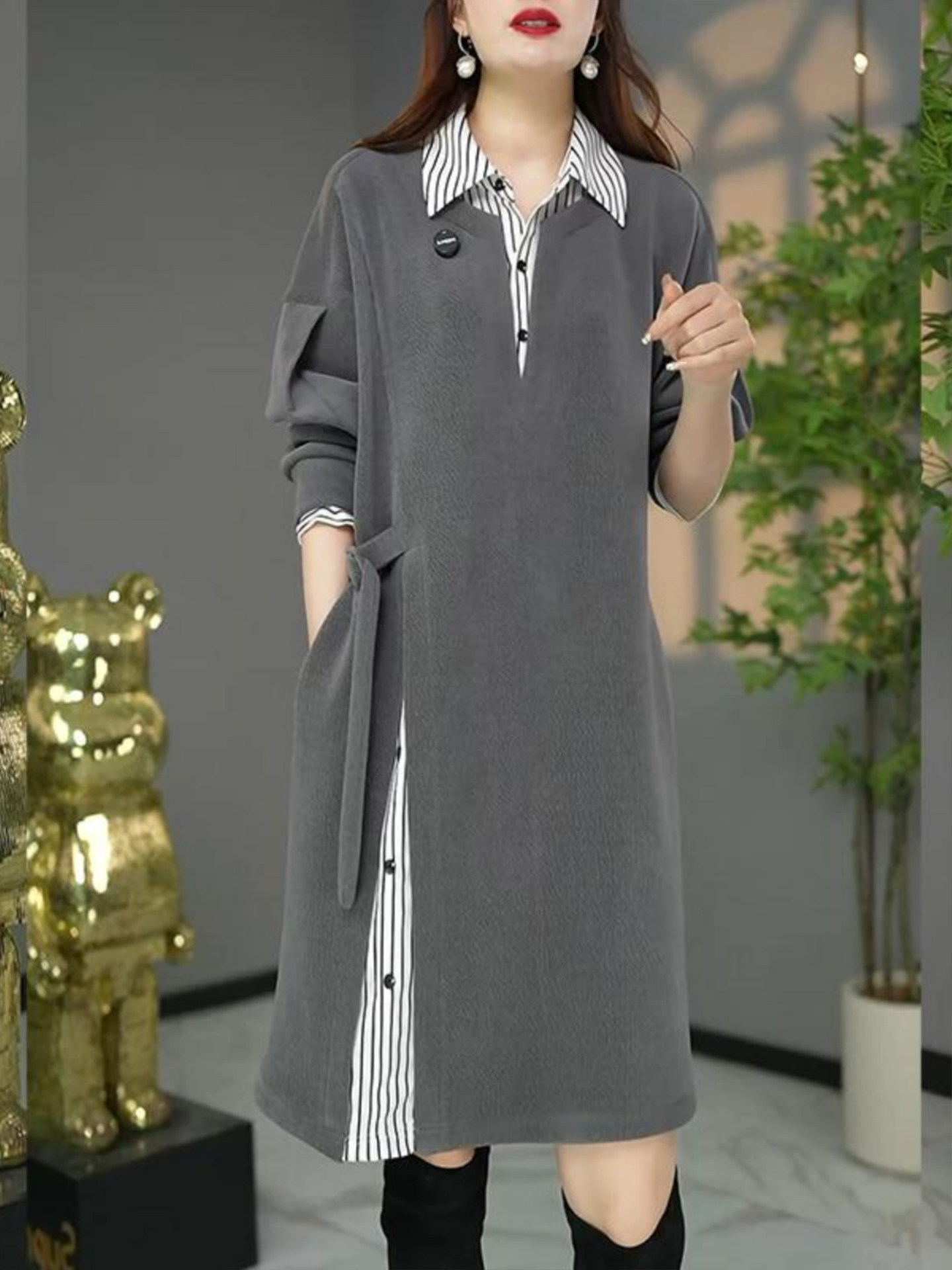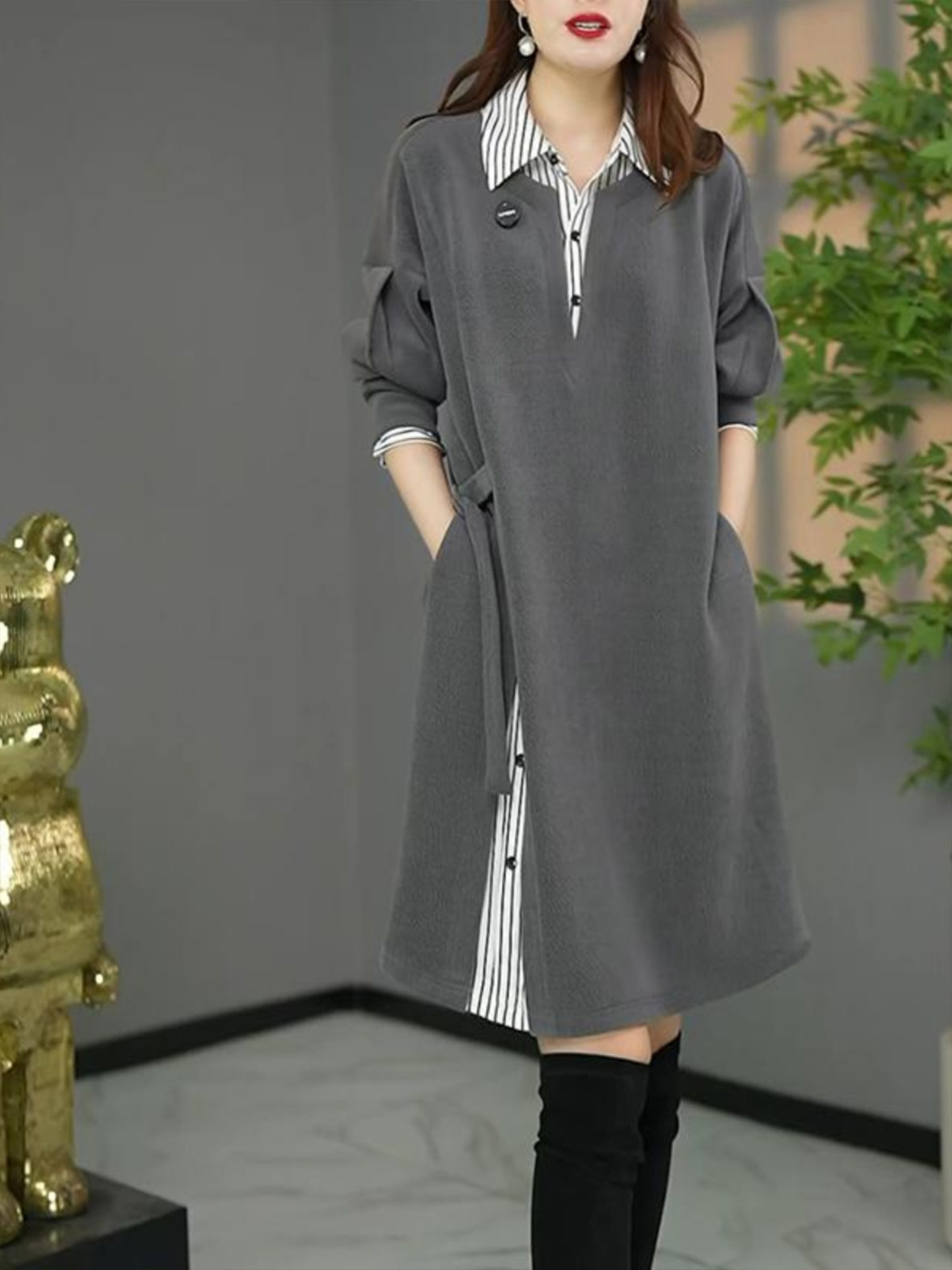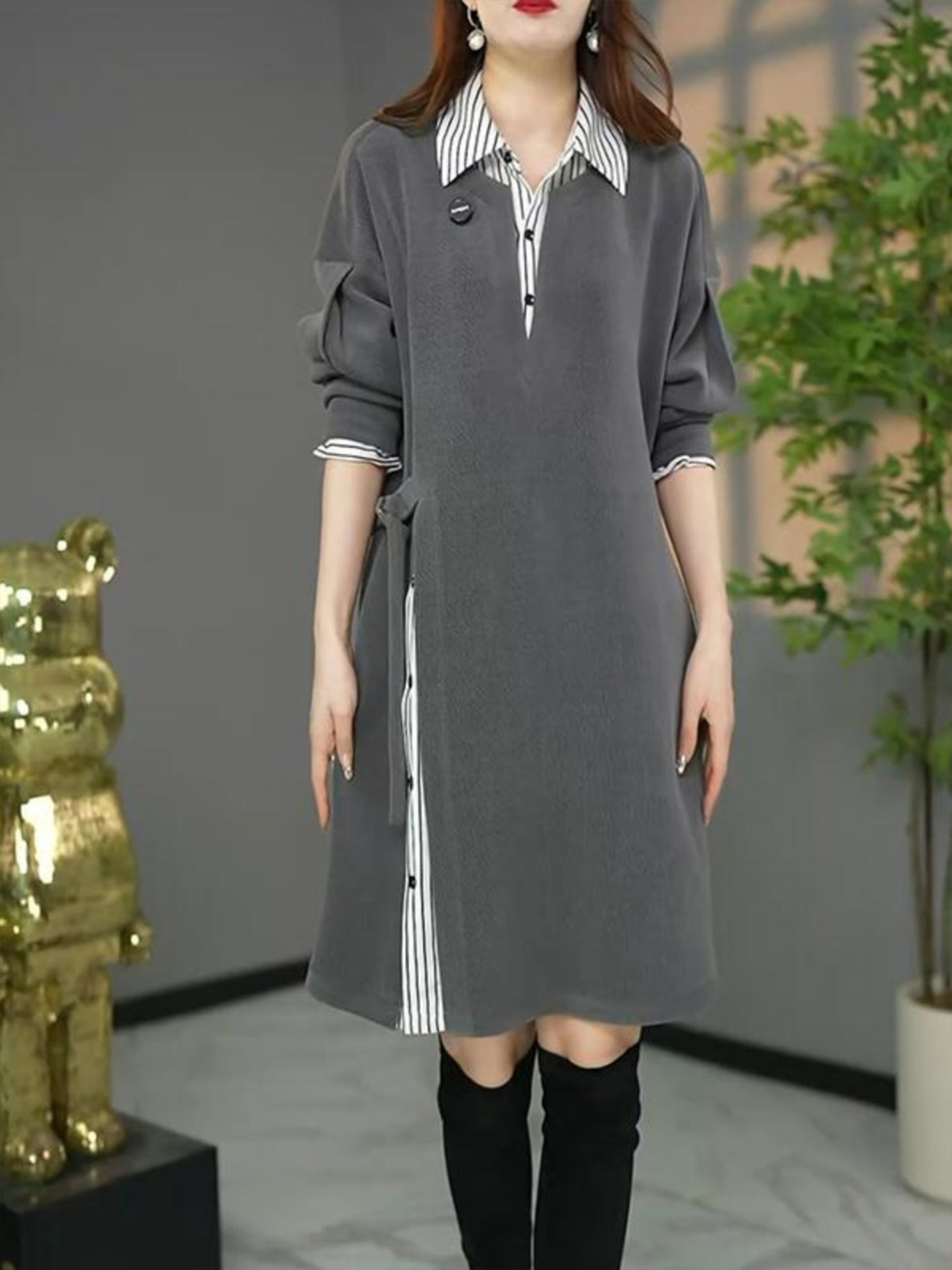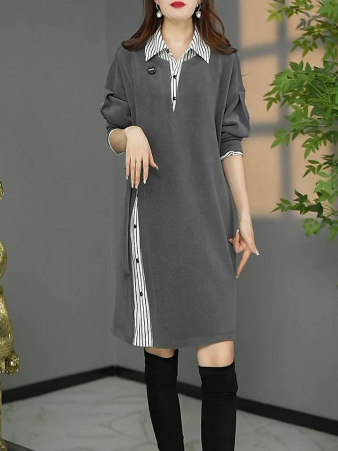 2026 Spring Loose and Versatile Gray Western Style Fake Two-piece Shirt Dress Plus Size Women's Fat MM Light People XL