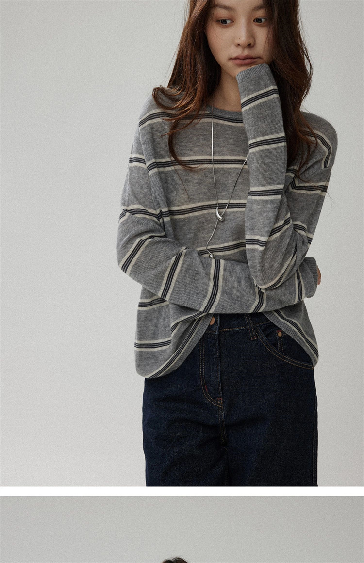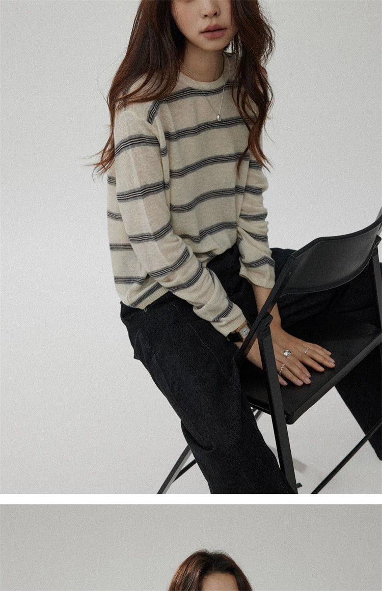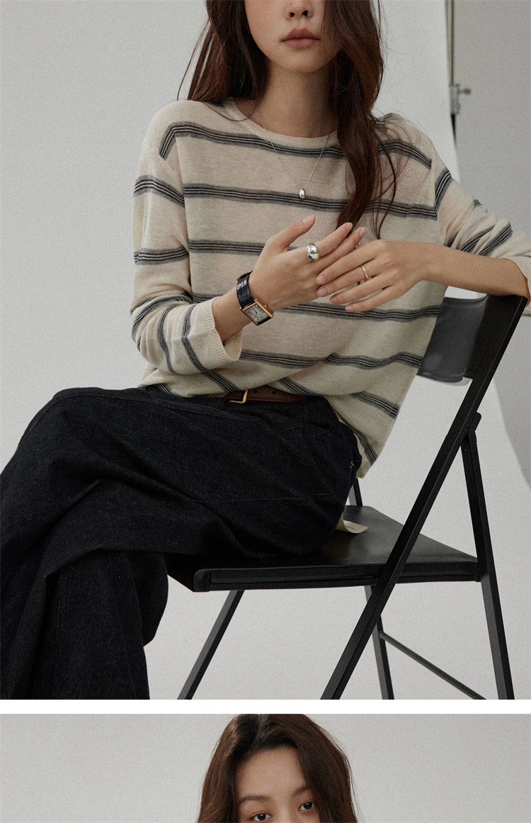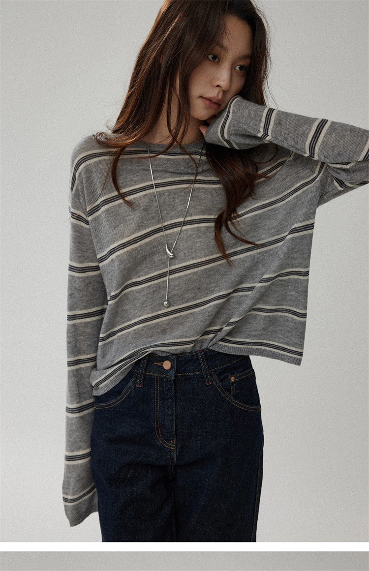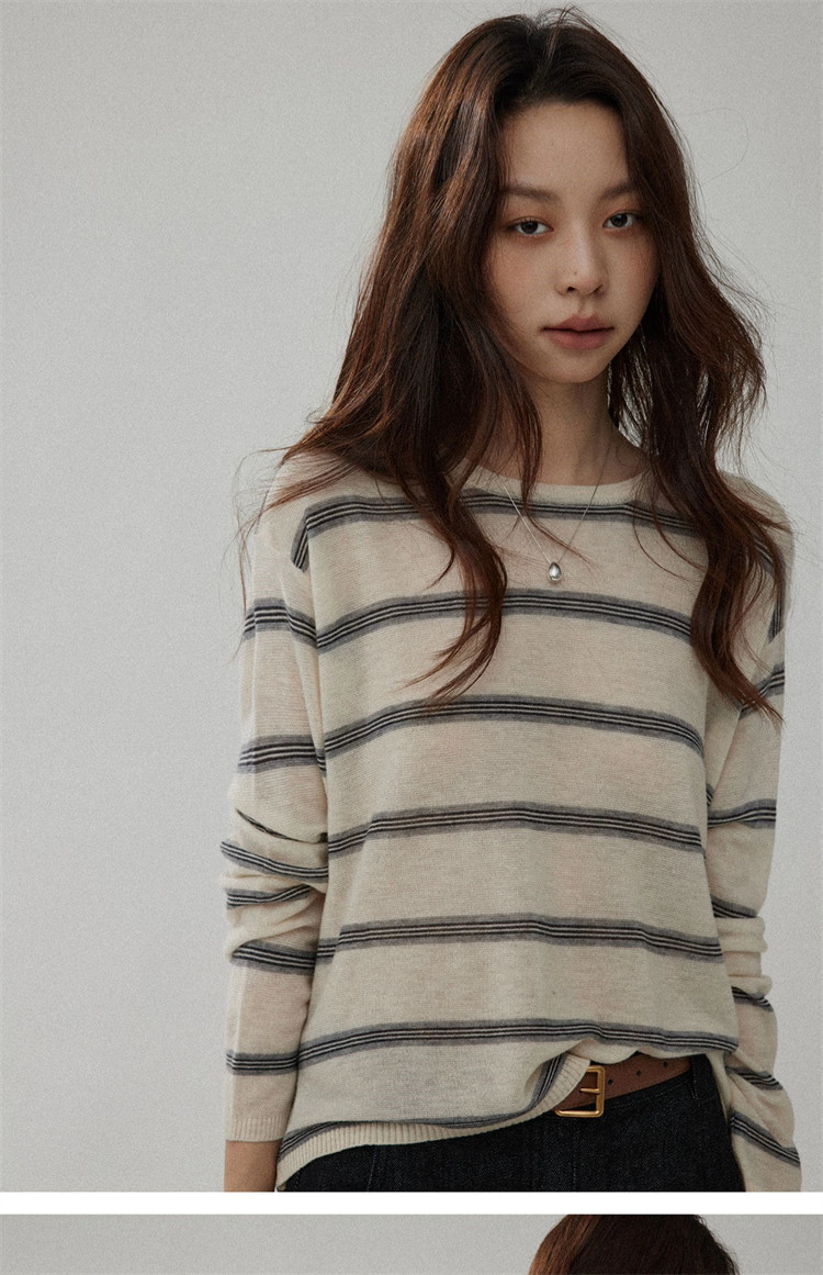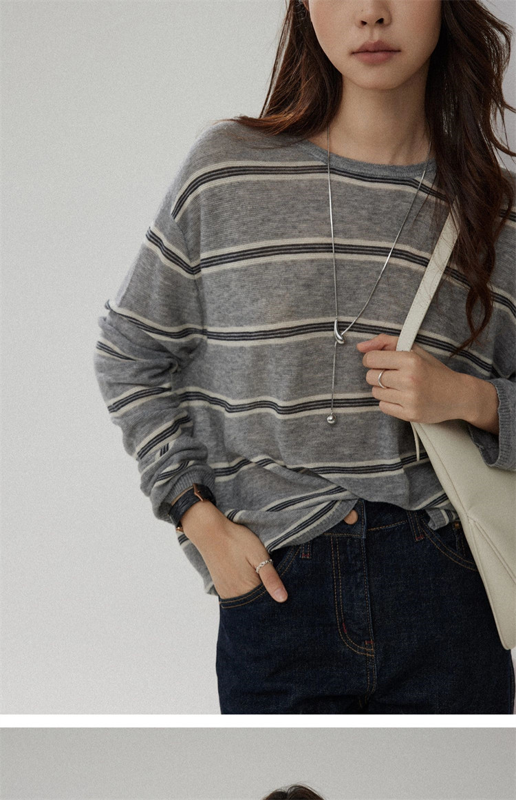 French-Style Round-Neck Striped Color-Block Knit Sweater for Women, Spring and Autumn Vintage Lazy Loose-Fitting Base Sweater, Thin Inner Layer Top