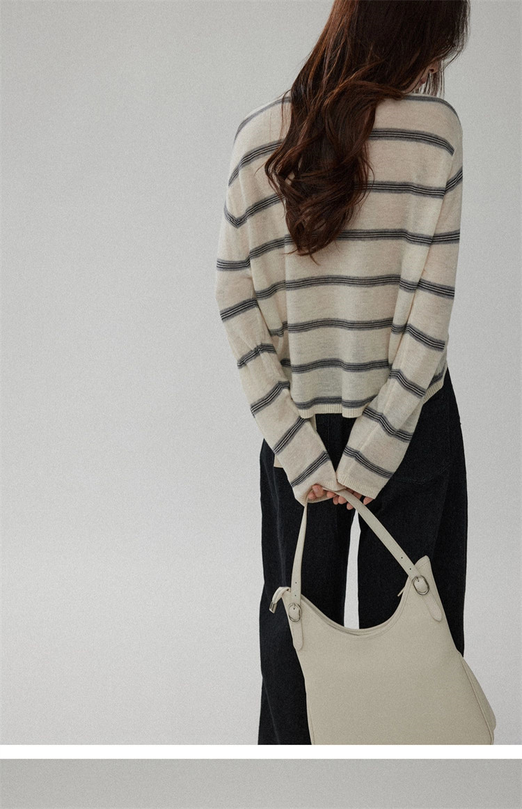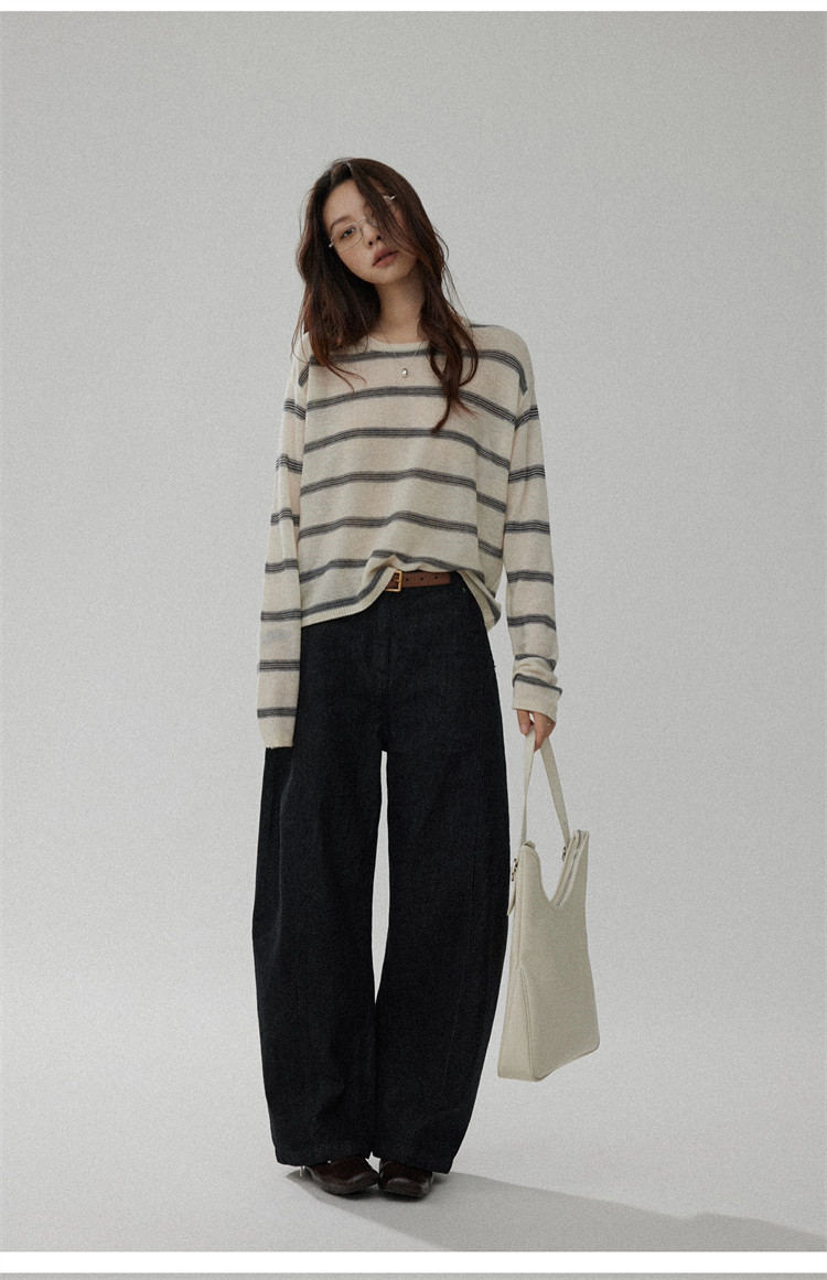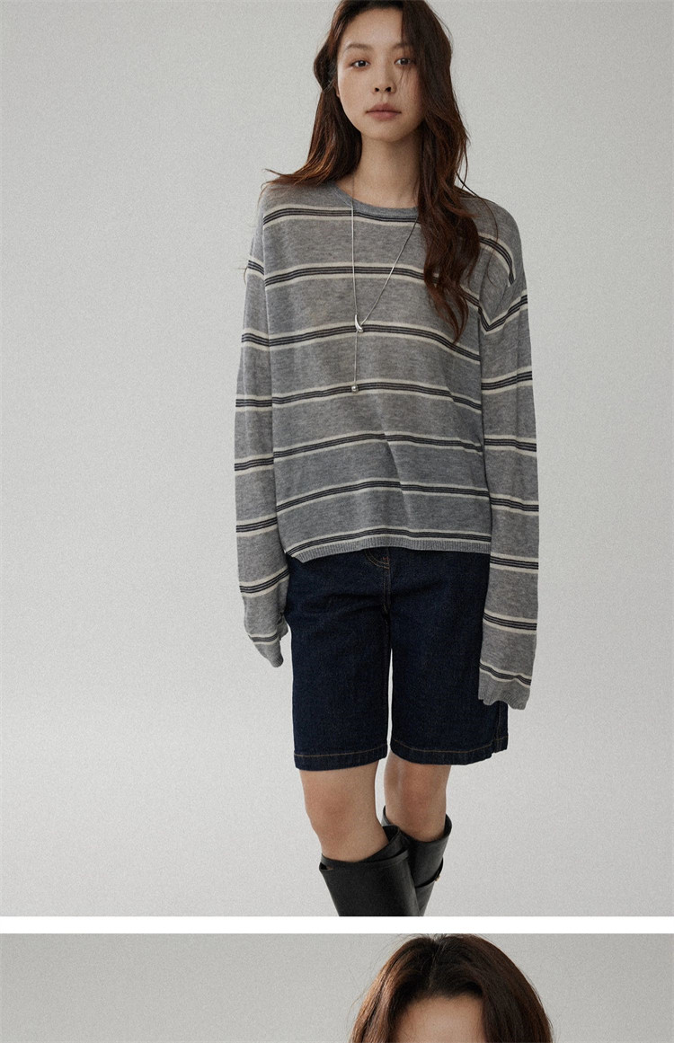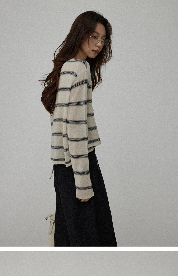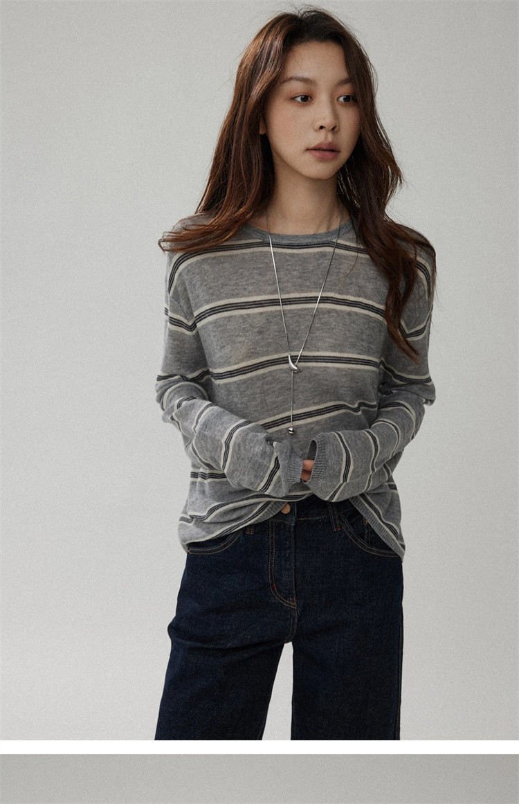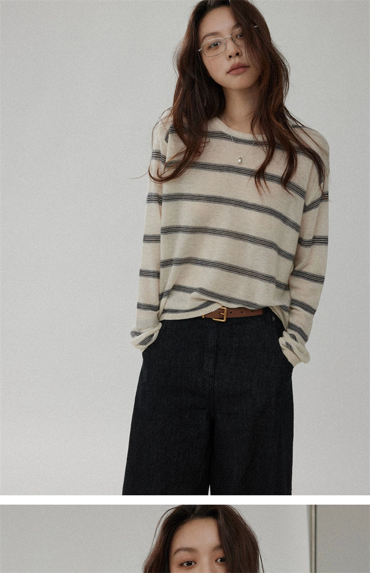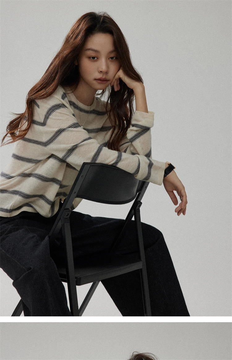 French-Style Round-Neck Striped Color-Block Knit Sweater for Women, Spring and Autumn Vintage Lazy Loose-Fitting Base Sweater, Thin Inner Layer Top