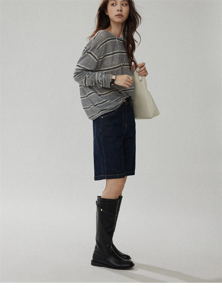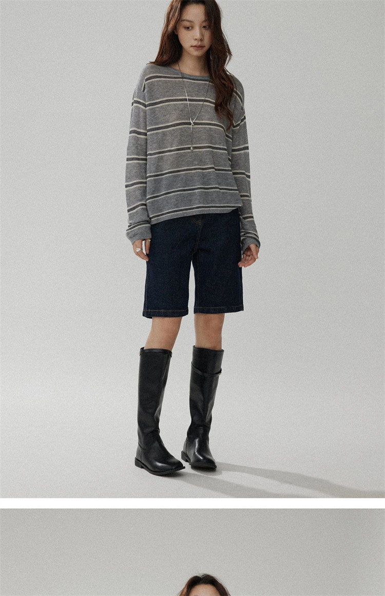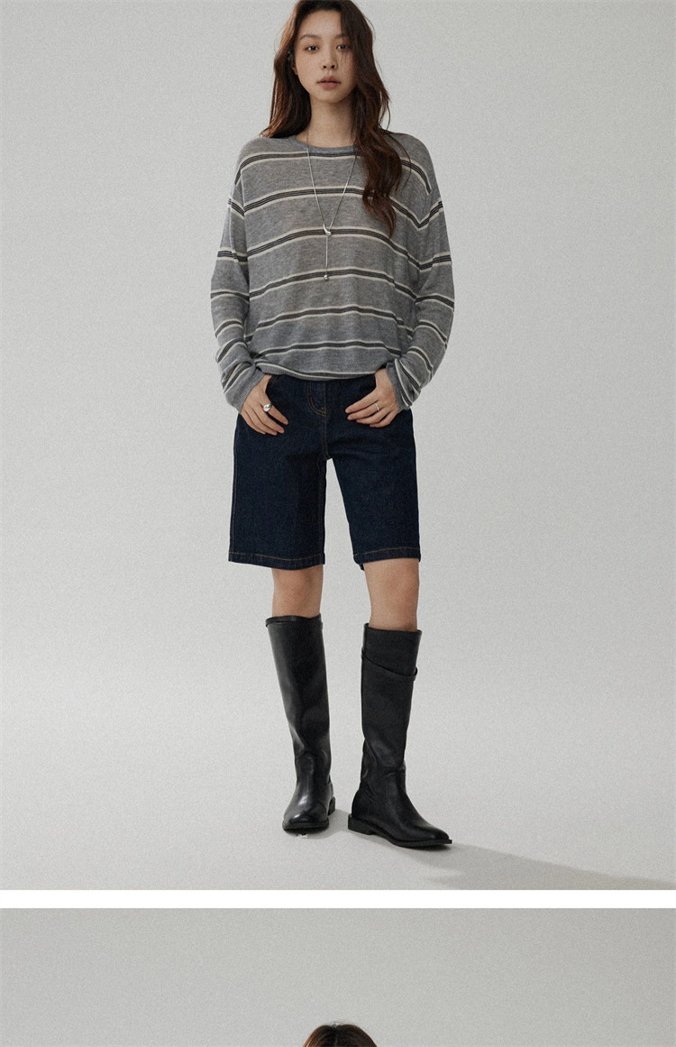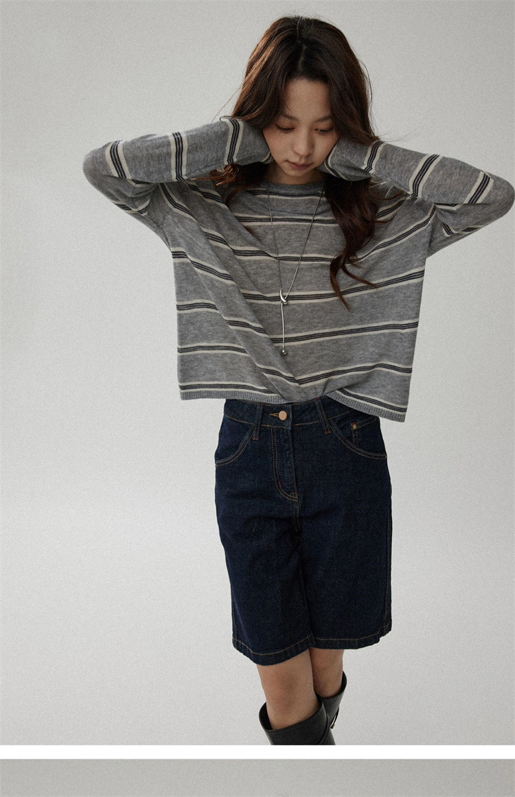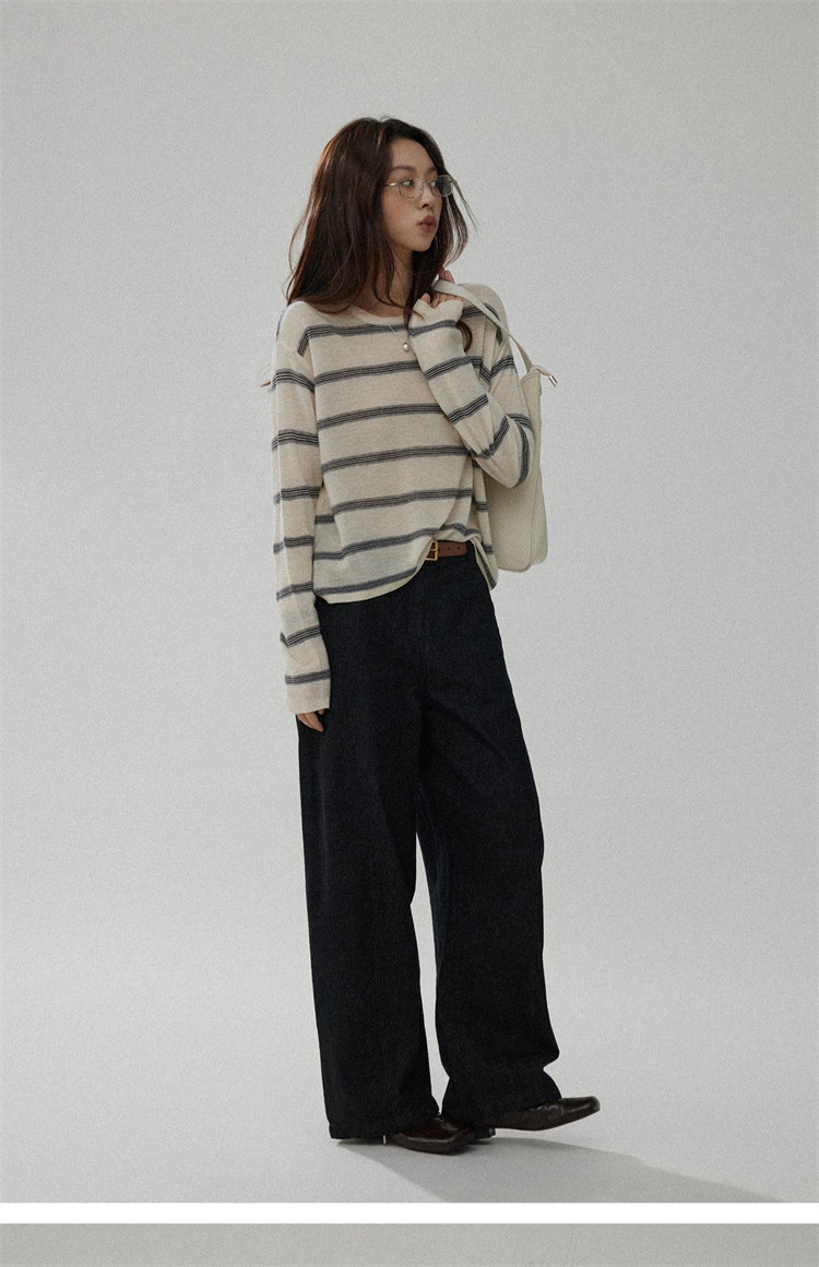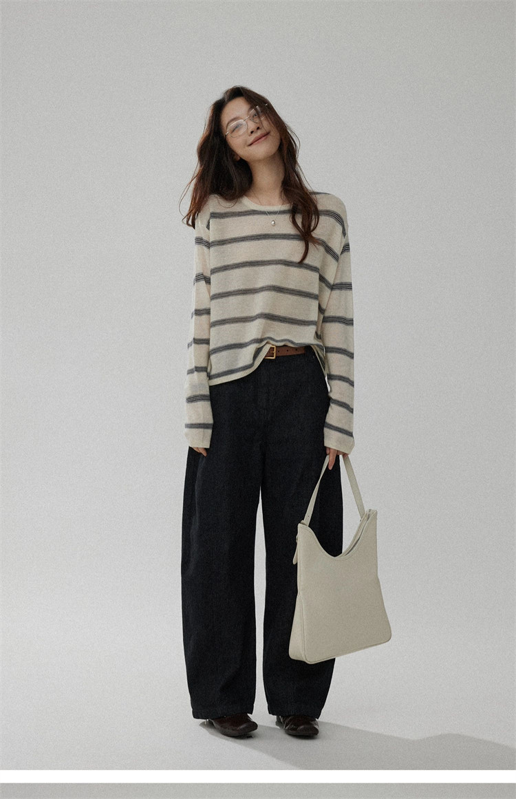 French-Style Round-Neck Striped Color-Block Knit Sweater for Women, Spring and Autumn Vintage Lazy Loose-Fitting Base Sweater, Thin Inner Layer Top