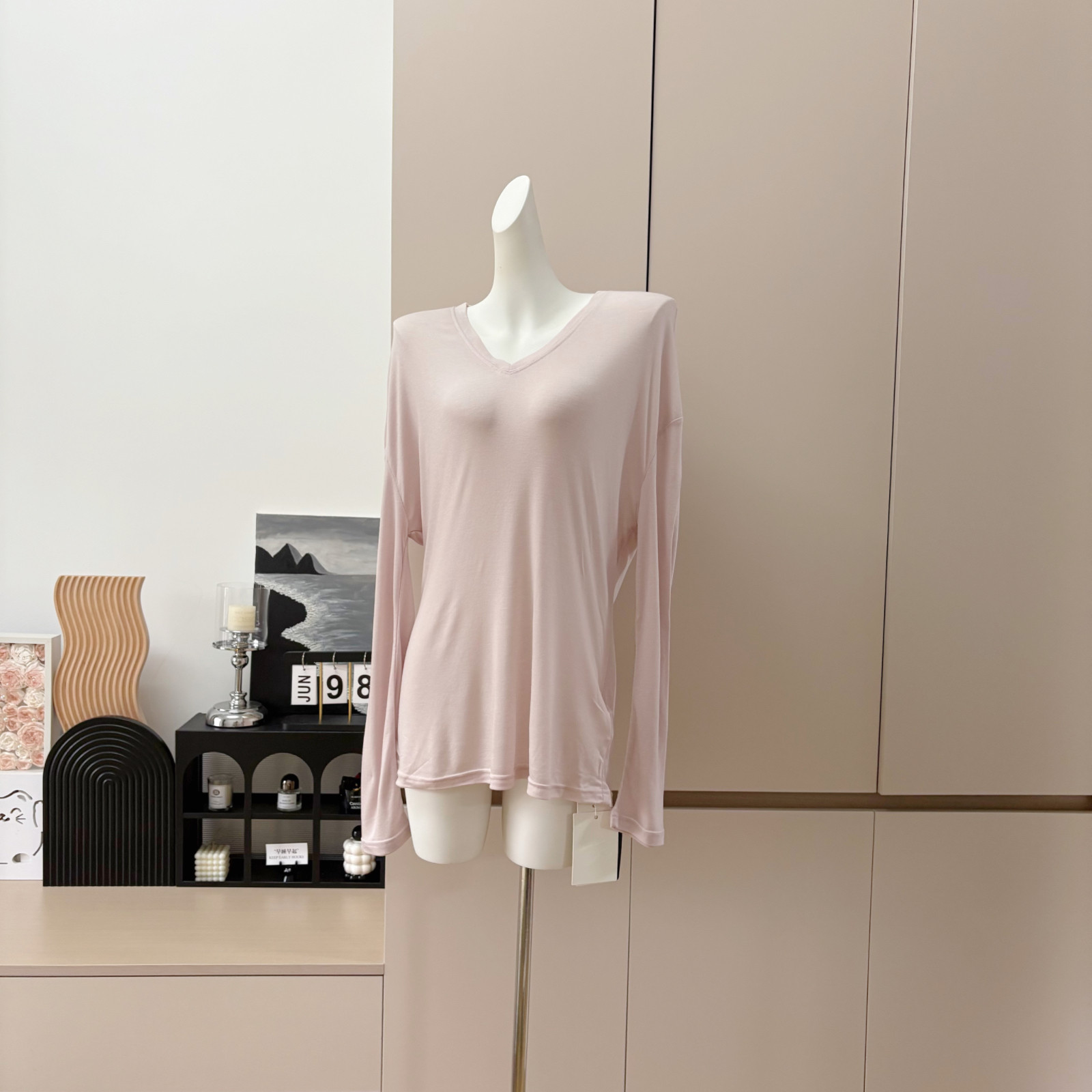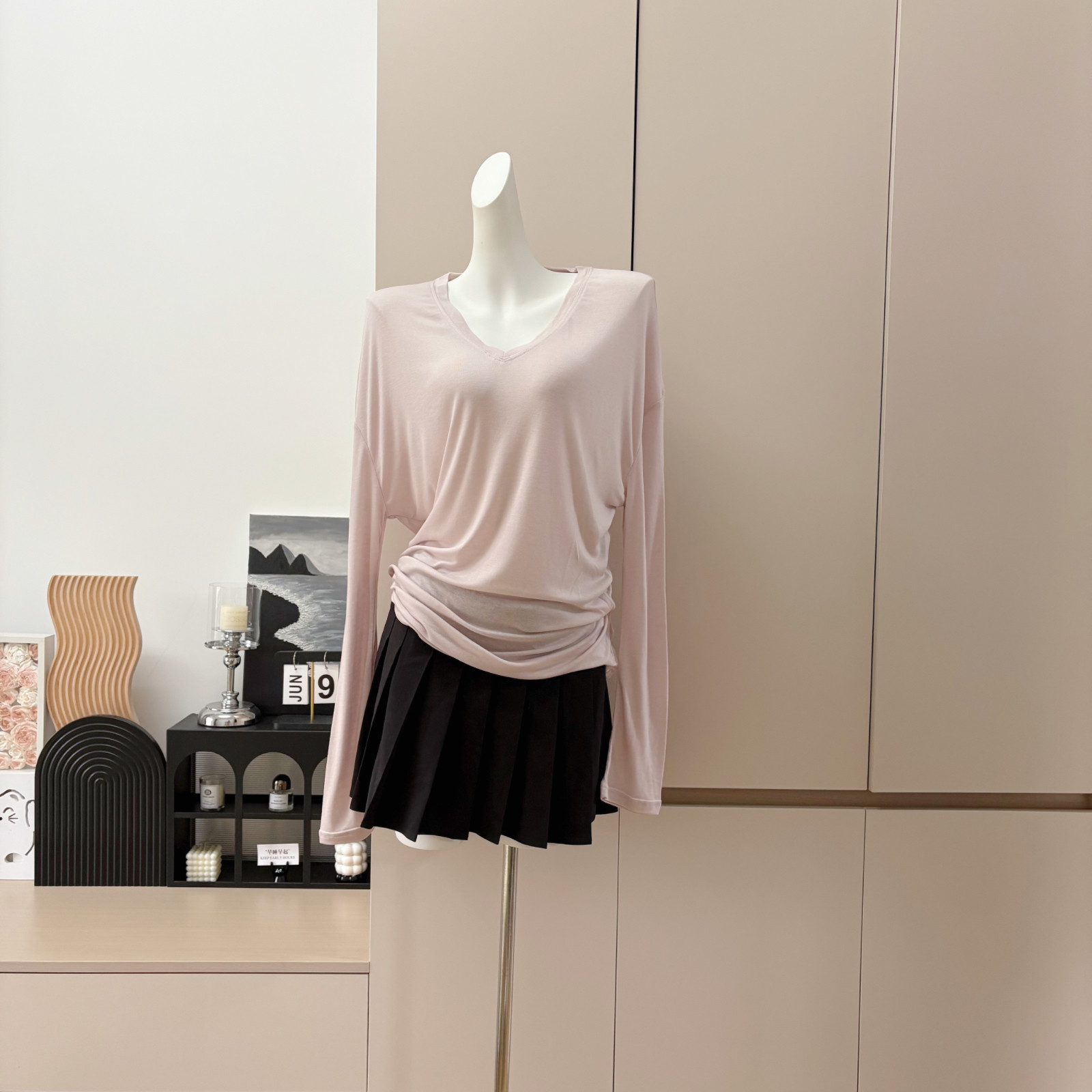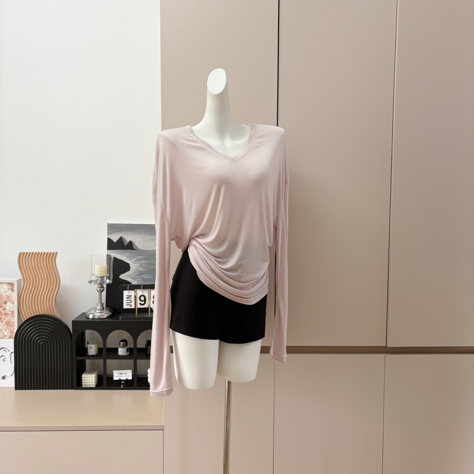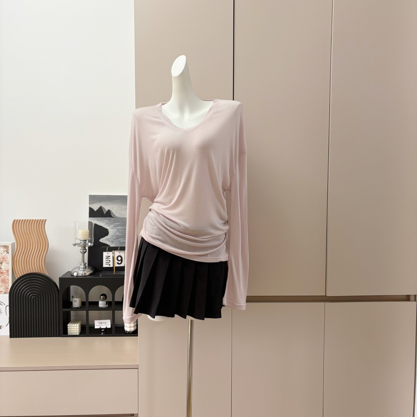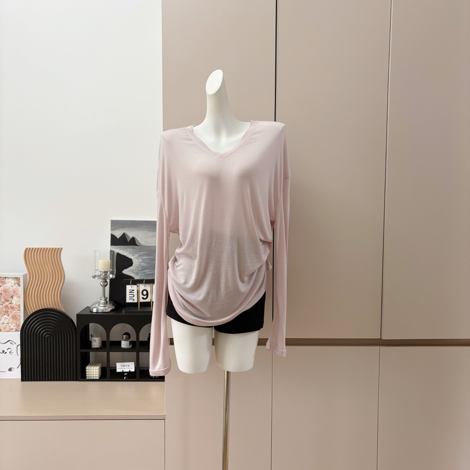 Popw Relaxed Style Tencel Wool Loose V-Neck Thin Top Women's Summer New Long-Sleeved T-Shirt