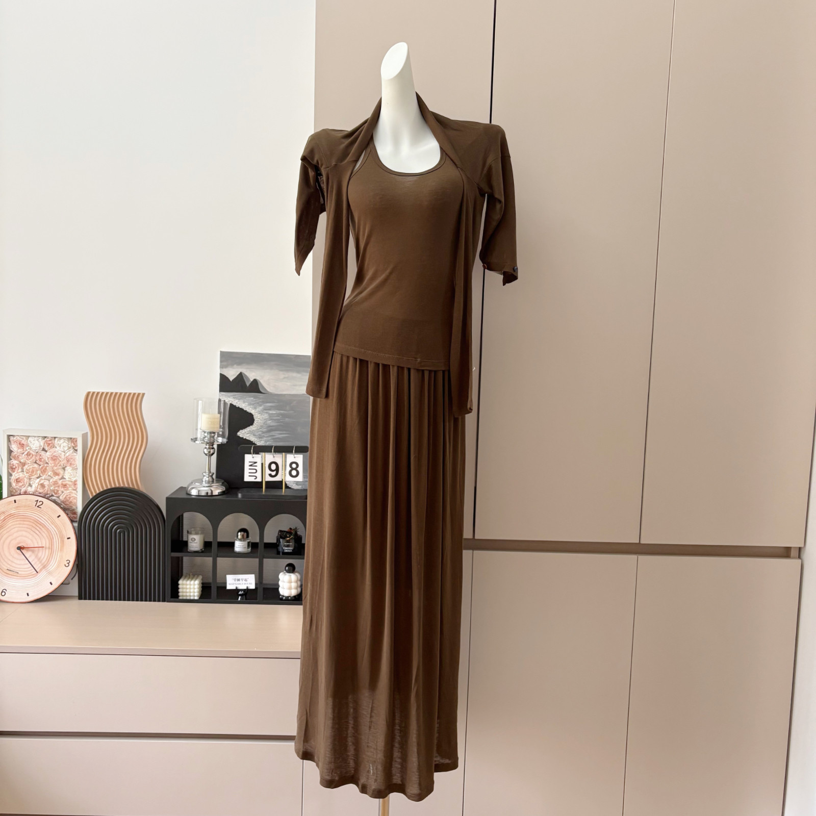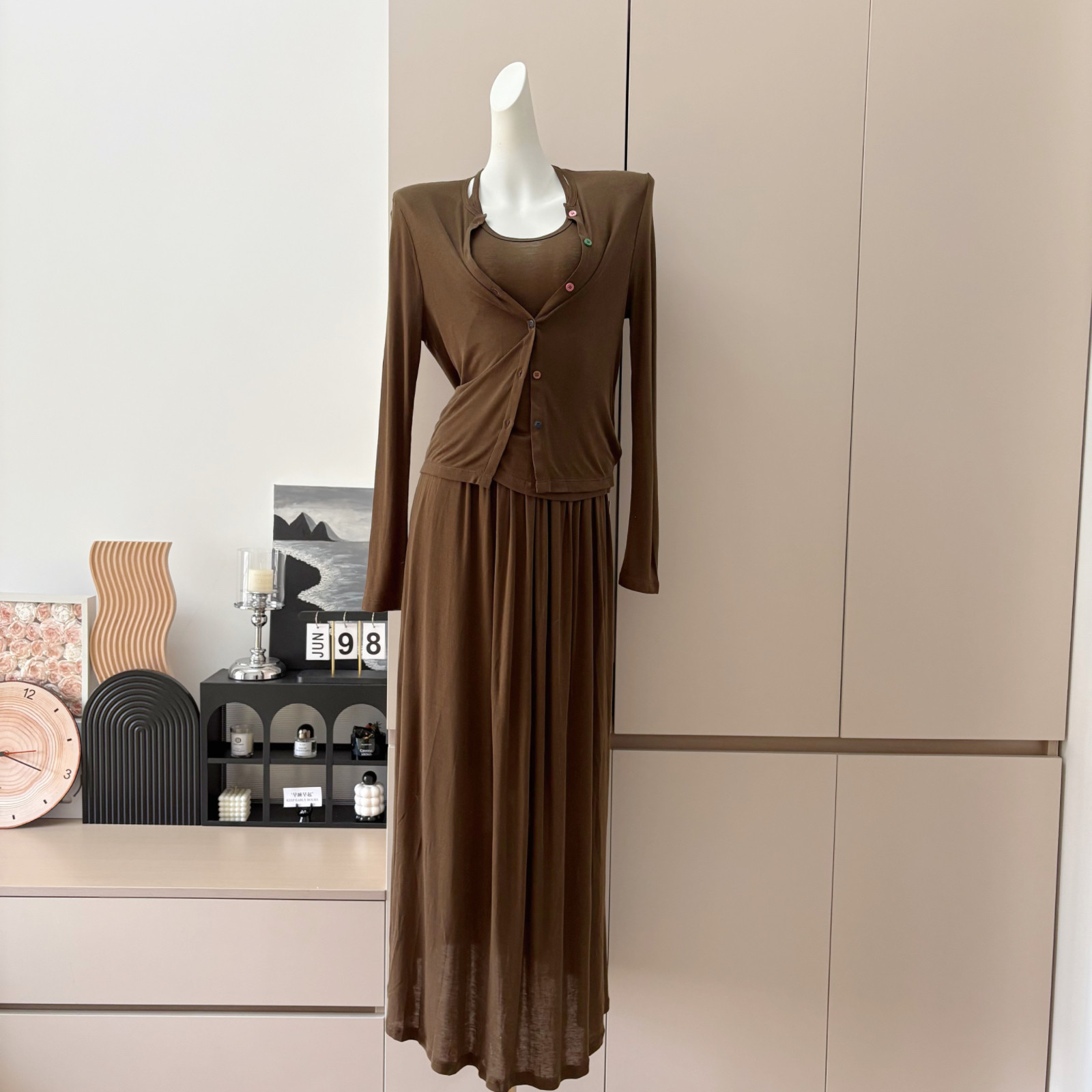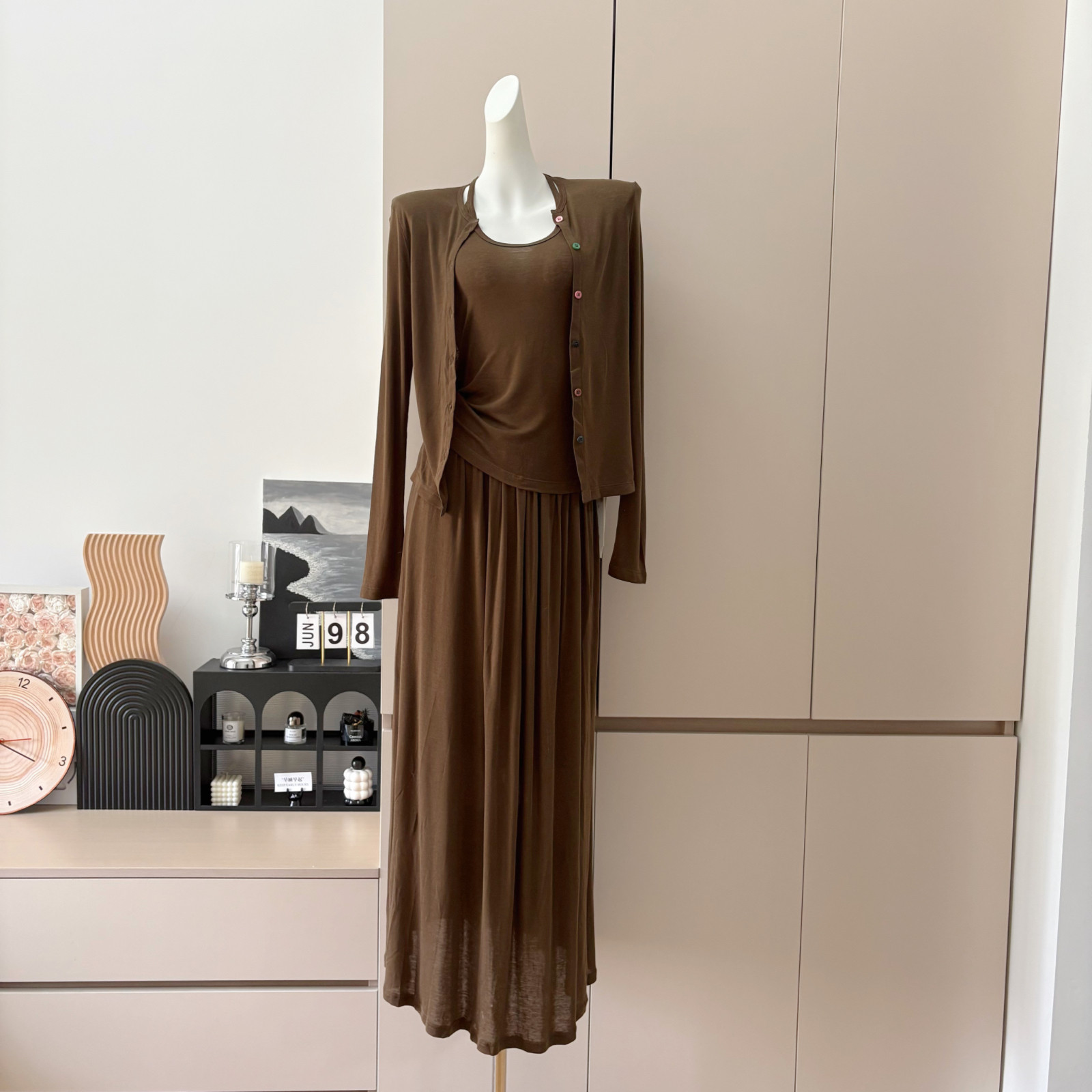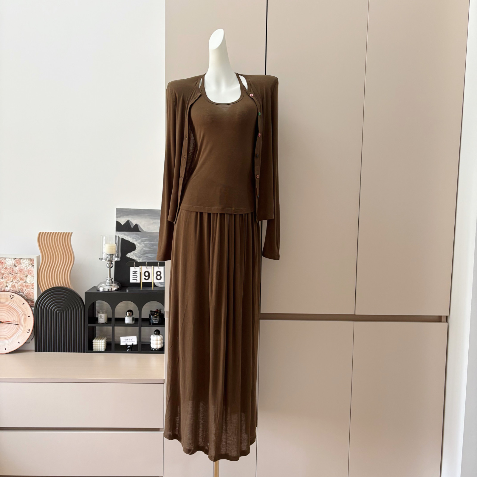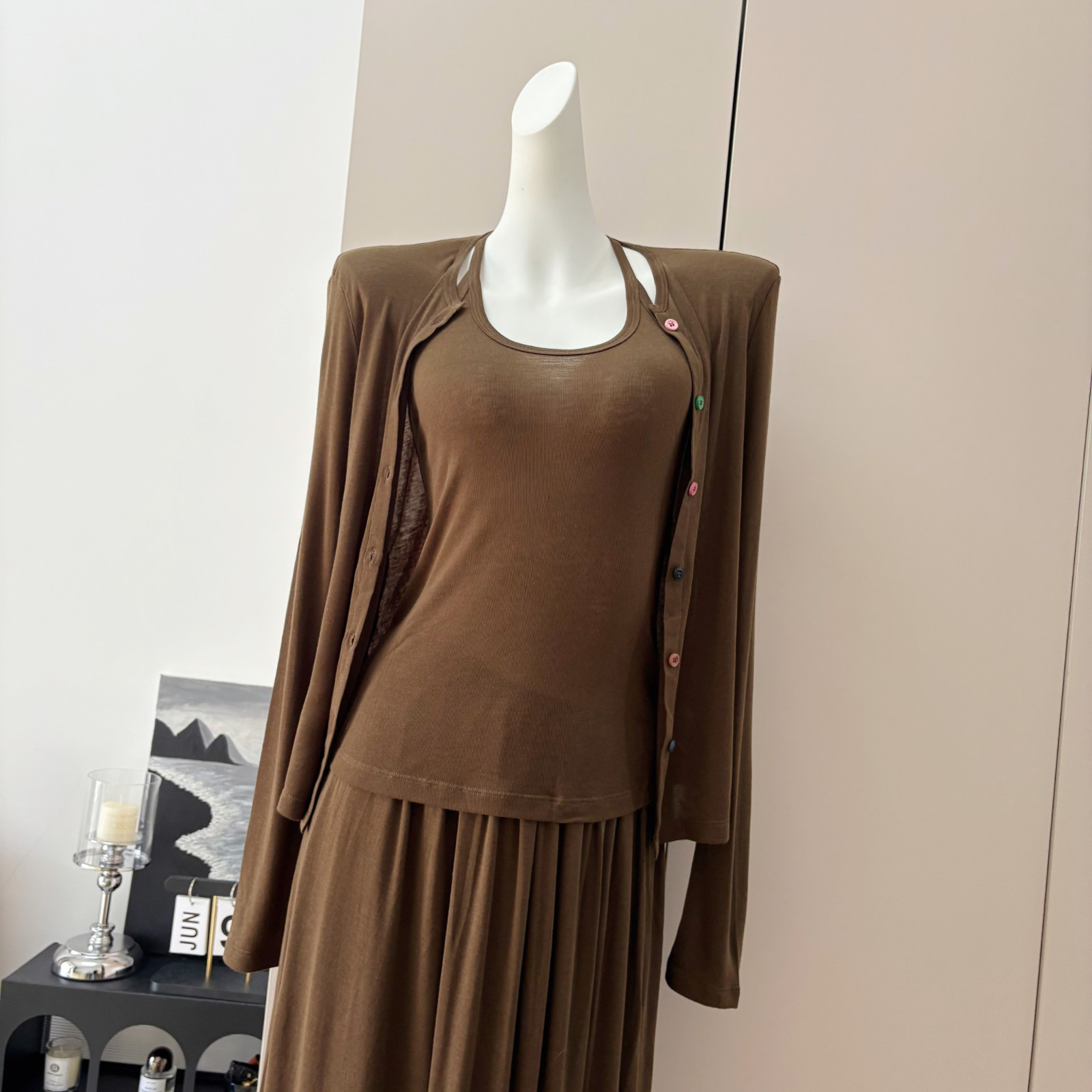 Popw Chestnut Autumn Tencel Knitted Cardigan Set Women's Early Autumn Vest Skirt Three-Piece Set