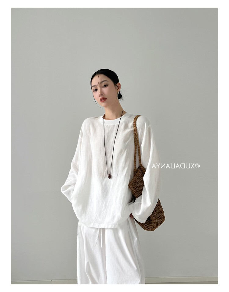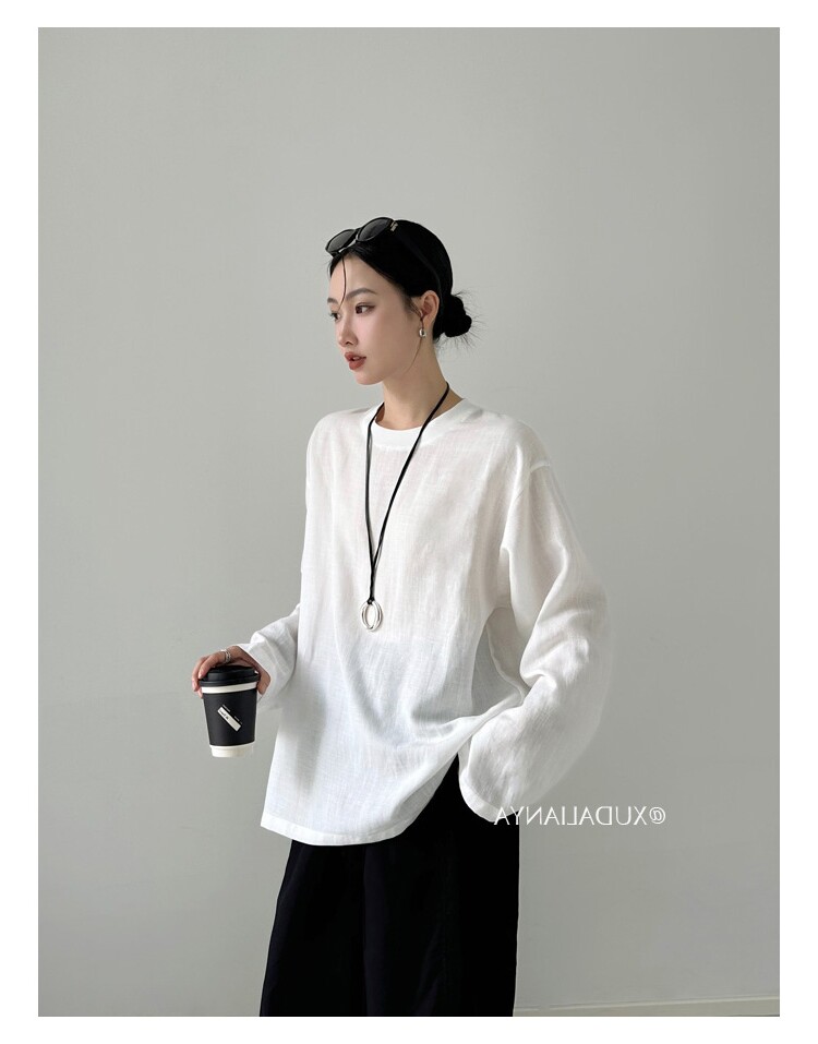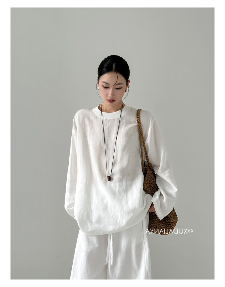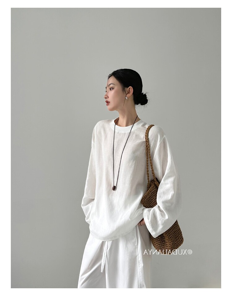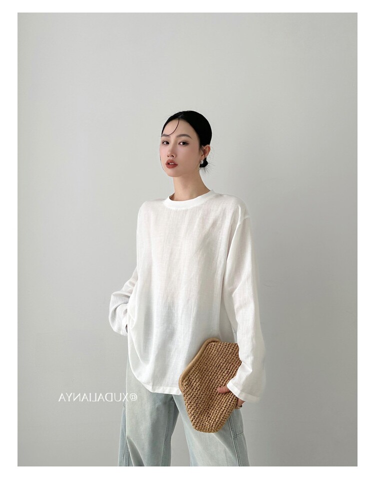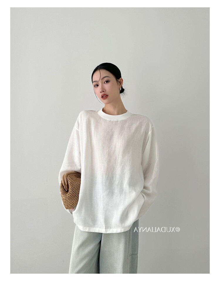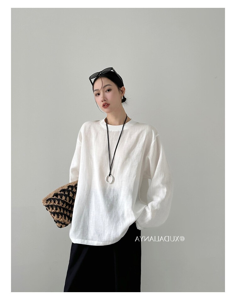 Old money style white linen long-sleeved shirt T-shirt for women early spring thin sun protection blouse loose round neck outer top