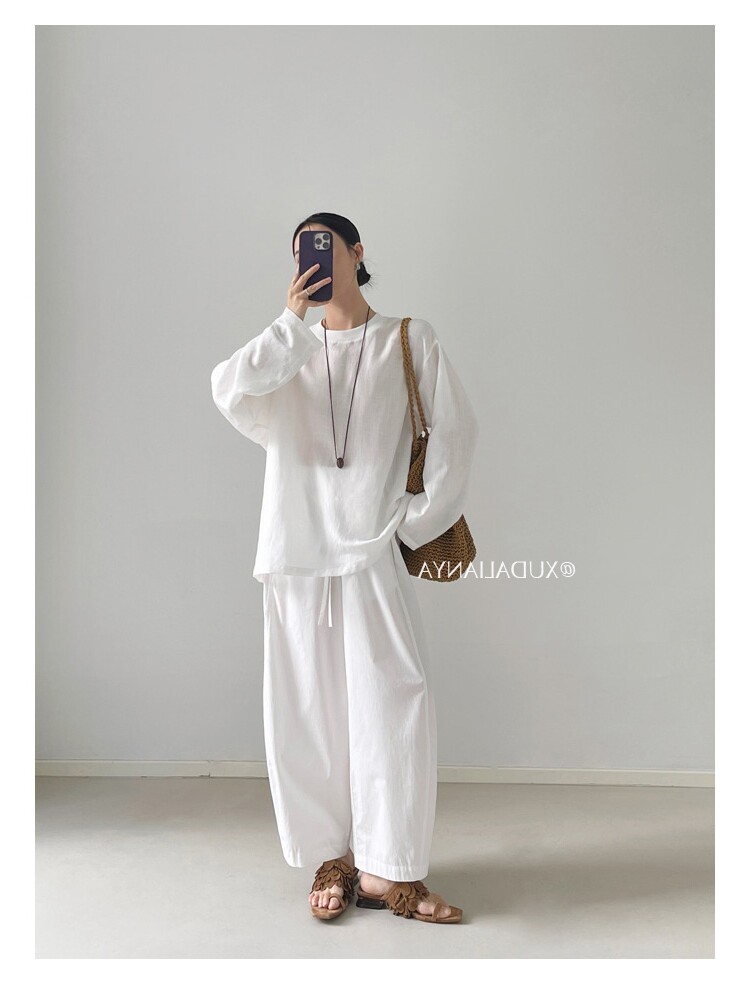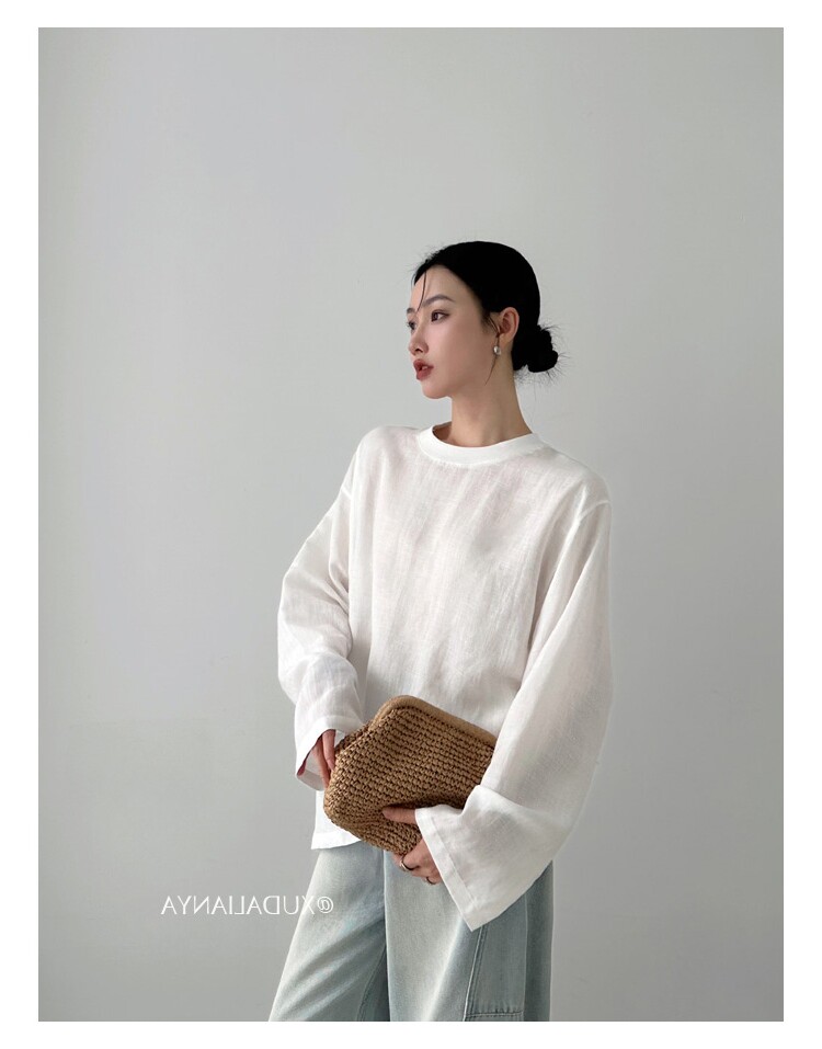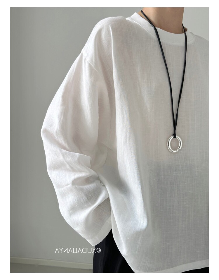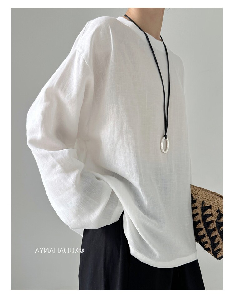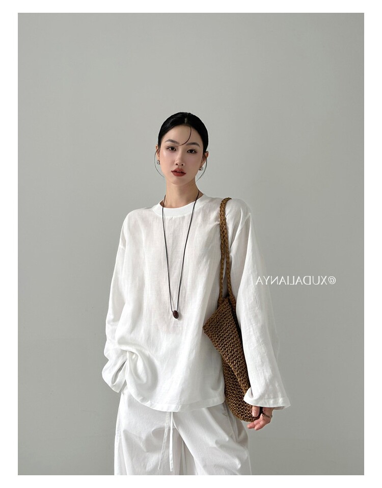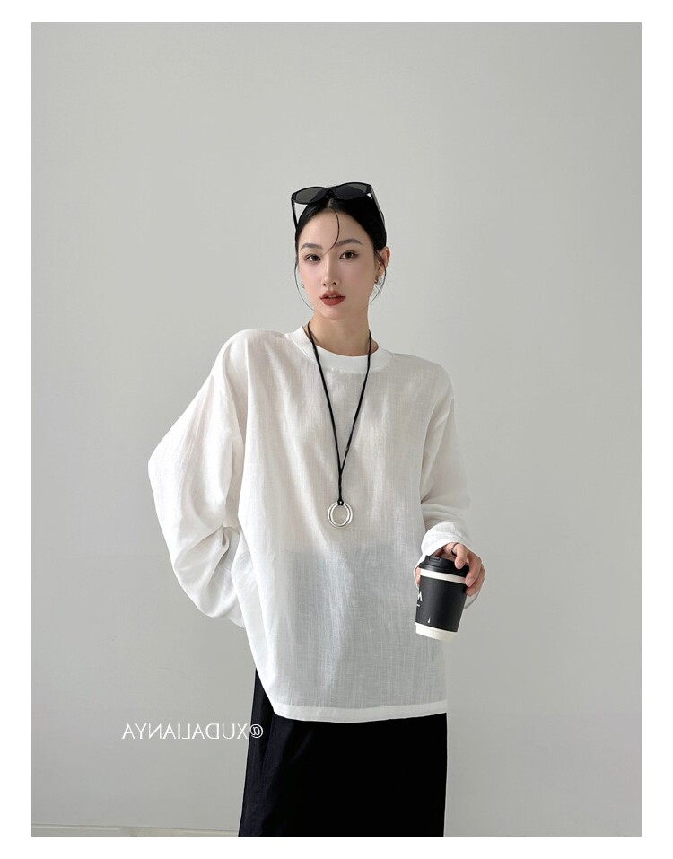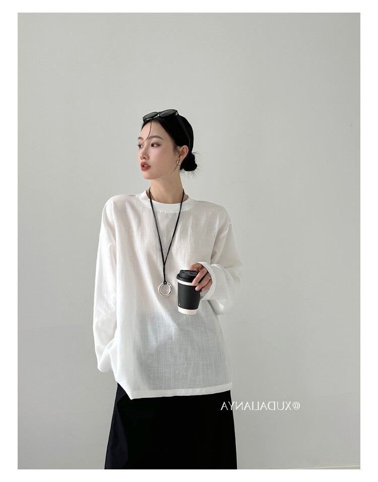 Old money style white linen long-sleeved shirt T-shirt for women early spring thin sun protection blouse loose round neck outer top