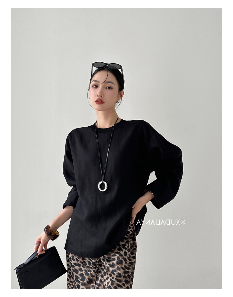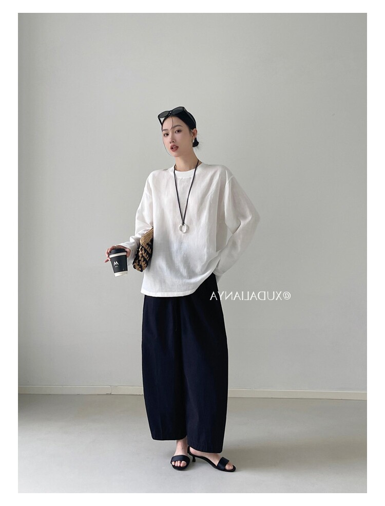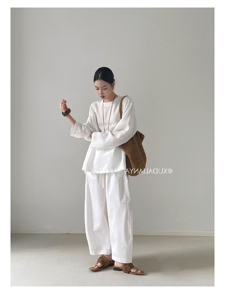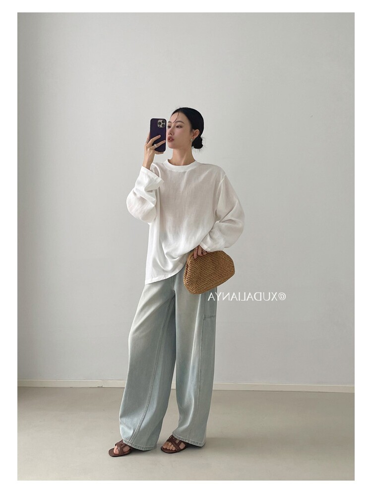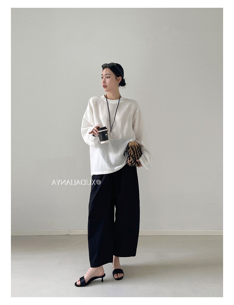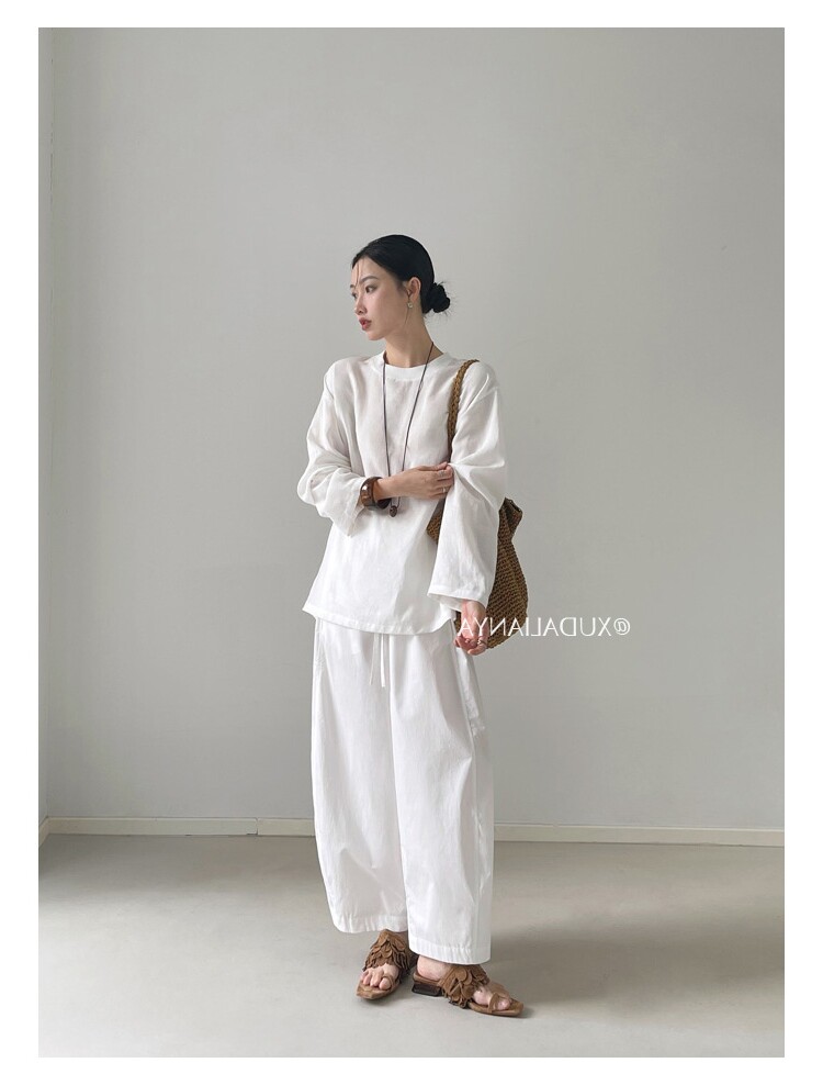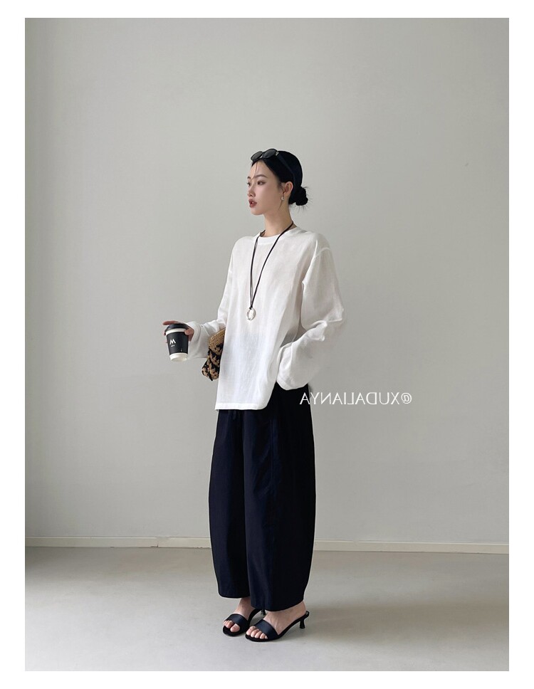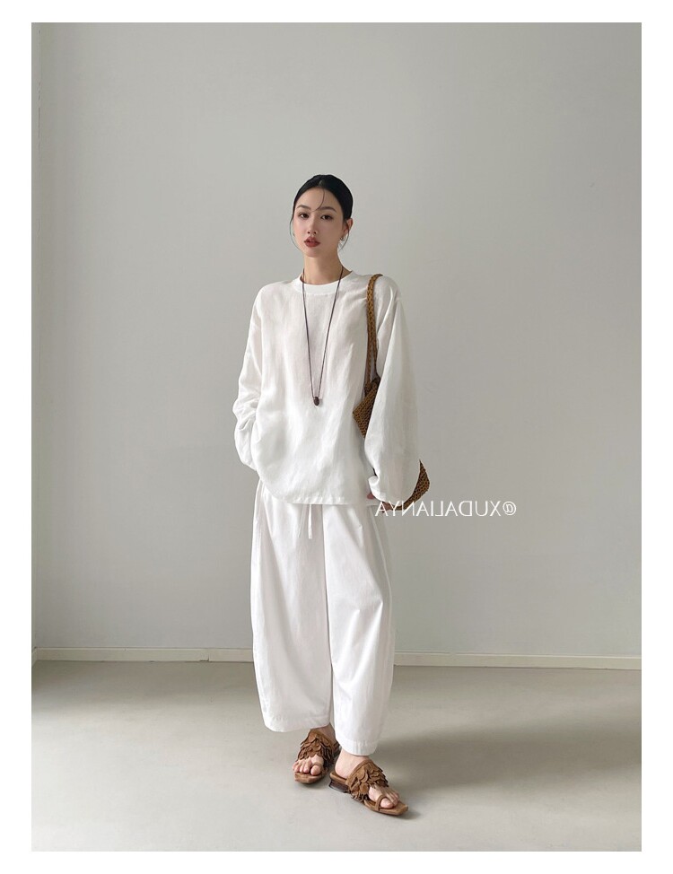 Old money style white linen long-sleeved shirt T-shirt for women early spring thin sun protection blouse loose round neck outer top
